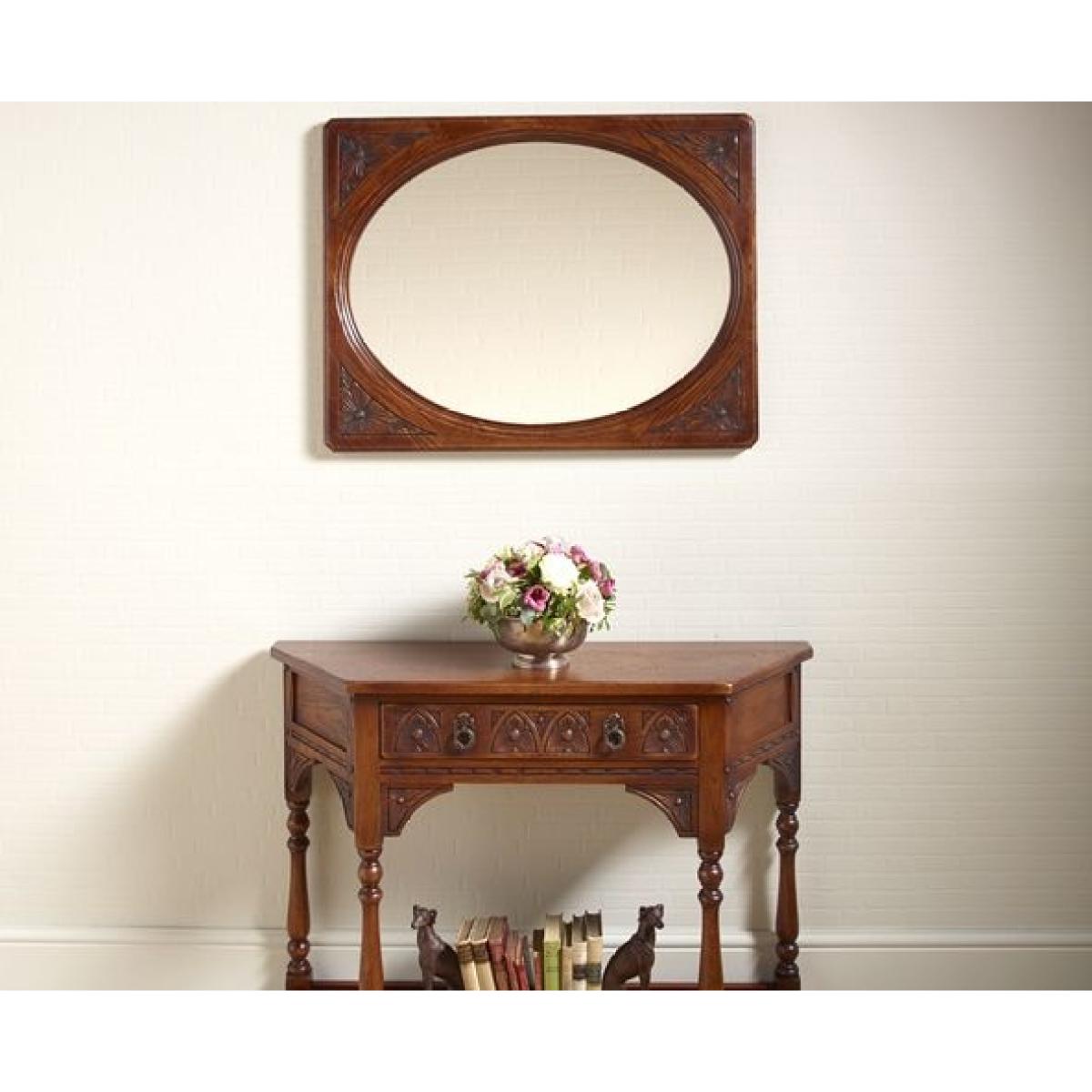 This Mirror is an oval mirror within a rectangular frame which is easily wall hung with a baton (included). The bevelled oval mirror sits within the character oak frame creating a unique, vintage inspired look. Their design team have chosen triangular cactus flowers to give this piece a decorative arts and crafts feel. Traditional in style, authentic in character, and a beautiful choice for any style of home, the Old Charm collection of living room occasional and storage pieces and dining room tables and chairs draws inspiration from England's golden years of furniture design and cabinet making. Using only the finest quality materials, Old Charm pieces showcase turned legs, carved embellishments, secret storage compartments and metal hardware. Classic in style and wonderfully well-crafted, Old Charm makes a return to the living and dining rooms of a bygone era an effortless pleasure. Made in England. Dimensions:W 68 x D 4 x H 88cm. * Please note: The oak used is full of knots and gnarls and we are proud to say that no piece of Old Charm furniture is ever alike! The rustic grade oak is known for its character, fine open grain, durability and ideal for day to day living. The perfect material for showcasing these designs.