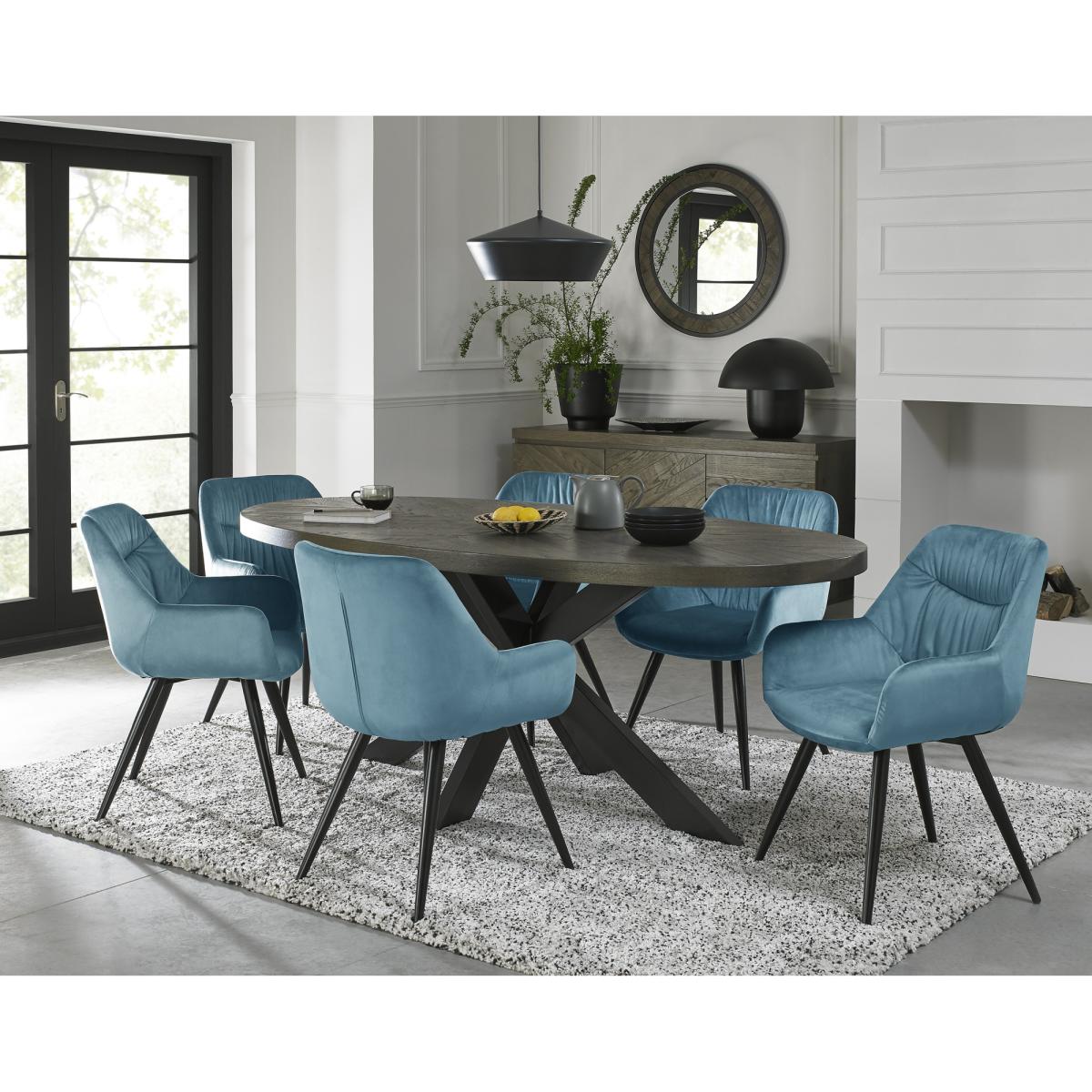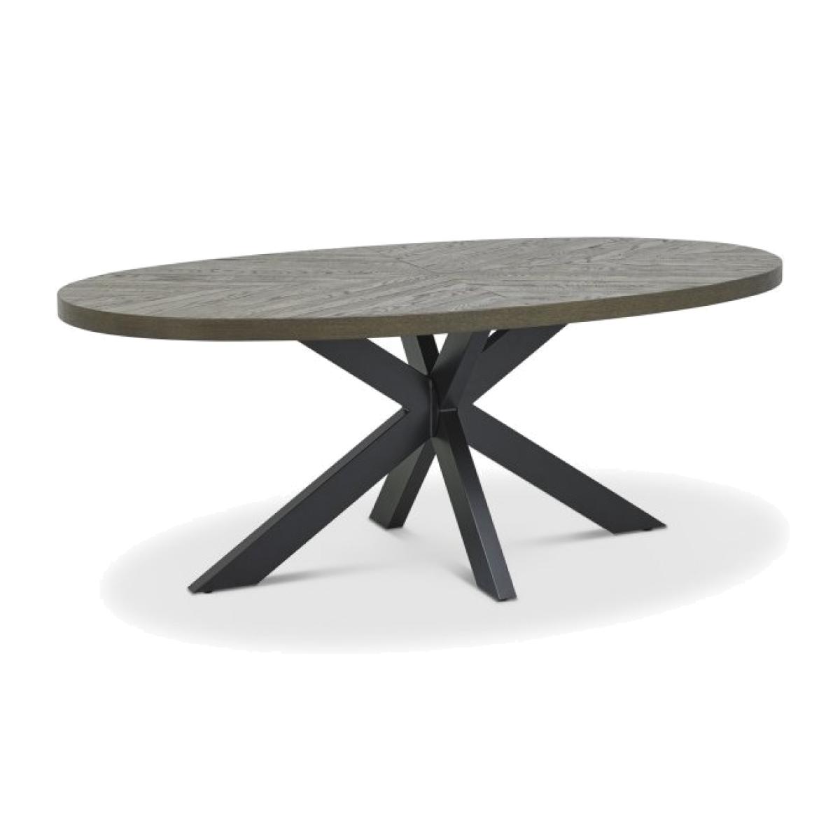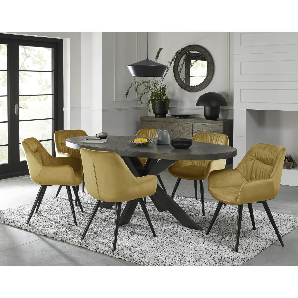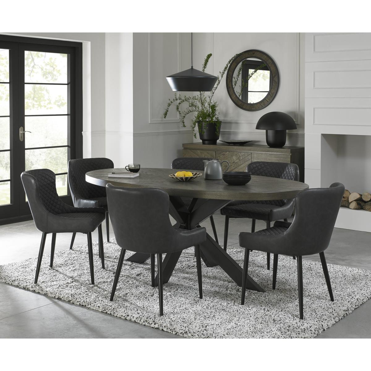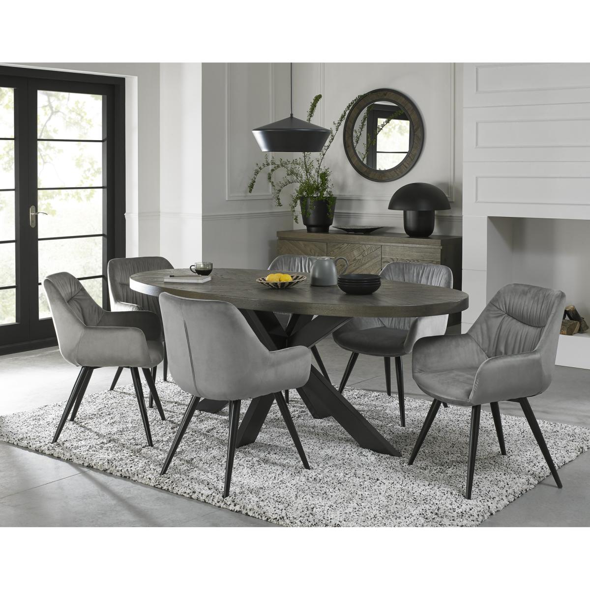 This Winnipeg Fumed Oak 6 Seater Dining Table showcases bold design with a combination of the natural lines of the elliptical dining table, paired with the geometrical & linear shapes of the Winnipeg cabinet range, to create a compelling and slightly eclectic look. The striking saw cut fumed rustic oak marquetry tops on the thick table tops and cabinet doors contrast beautifully against the large welded peppercorn powder coated metal bases, creating a range that successfully blends intricate craftsmanship and indulgently warm tones with an on trend industrial aesthetic. Each of these hand-crafted pattern tops and laminated fumed rustic oak cabinet frames are wire brushed and distressed to give a rustic look and tactile feel, making the most of the beautiful and varied grain of oak. Assembly required. Length: 200cm Width: 105cm Height: 77cm All screens vary in colour reproduction and whilst every effort has been made to display the colour as accurately as possible it is for guidance only.