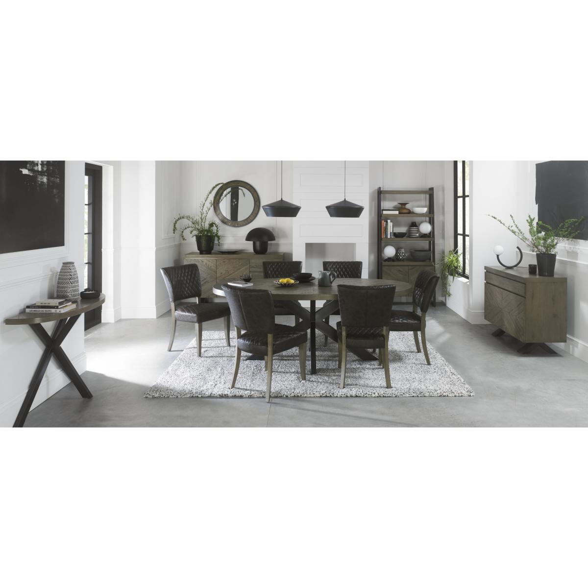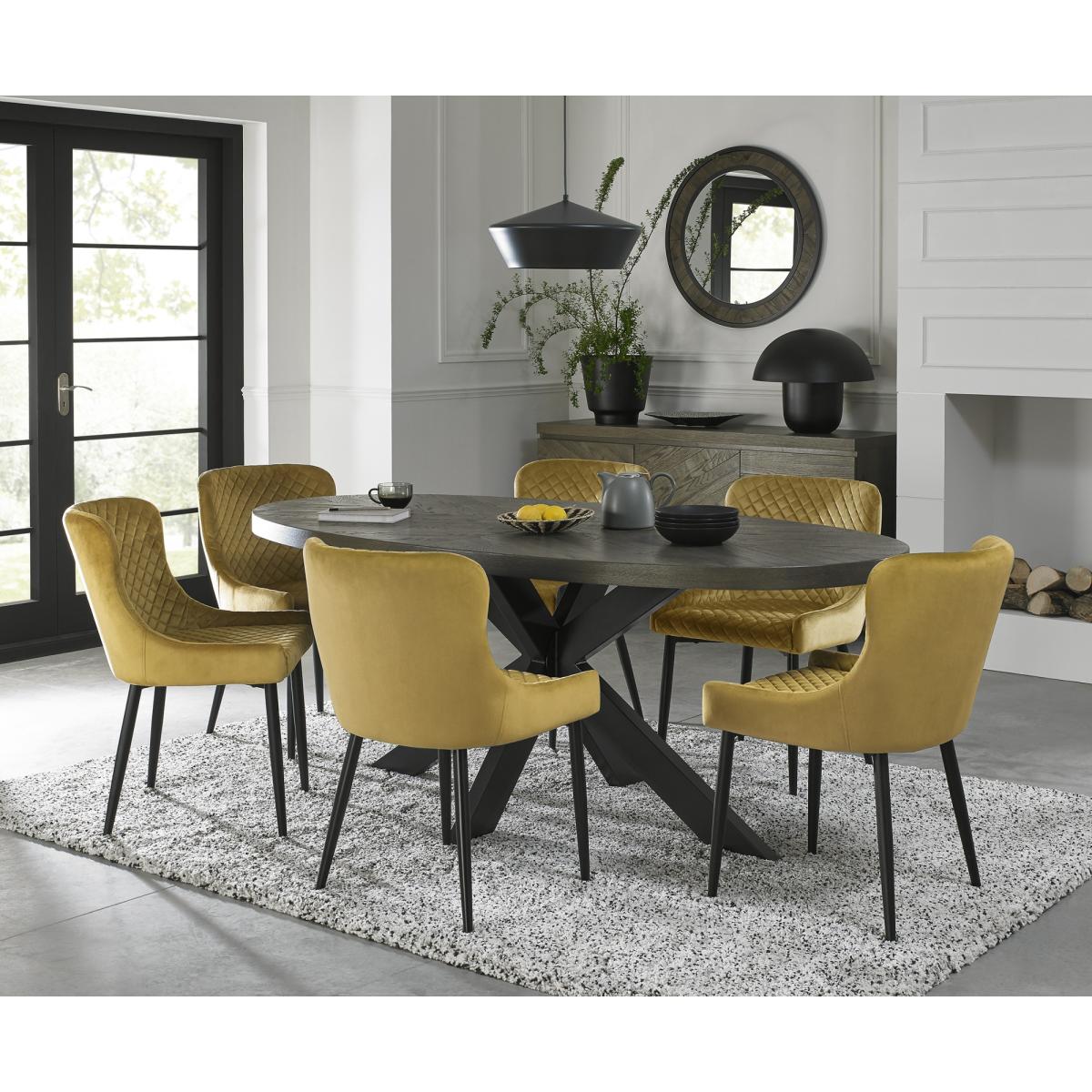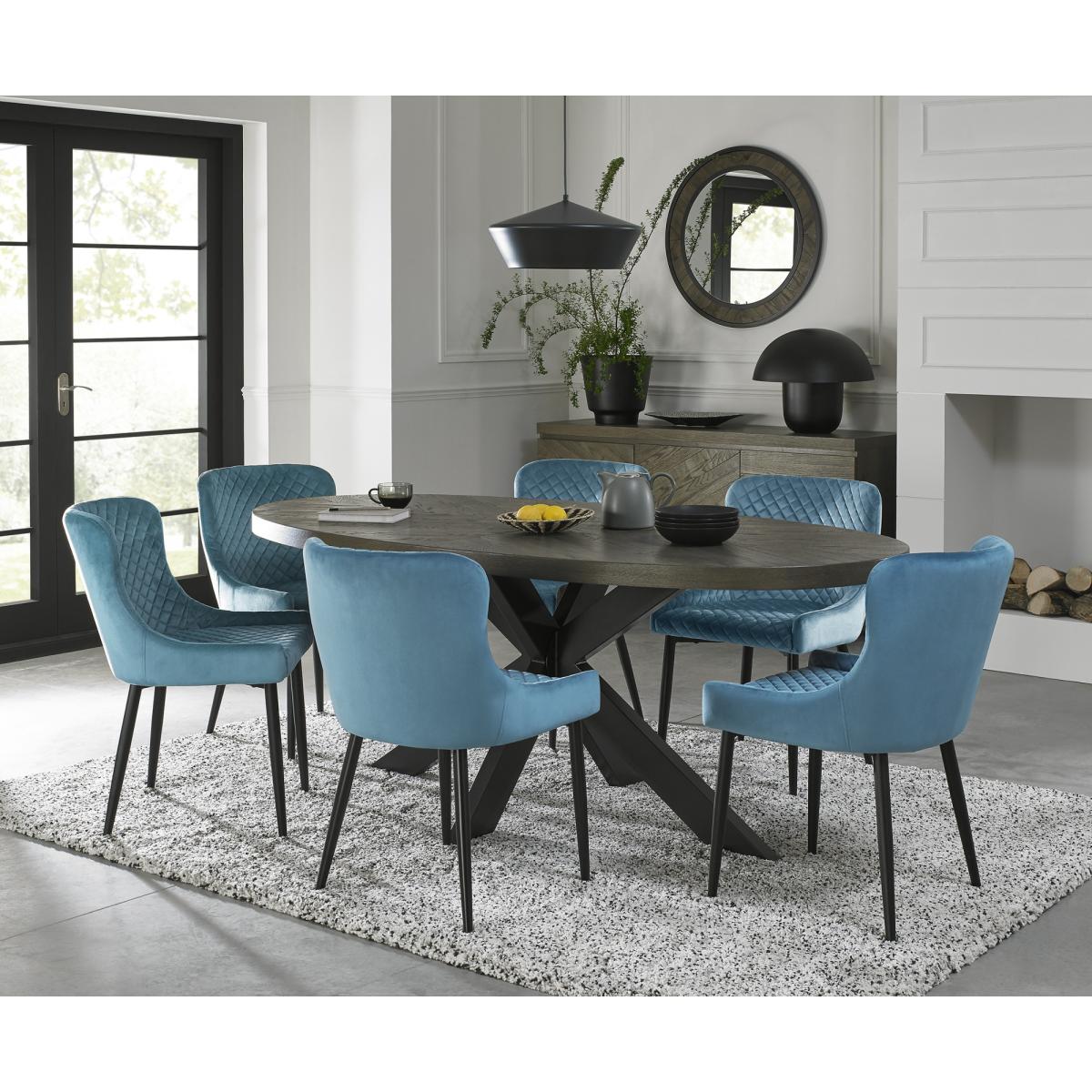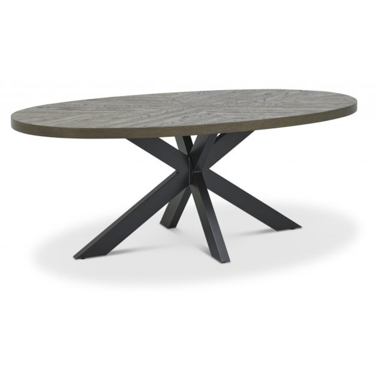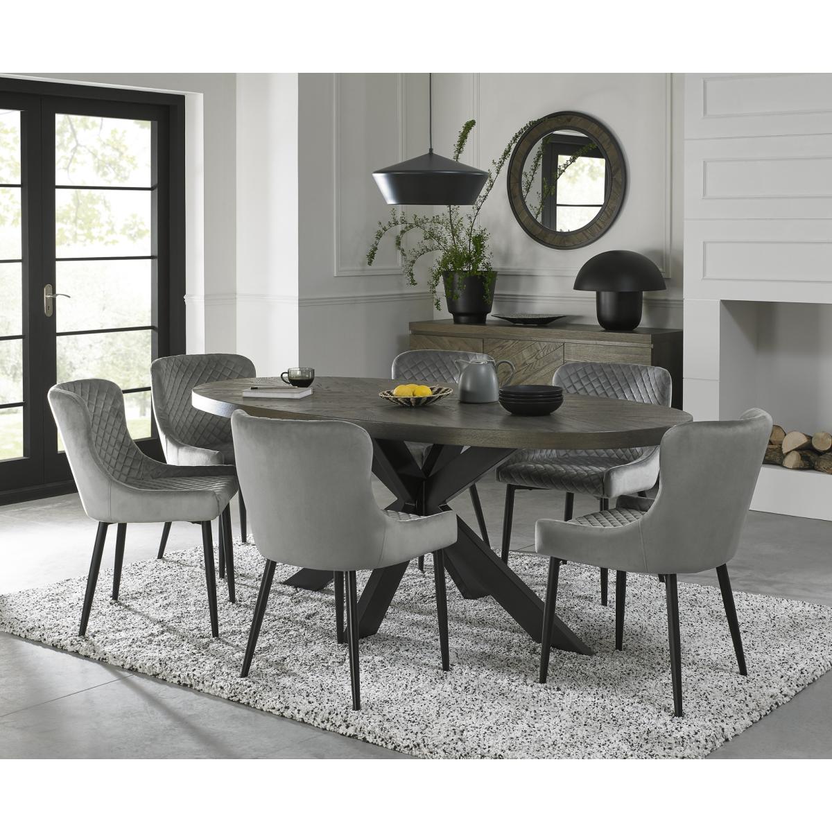 This Winnipeg Fumed Oak 6 Seater Dining Table showcases bold design with a combination of the natural lines of the elliptical dining table, paired with the geometrical & linear shapes of the Winnipeg cabinet range, to create a compelling and slightly eclectic look. The striking saw cut fumed rustic oak marquetry tops on the thick table tops and cabinet doors contrast beautifully against the large welded peppercorn powder coated metal bases, creating a range that successfully blends intricate craftsmanship and indulgently warm tones with an on trend industrial aesthetic. Each of these hand-crafted pattern tops and laminated fumed rustic oak cabinet frames are wire brushed and distressed to give a rustic look and tactile feel, making the most of the beautiful and varied grain of oak. Assembly required. Length: 200cm Width: 105cm Height: 77cm All screens vary in colour reproduction and whilst every effort has been made to display the colour as accurately as possible it is for guidance only.
