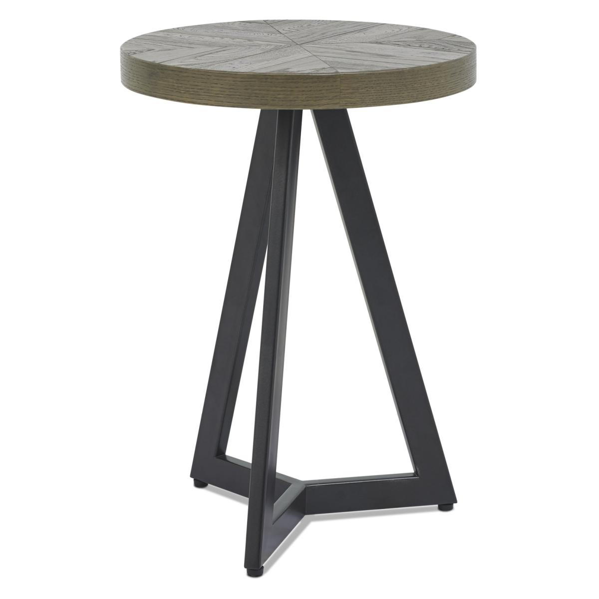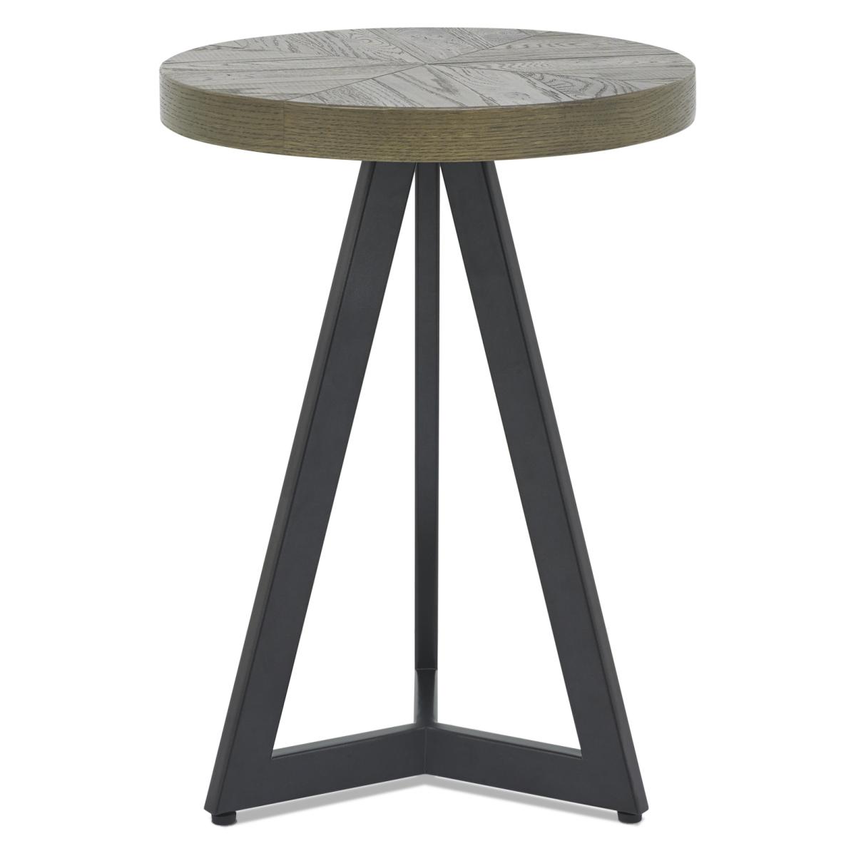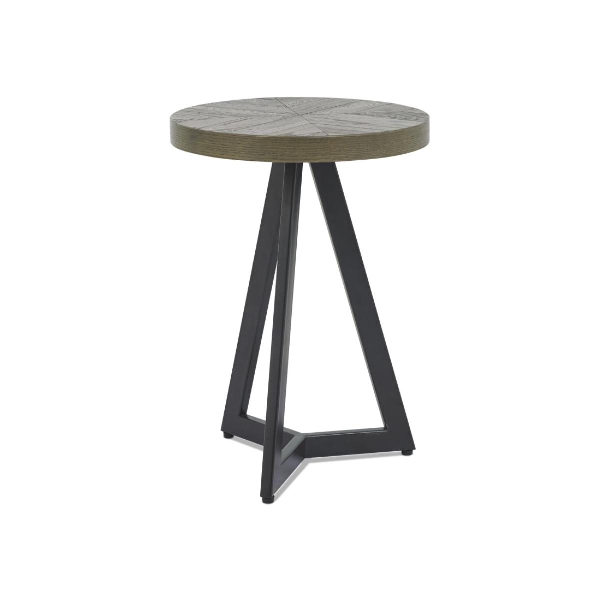 This Winnipeg Fumed Oak Lamp Table showcases bold design with a combination of the natural lines of the elliptical and circular tables, paired with the geometrical & linear shapes of the Winnipeg cabinet range, to create a compelling and slightly eclectic look. The striking saw cut fumed rustic oak marquetry tops on the thick table tops and cabinet doors contrast beautifully against the large welded peppercorn powder coated metal bases, creating a range that successfully blends intricate craftsmanship and indulgently warm tones with an on trend industrial aesthetic. Each of these hand-crafted pattern tops and laminated fumed rustic oak cabinet frames are wire brushed and distressed to give a rustic look and tactile feel, making the most of the beautiful and varied grain of oak.   Assembly required. Height: 59cm Width: 42cm Depth: 42cm