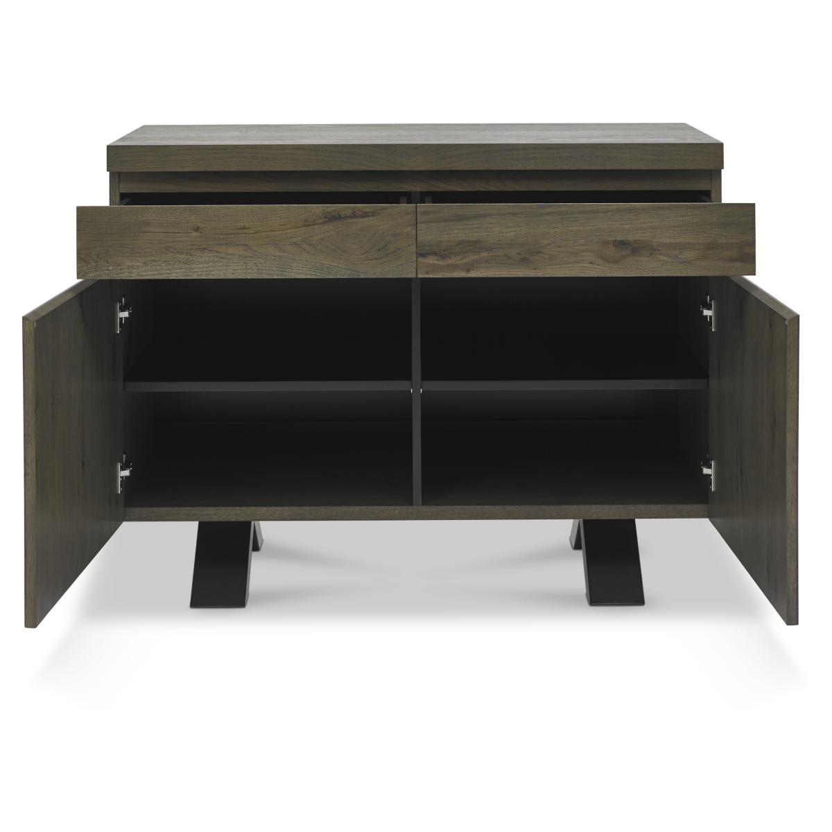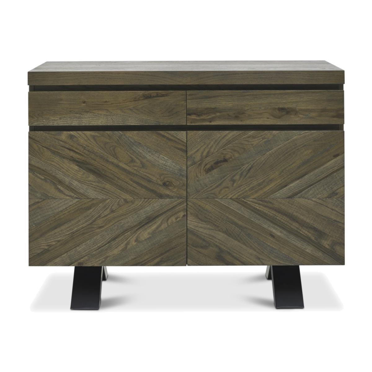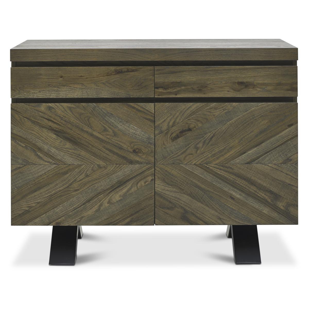This Winnipeg Fumed Oak Narrow Sideboard showcases bold design with a combination the geometrical & linear shapes of the Winnipeg cabinet range, paired with the natural lines of the elliptical and circular tables to create a compelling and slightly eclectic look. The striking saw cut fumed rustic oak marquetry tops on the thick table tops and cabinet doors contrast beautifully against the large welded peppercorn powder coated metal bases, creating a range that successfully blends intricate craftsmanship and indulgently warm tones with an on trend industrial aesthetic. Each of these hand-crafted pattern tops and laminated fumed rustic oak cabinet frames are wire brushed and distressed to give a rustic look and tactile feel, making the most of the beautiful and varied grain of oak. Assembly required. Height: 86cm Width: 110cm Depth: 46cm