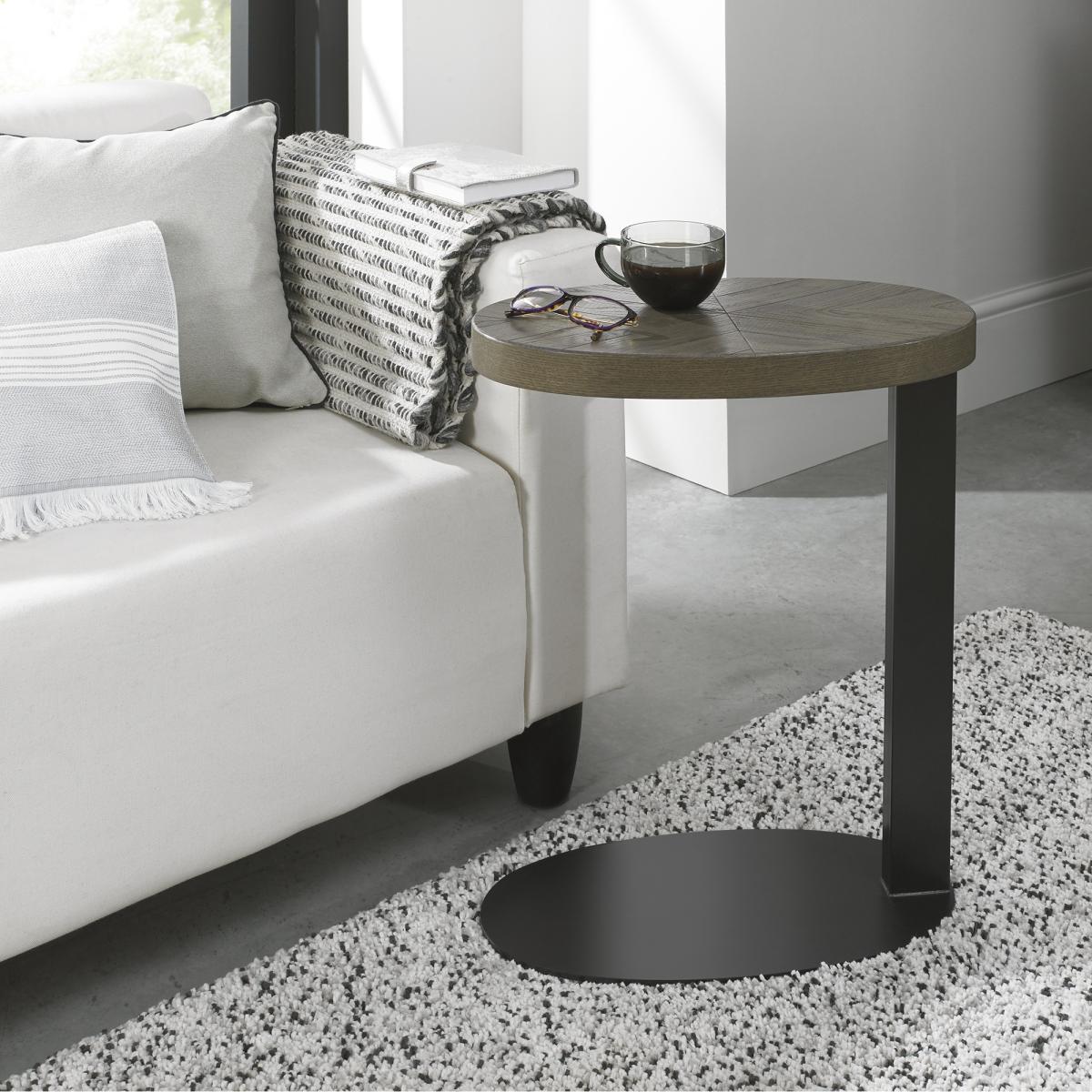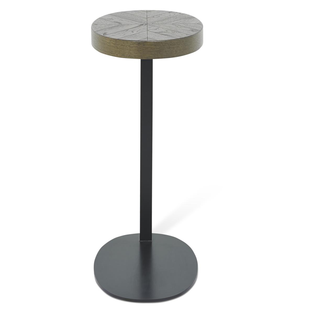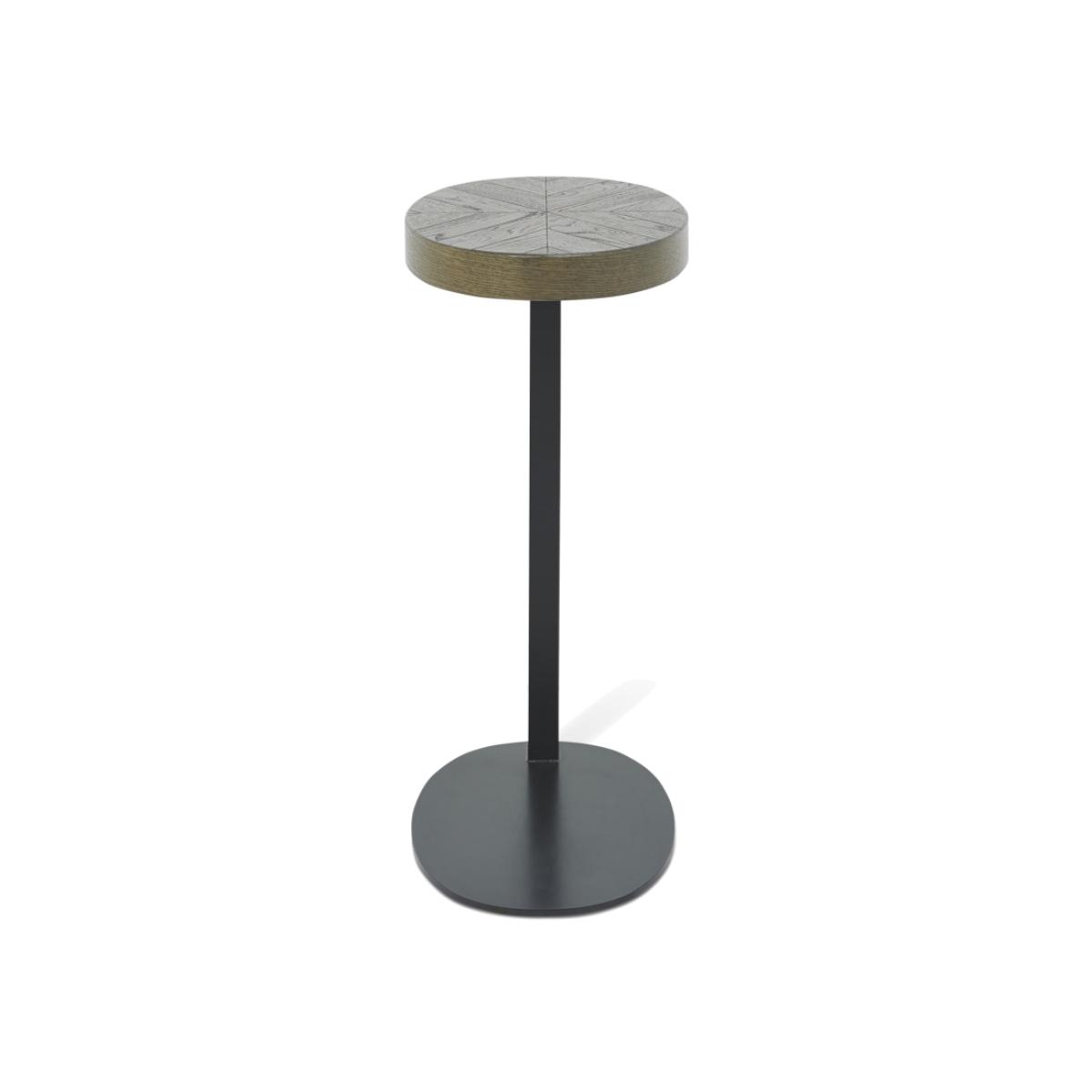 This Winnipeg Fumed Oak Sofa Table showcases bold design with a combination of the natural lines of the elliptical and circular tables, paired with the geometrical & linear shapes of the Winnipeg cabinet range, to create a compelling and slightly eclectic look. The striking saw cut fumed rustic oak marquetry tops on the thick table tops and cabinet doors contrast beautifully against the large welded peppercorn powder coated metal bases, creating a range that successfully blends intricate craftsmanship and indulgently warm tones with an on trend industrial aesthetic. Each of these hand-crafted pattern tops and laminated fumed rustic oak cabinet frames are wire brushed and distressed to give a rustic look and tactile feel, making the most of the beautiful and varied grain of oak.  Assembly required. Height: 59cm Width: 48cm Depth: 26cm