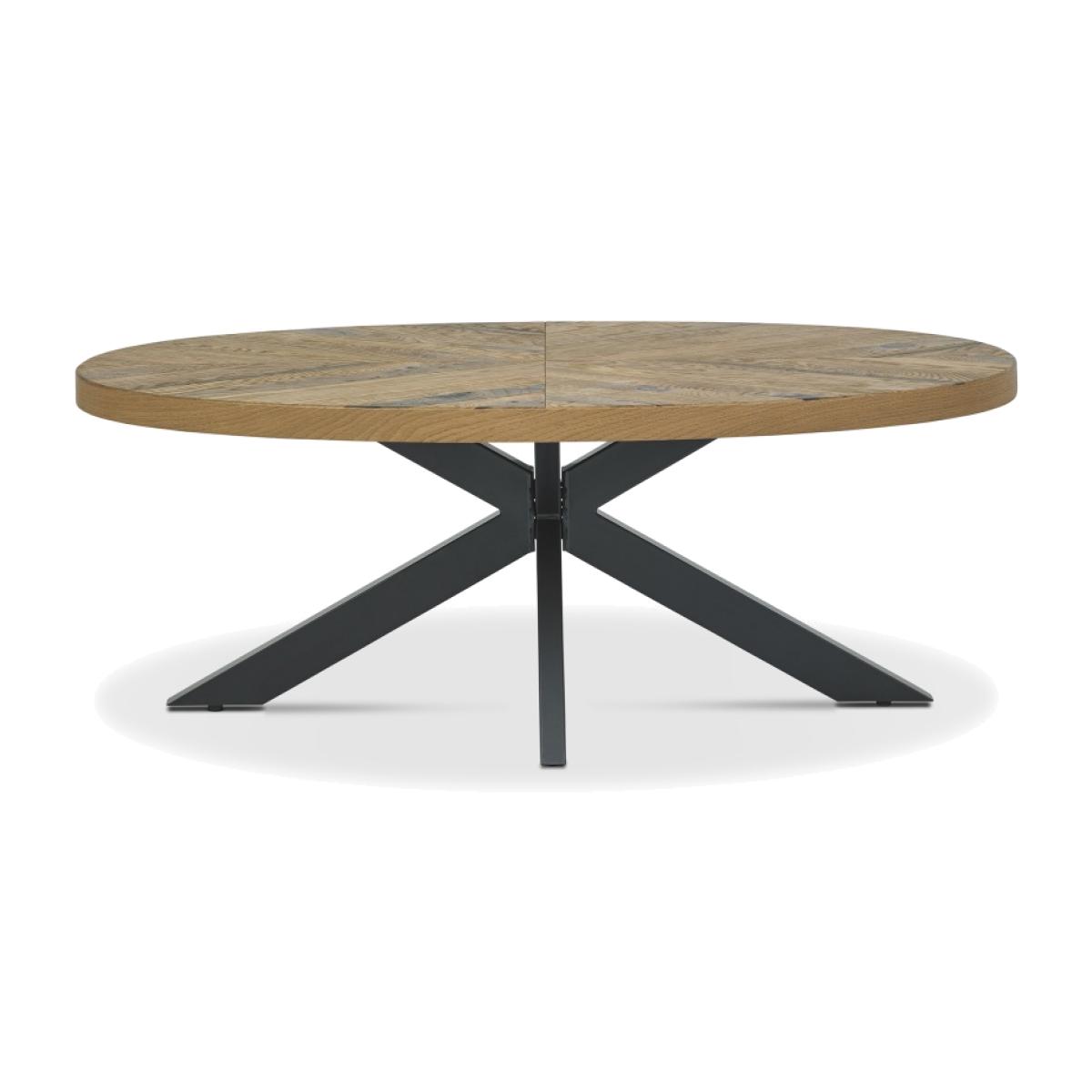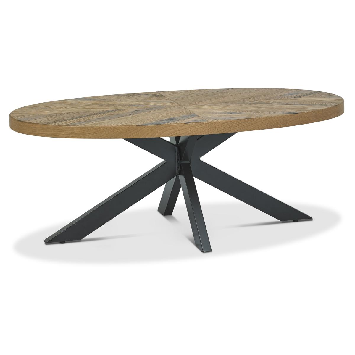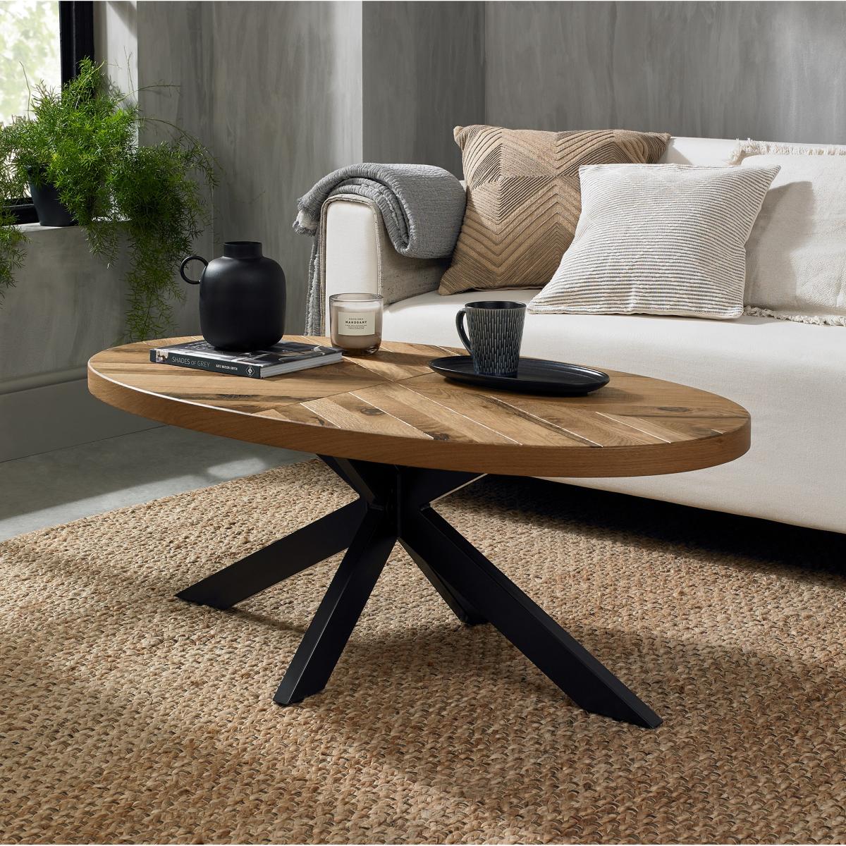 The Winnipeg Rustic Oak Coffee Table showcases bold design with a combination of the natural lines of the elliptical and circular tables, paired with the geometrical & linear shapes of the cabinet, to create a compelling and slightly eclectic look. The striking saw cut rustic oak marquetry tops on the thick table tops and cabinet doors contrast beautifully against the large welded peppercorn powder coated metal bases, creating a range that successfully blends intricate craftsmanship and indulgently warm tones with an on trend industrial aesthetic. Each of these hand-crafted pattern tops and laminated rustic oak cabinet frames are wire brushed and distressed to give a rustic look and tactile feel, making the most of the beautiful and varied grain of oak. Assembly required. Product Type: Coffee Tables Finish: Rustic Oak Guarantee: Manufacture 2 Years Country of Manufacture: Vietnam Product Depth: 61cm Product Width: 114cm Product Height: 43cm