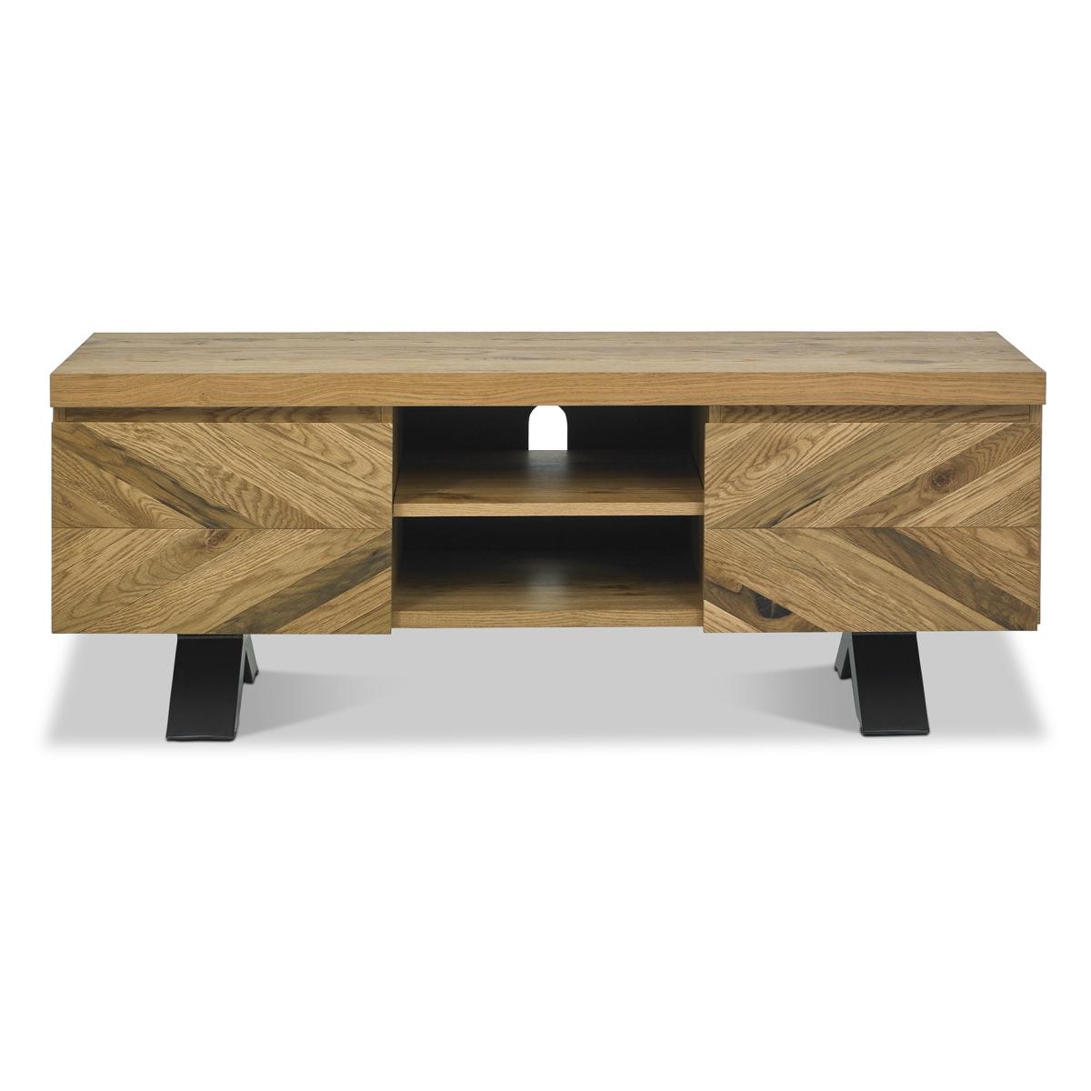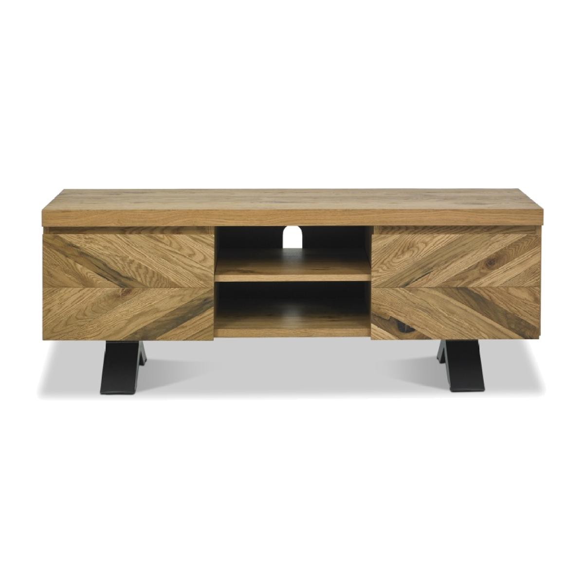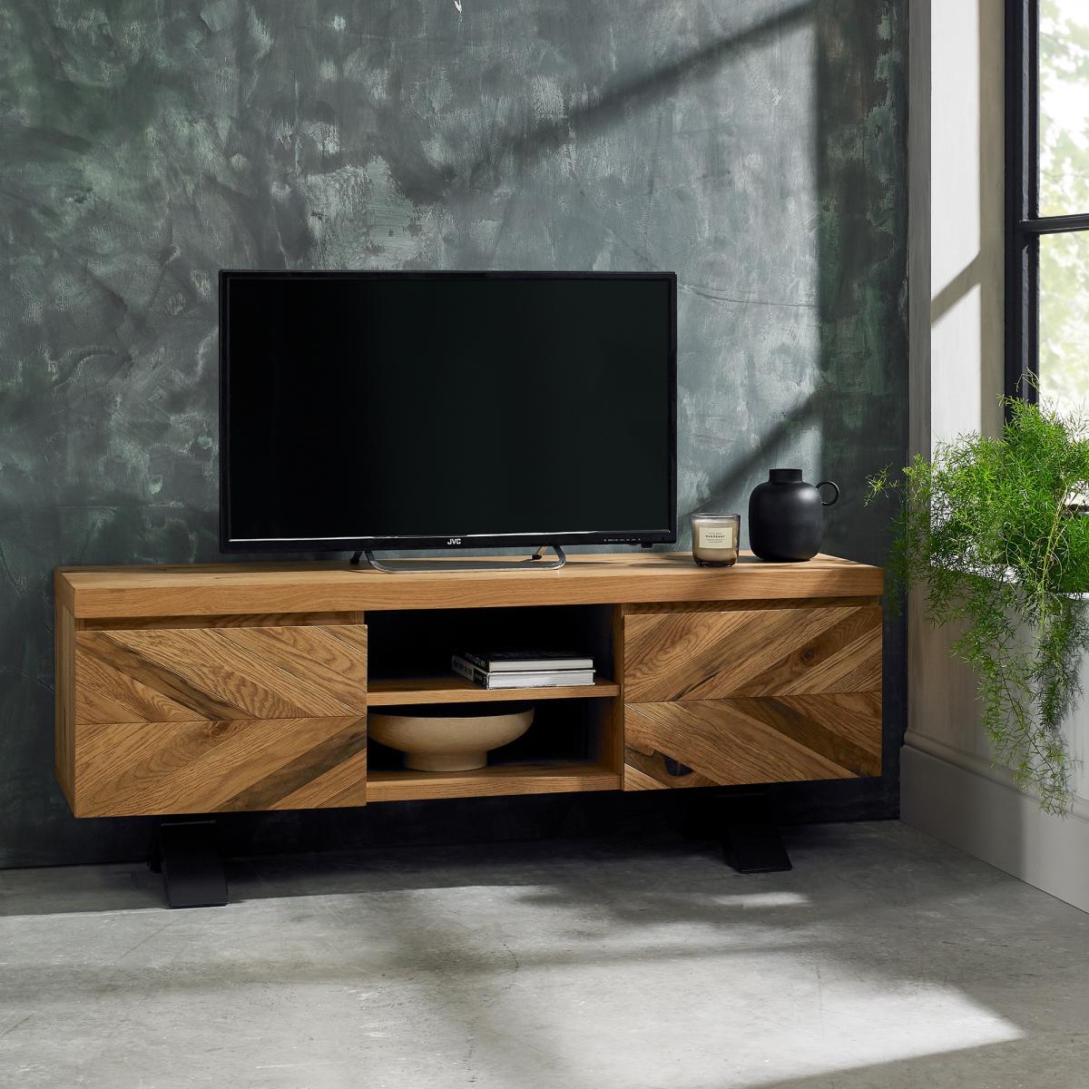 The Winnipeg Rustic Oak Entertainment Unit showcases bold design with a combination of the geometrical & linear shapes of the cabinet, with the natural lines of the elliptical and circular tables, to create a compelling and slightly eclectic look. The striking saw cut rustic oak marquetry tops on the thick table tops and cabinet doors contrast beautifully against the large welded peppercorn powder coated metal bases, creating a range that successfully blends intricate craftsmanship and indulgently warm tones with an on trend industrial aesthetic. Each of these hand-crafted pattern tops and laminated rustic oak cabinet frames are wire brushed and distressed to give a rustic look and tactile feel, making the most of the beautiful and varied grain of oak. Generously proportioned dining chairs, styled with diamond stitch upholstery in a choice of luxurious fabric and feature plush padded seats, gently flared backs and elegantly tapering legs, imbuing comfort and indulgence. Assembly required. Height: 55cm Width: 144cm Depth: 41cm
