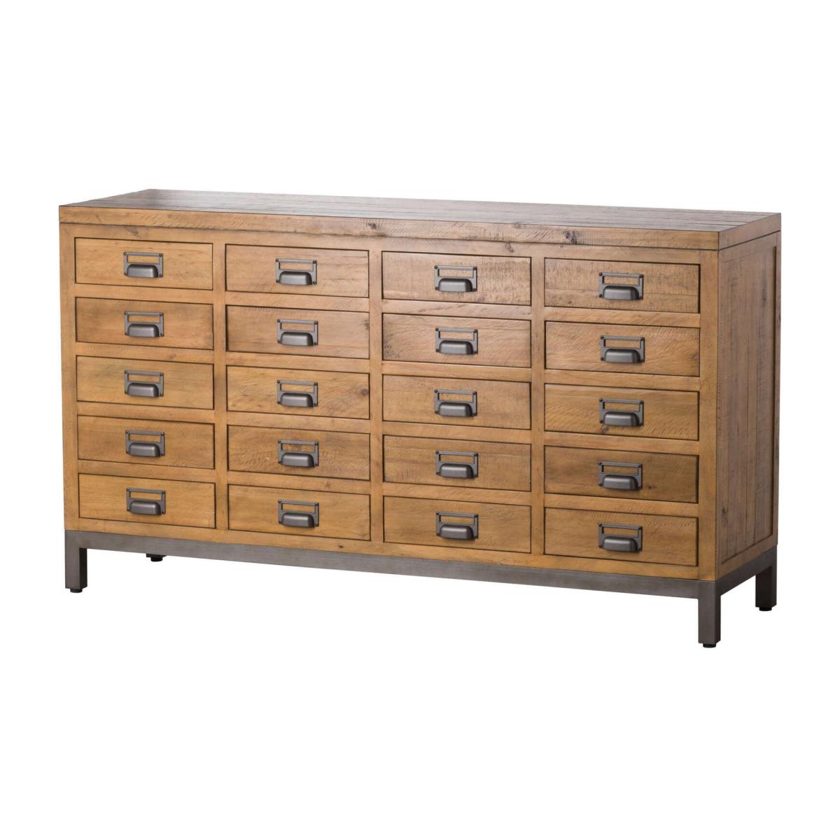 The combination of raw and organic textures of a solid pine body and cast iron accents has been used in the Draftsman Collection. This is the Draftsman Collection 20 Drawer Merchant Chest which is 90cm high, 160cm wide and 45cm deep with 20 drawers making it a great storage addition to any interior whilst being timelessly handsome too. The combination of wood and gun metal grey label handles is a key look for on trend interiors which unites function and understated styling to create timeless pieces with a nonchalant design attitude. In keeping with the casual style, the pine body features two tone colouration while the gun metal grey legs, feet and handles bolden the rustic and industrial feel. Built to last for years to come, this collection would be a welcome addition in any interior.