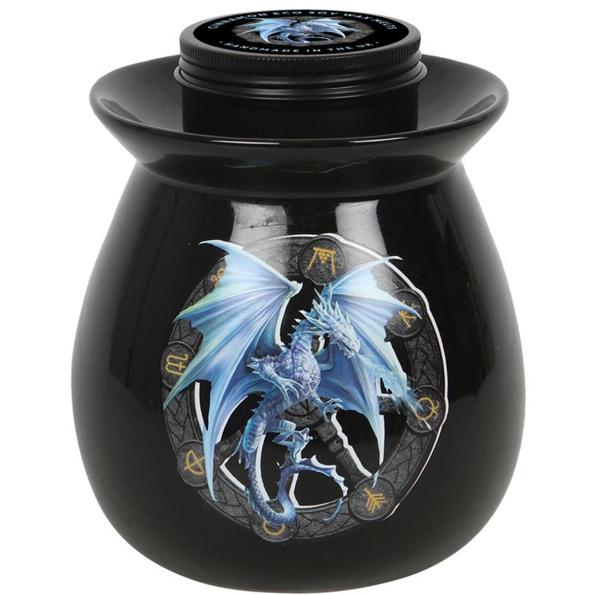 Ceramic oil burner includes scented wax melts in the gift set. Features dragon designs printed in high quality colour. Part of the 'Dragons of the Sabbat' artwork series by fantasy artist Anne Stokes. Gift Boxed.