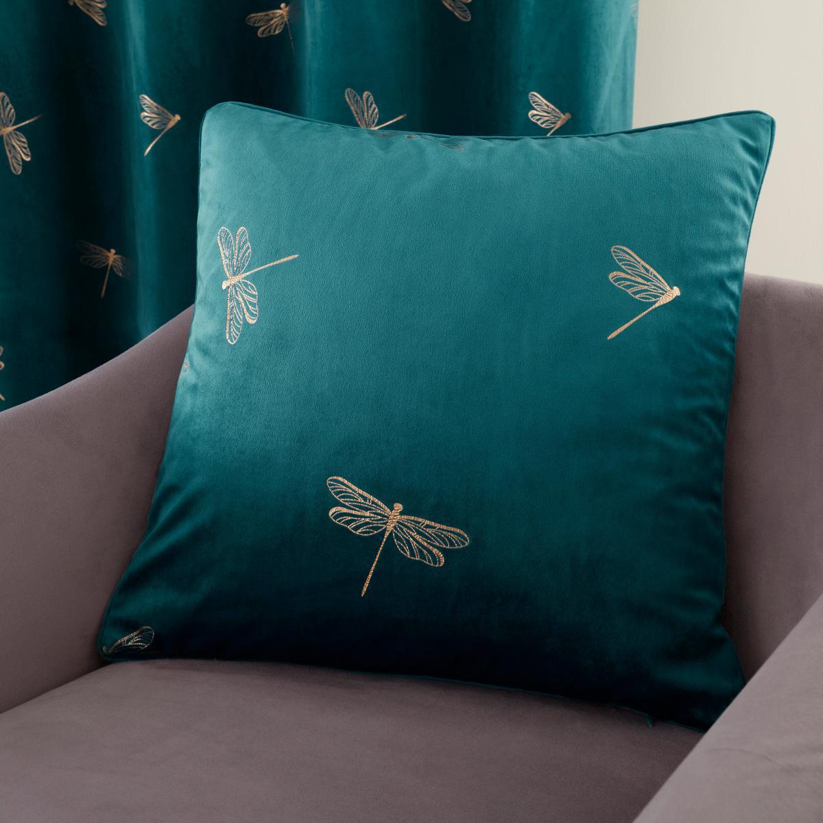 Delicate gold oil dragonflies cascade across the face fabric of the Dragonfly Foil Charm Blue Eyelet Curtains. Crafted using a luxurious velvet style fabric, these curtains are lined with a 100% recycled polyester lining and complete with durable brushed steel eyelet rings. Available in a selection of multiple widths and drops, there is also a coordinating cushion available.