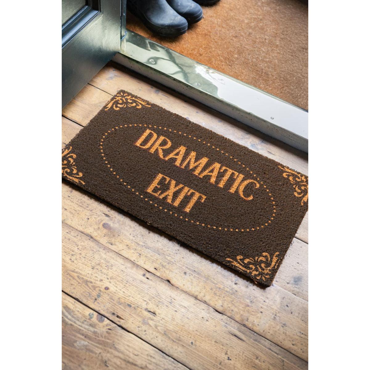 <!--td --> Make every departure a memorable one with our Dramatic Exit Doormat, a combination of wit and style. Crafted in a rich brown with lighter tonal accents, it features a playful message that reads “Dramatic Exit” in the centre. It's certain to bring a smile to your guest's faces as they make their exit (especially if they're the type to favour a theatrical flounce). Complementing the text in the middle, each corner of the mat is adorned with vintage-style patterns, adding a sophisticated touch to the whole design. It’s the perfect blend of functionality, elegance and humour. Make every exit a dramatic one with this beautifully crafted doormat. - Dramatic Exit Brown Doormat - Measures: W60cm x H40cm - Material:Coconut Matting