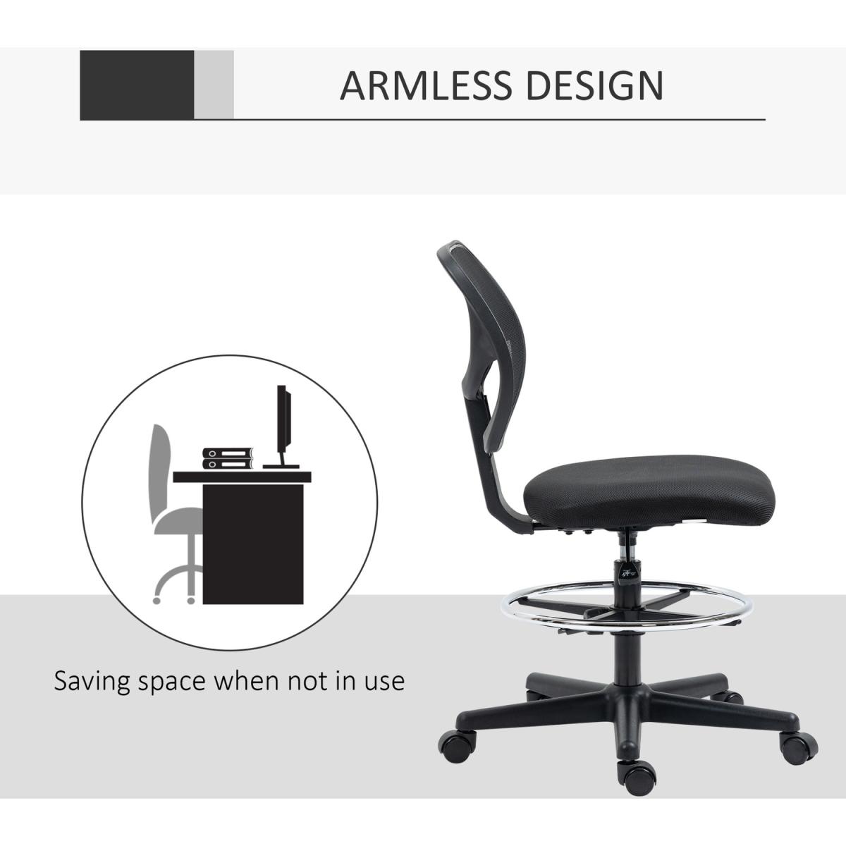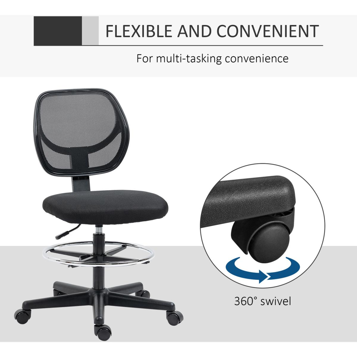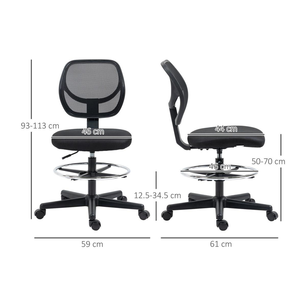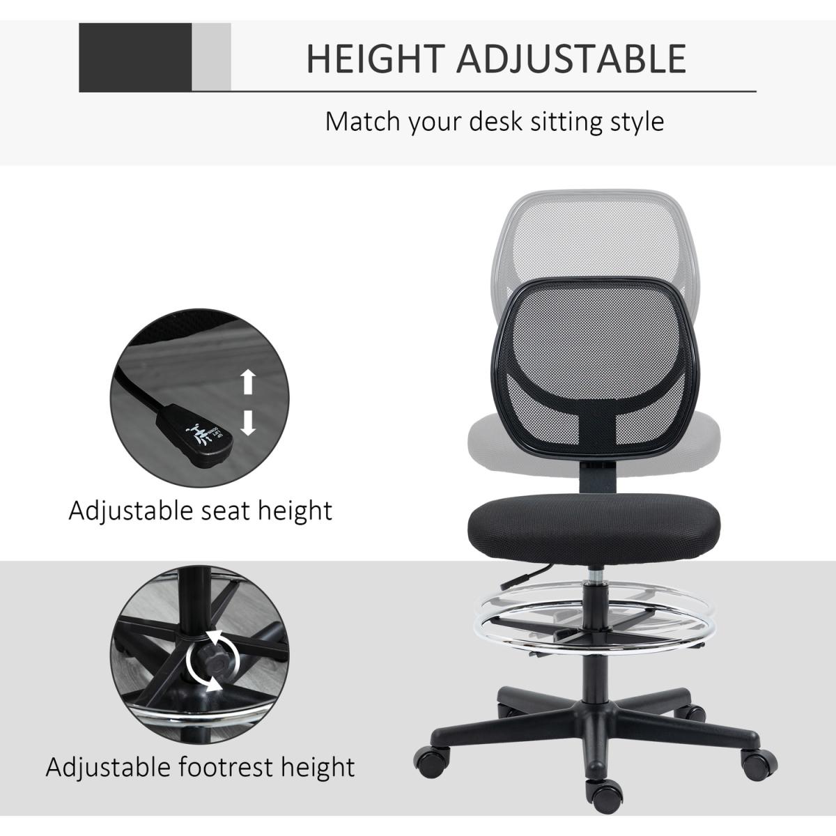 This mesh office chair, from Vinseto, comes in a draughtsman design - ideal for working at higher levels. Adjust the height between 50-70cm easily, thanks to the under-seat lever. The padded seat, curved mesh back and five-wheeled base make it a pleasure to sit on and use, supporting you as you work. Adjust the bottom bar to rest your lower body comfortably. Tall surfaces? No problem!