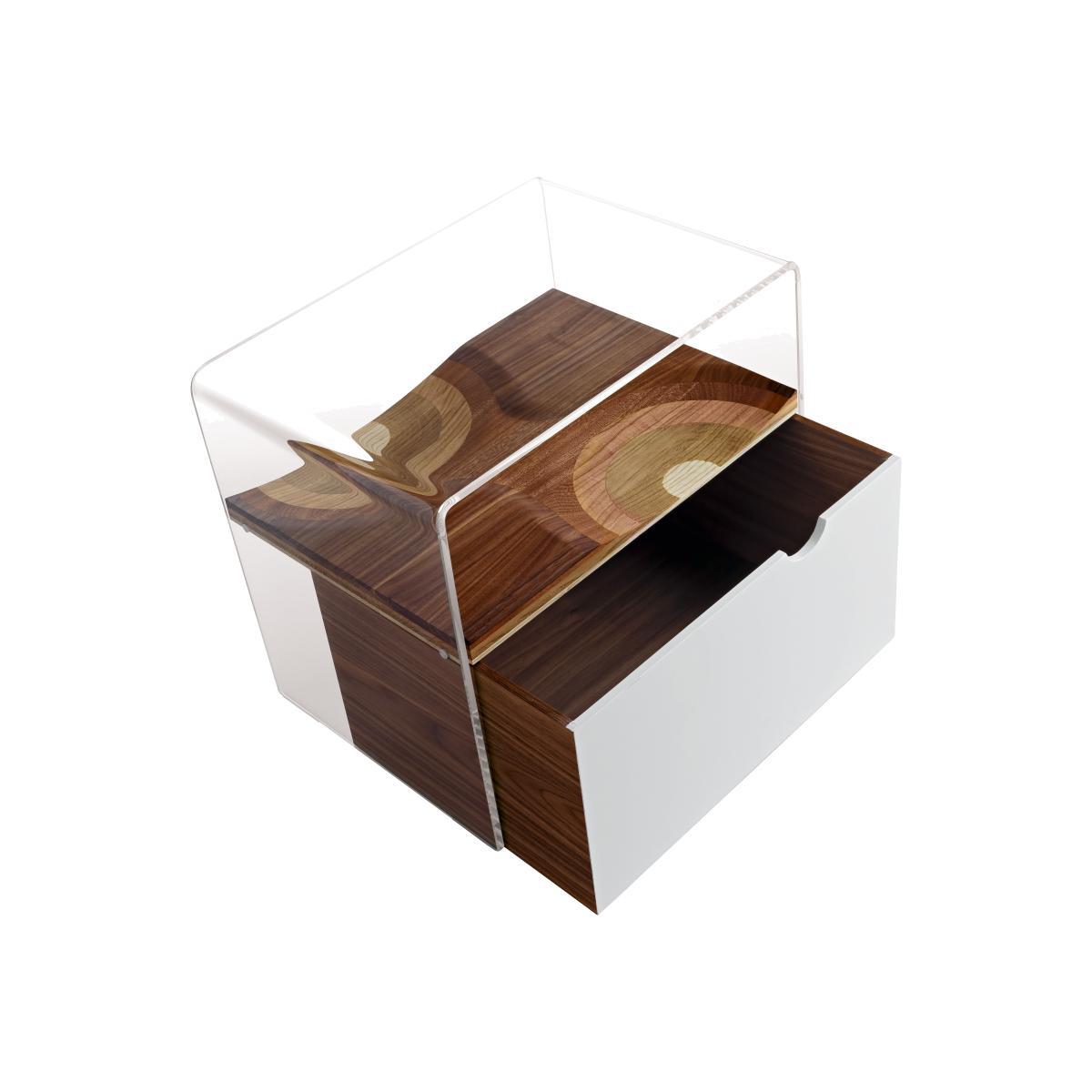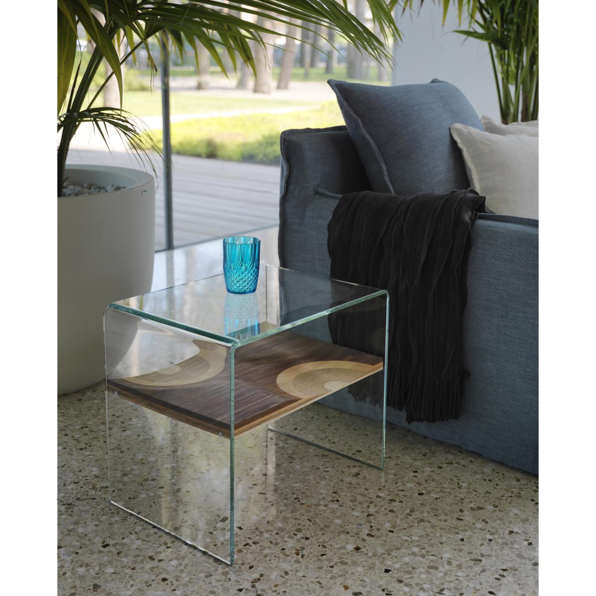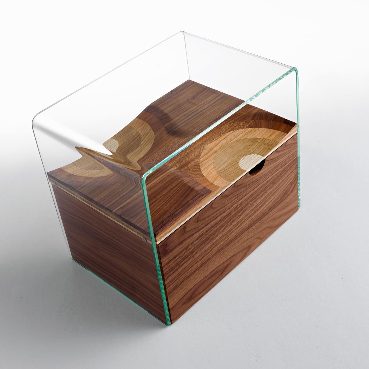 Frame in extra clear glass. Fixed shel «Ripples». Drawer in walnut veneer with one white lacquered front. A slice of Ripple, the celebrity bench by Toyo Ito that won the Compasso d'Oro award in 2004, is used to make this new product from Horm. As a tribute to the concept of Toyo Ito, a dome in extraclear curved tempered glass surrounds Ripples and protects it. A chance for Ripples lovers to have a miniature Ripples where the Bench cannot fit. Bifronte is completed by a drawer on castors that has inspired the name (Bifronte means double face as the mythological Janus). A Drawer with two fronts, one in walnut veneer and the opposite in white lacquer that can play with different chromatic environments.