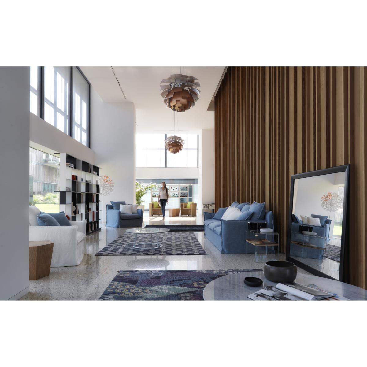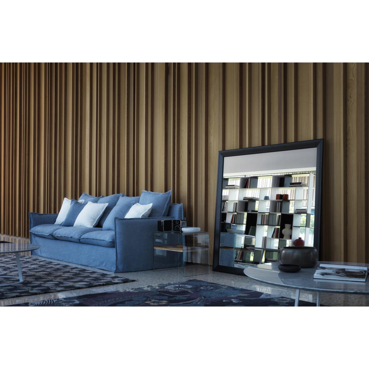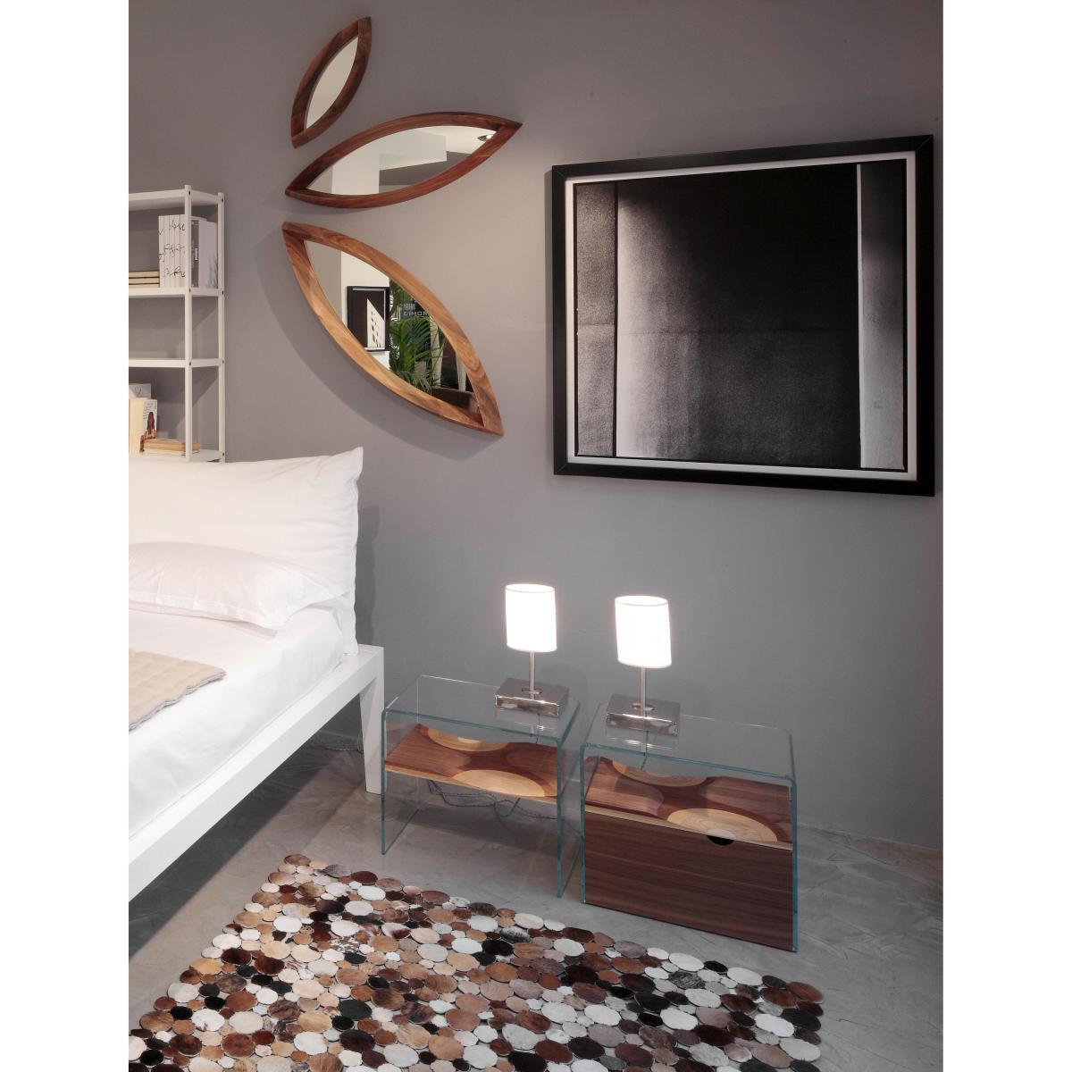 Frame in extra clear glass. Fixed shel «Ripples». Drawer in walnut veneer with one white lacquered front. A slice of Ripple, the celebrity bench by Toyo Ito that won the Compasso d'Oro award in 2004, is used to make this new product from Horm. As a tribute to the concept of Toyo Ito, a dome in extraclear curved tempered glass surrounds Ripples and protects it. A chance for Ripples lovers to have a miniature Ripples where the Bench cannot fit. Bifronte is completed by a drawer on castors that has inspired the name (Bifronte means double face as the mythological Janus). A Drawer with two fronts, one in walnut veneer and the opposite in white lacquer that can play with different chromatic environments.