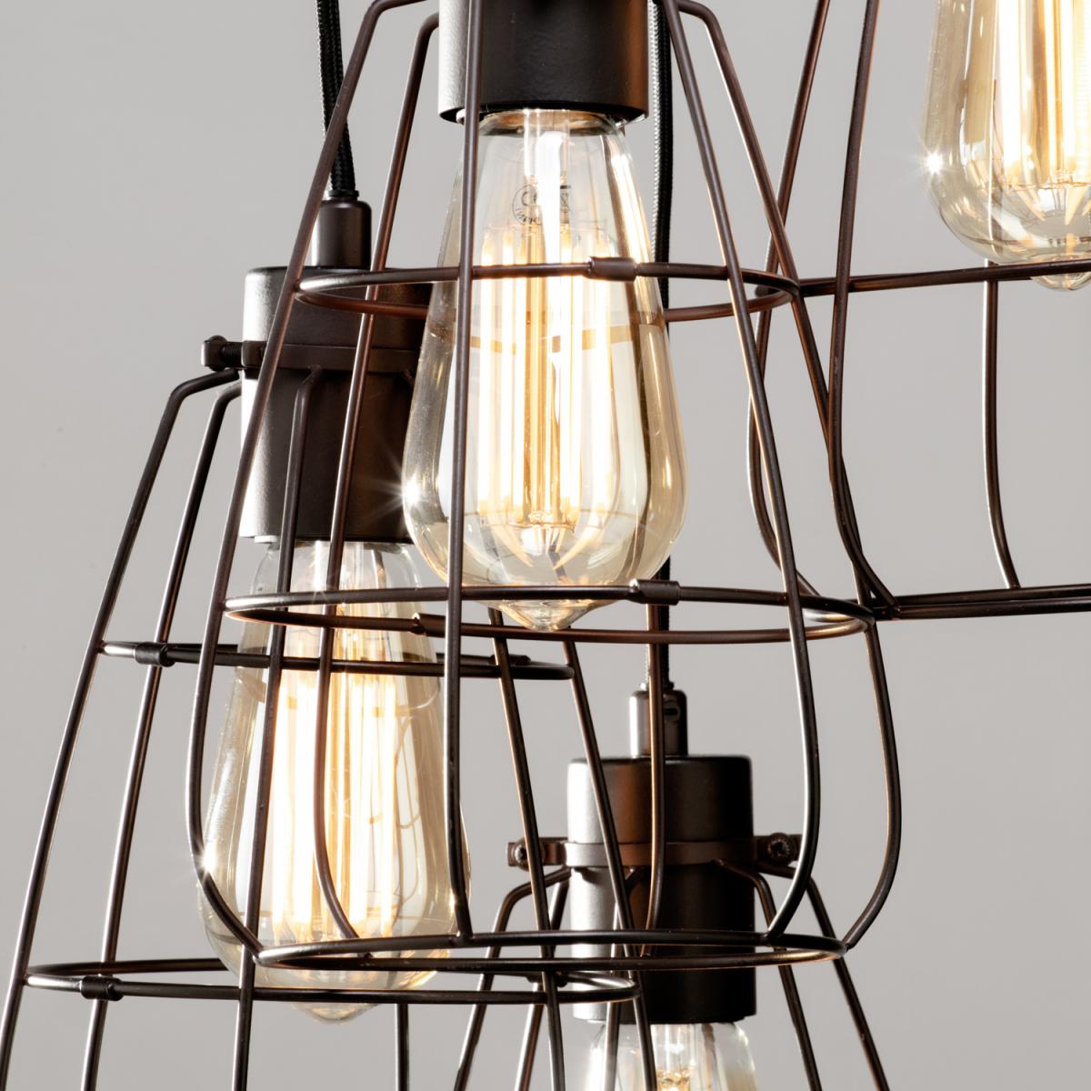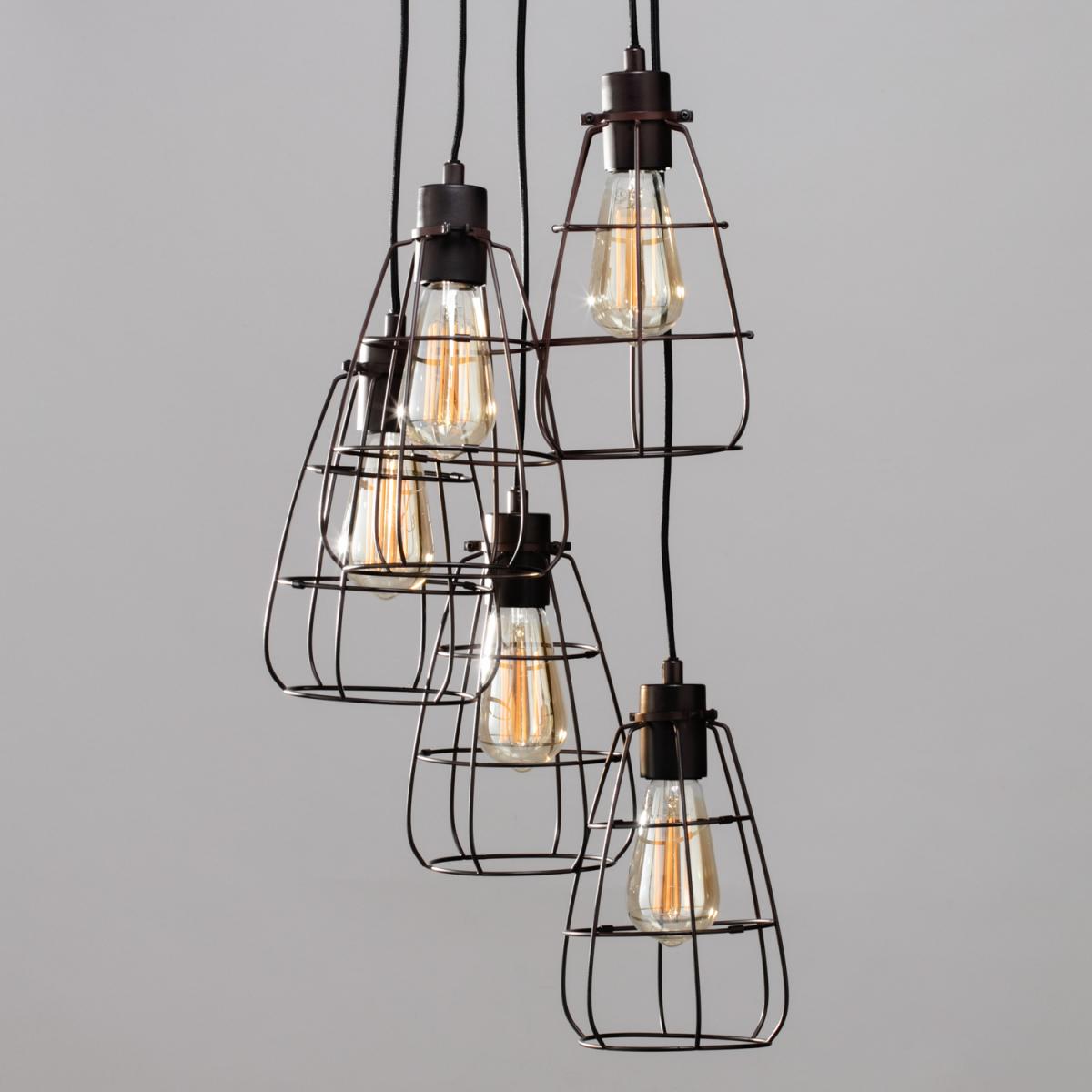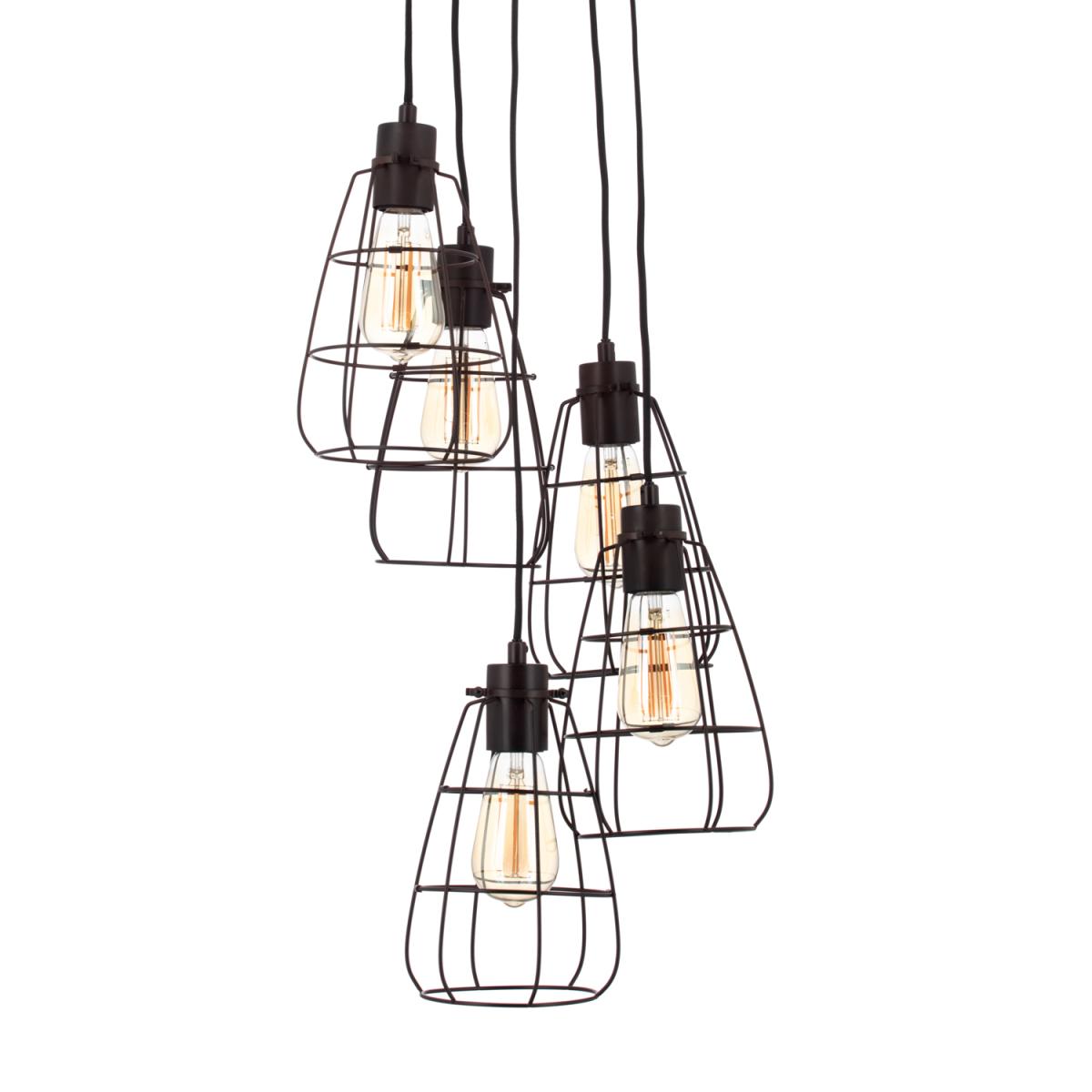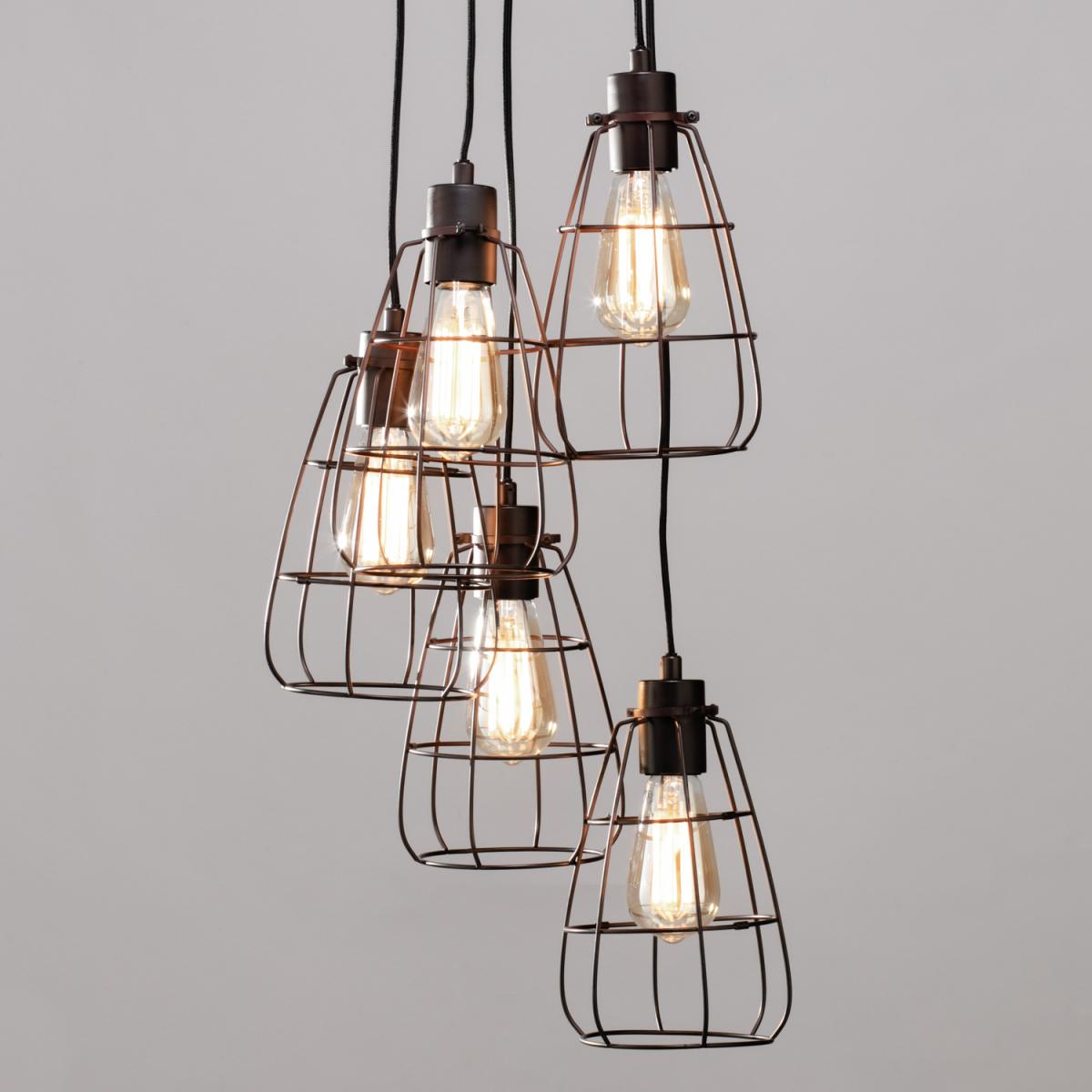 Add a unique industrial look to your home with the Drax Caged 5 Light Cluster Pendant. This pendant light creates a captivating centrepiece that radiates industrial elegance. Embrace the charm of vintage design with five caged pendants, the adjustable height of the pendants allows you to create a striking cluster, that is perfect for your home and style. The sleek metal complements any modern or industrial interior, while the exposed bulbs emit a warm, inviting glow. Make a bold statement in your living room, dining area, or kitchen with this eye-catching pendant cluster. Really elevating your space with the perfect blend of rugged charm and a contemporary style.