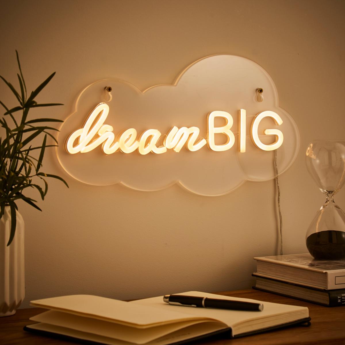* Stylish Lettering* Soft LED Strip - Emits Warm White Glow* Ideal for Bedroom & Office* Easy to Hang Dream on with our Dream Big Neon Sign. The stylish lettering and soft LED strip create a warm white glow, making it ideal for your bedroom or office. Easily hang this inspirational sign to illuminate your space and keep your aspirations shining bright.