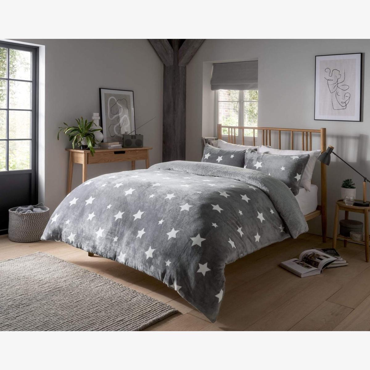 Bring the magic of the night sky into your bedroom with the Dreamin' Stars Reversible Teddy Duvet Set. Featuring a charming starry print on one side and luxuriously soft teddy fleece on the reverse, this duvet set offers the perfect blend of warmth, comfort, and whimsical design for a restful nights sleep. Available in a range of colours and sizes to suit any bedroom. This duvet set is machine washable to for easy cleaning and high quality material provides longevity. You won't be disappointed with this duvet set!