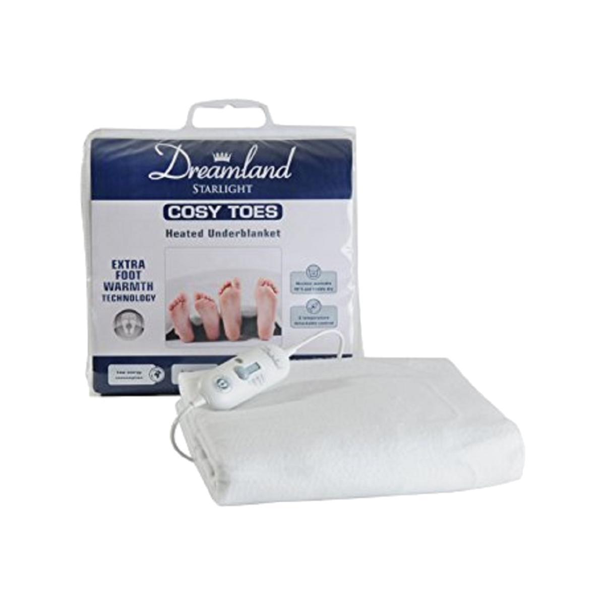 New Dreamland Cosy Toes is made from superior white high quality polyester which is hard wearing and hygienic. A great value heated blanket. Comes in 3 generous sizes, much larger than other heated underblankets on the market. It fits to the bed with tie tapes. The extra foot warmth technology, provides additional warmth, perfect to keep cold feet warm and cosy in bed. It has 3 heat setting, including pre-heat, all night use and a gentle heat option. The control comes with a long lead that is detachable. It’s machine washable, so you can keep it clean and fresh. Low Energy consumption, so it is ideal for students, first homes and perfect for caravans.