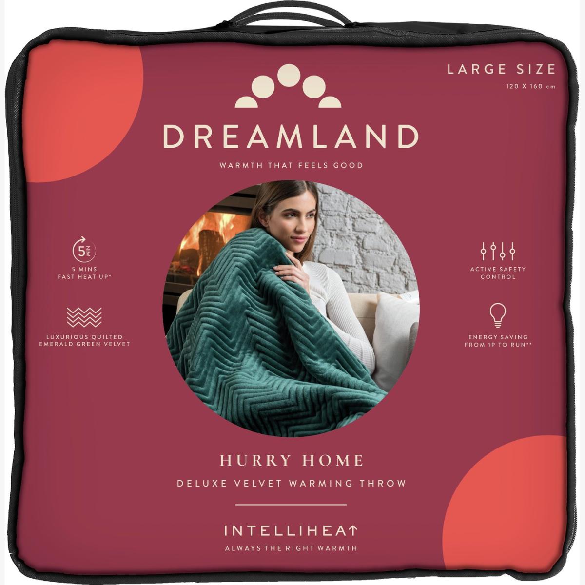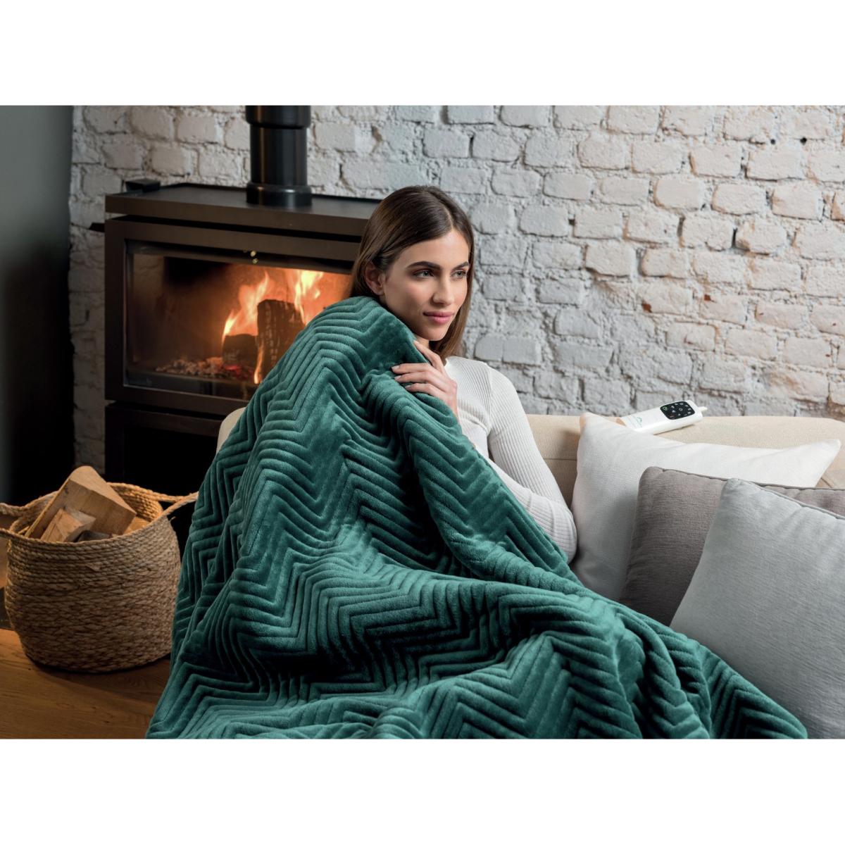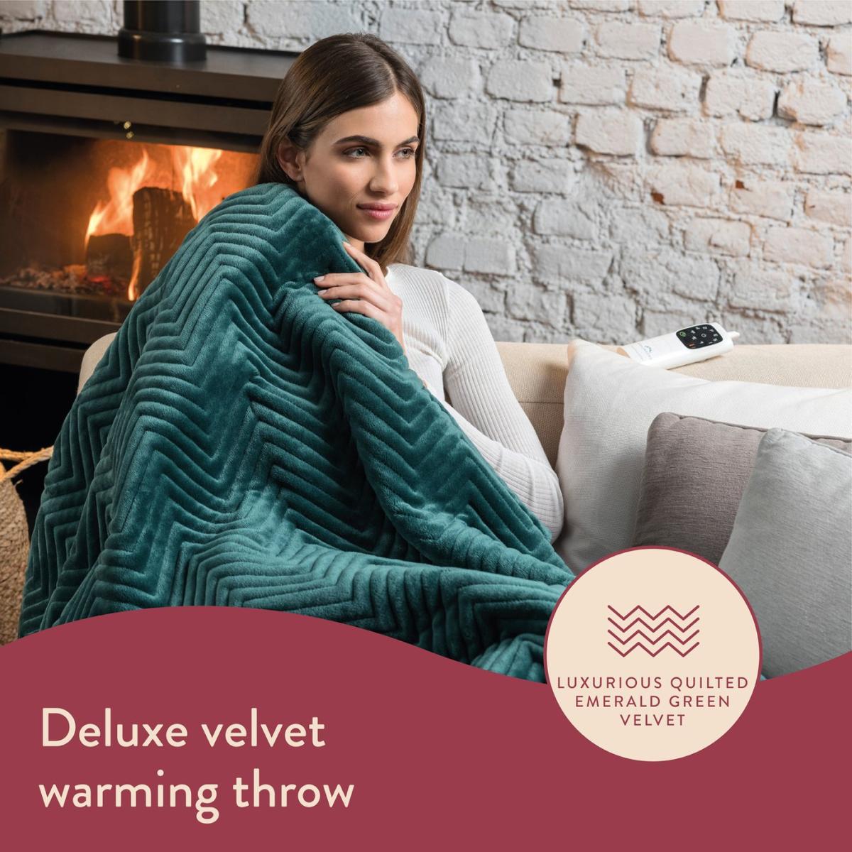 Luxurious quilted velvet warming throw in Emerald Green, featuring a contemporary herringbone pattern perfect for solo snuggling or shared cocooning. And when you're not requiring the warmth and wellbeing benefits, it cleverly doubles up as a lavish living room accessory. 5 minute fast heat up, 6 temperature settings, auto shut off timer. It's machine washable and tumble dryer safe; simply detach the digital control. Comes with a reusable storage bag and 2 year guarantee. Energy saving, costing from only 1p to run. Intelliheat, always the right warmth. Intelligent software and a 5-layer ultra-thin heating sensor wire built in to our blankets to detect its temperature 25 times per second, automatically regulating warmth safely. Features: Made from polyester. Single digital detachable controls. 6 heat settings. 5 minutes heat-up time. Auto adjusting temperature sensor - monitors the bedroom temperature and adjusts accordingly. Timer with auto shut off. Suitable for all night use. Low energy consumption. Safety features: Overheat protection. General information: Reusable storage bag. Size W160, L120cm. Machine washable and suitable for tumble drying. 2 year parts and labour manufacturer's guarantee.