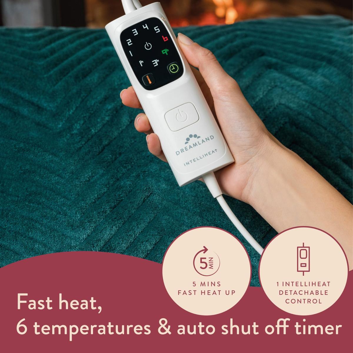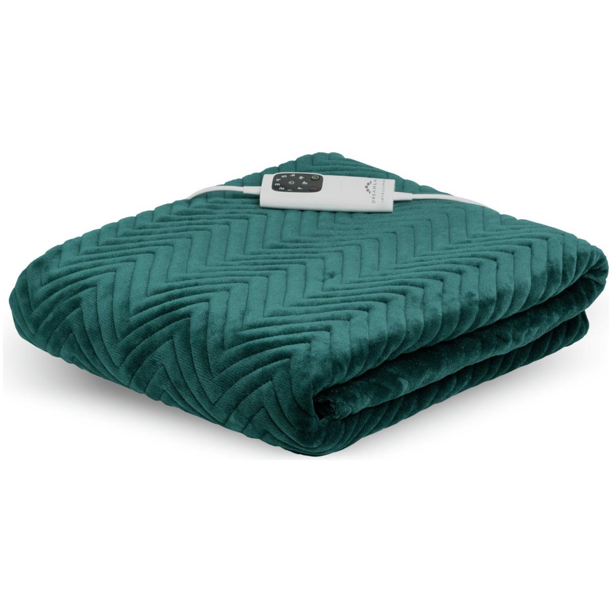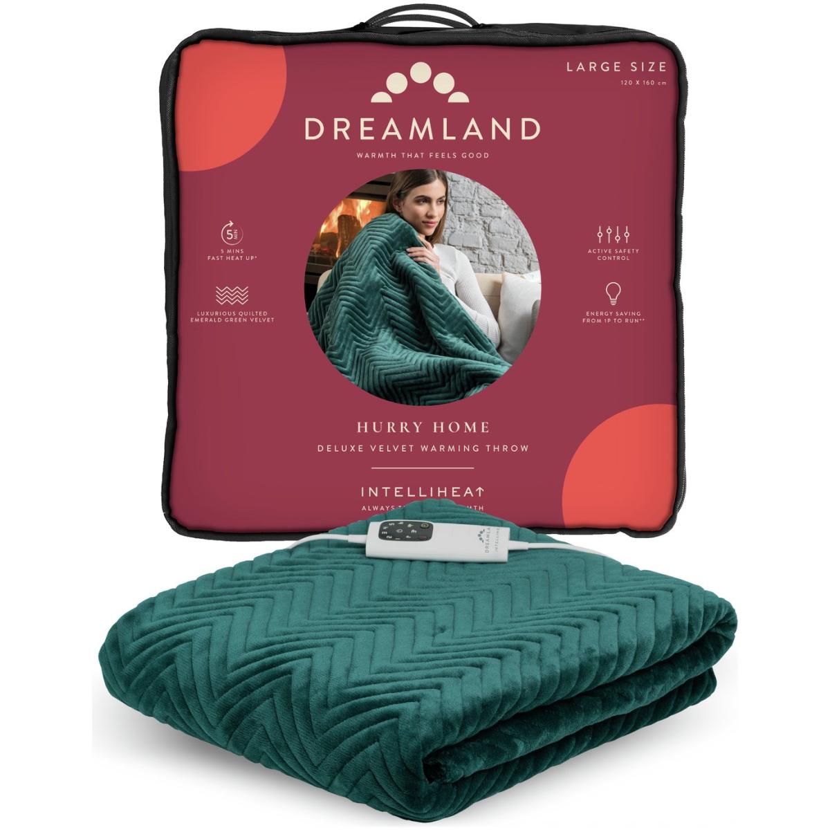 Luxurious quilted velvet warming throw in Emerald Green, featuring a contemporary herringbone pattern perfect for solo snuggling or shared cocooning. And when you're not requiring the warmth and wellbeing benefits, it cleverly doubles up as a lavish living room accessory. 5 minute fast heat up, 6 temperature settings, auto shut off timer. It's machine washable and tumble dryer safe; simply detach the digital control. Comes with a reusable storage bag and 2 year guarantee. Energy saving, costing from only 1p to run. Intelliheat, always the right warmth. Intelligent software and a 5-layer ultra-thin heating sensor wire built in to our blankets to detect its temperature 25 times per second, automatically regulating warmth safely. Features: Made from polyester. Single digital detachable controls. 6 heat settings. 5 minutes heat-up time. Auto adjusting temperature sensor - monitors the bedroom temperature and adjusts accordingly. Timer with auto shut off. Suitable for all night use. Low energy consumption. Safety features: Overheat protection. General information: Reusable storage bag. Size W160, L120cm. Machine washable and suitable for tumble drying. 2 year parts and labour manufacturer's guarantee.