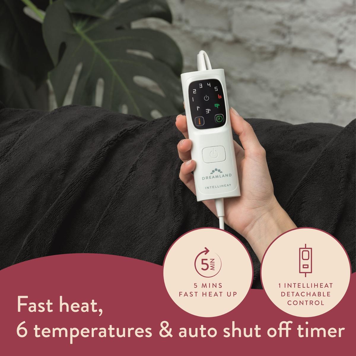 * Intelliheat Technology* 6 Temperatures 1 3 or 9 hour auto shut off timer* 5 minutes fast heat up* Luxury velvety plush* Active Safety Control* Energy Saving from 1p to run* Machine washable and tumble dryer safe* Detachable control* Dimensions: One size 120 x 160cm* 1 digital Intelliheat control Cocoon yourself in cloud like comfort with our velvety plush, warming throw. Super-sized and seriously soft, the strokable texture makes it the perfect solo or shared snuggle companion. And when you're not requiring the warmth and wellbeing benefits, it doubles up as a stylish living room accessory. Simply nestle down into warmth that looks good and feels even better. Still unsure and want to know more? Check out our [electric blanket buying guide here]( https://www. dunelm. com/info/buying-guides/electric-blankets-buying-guide).