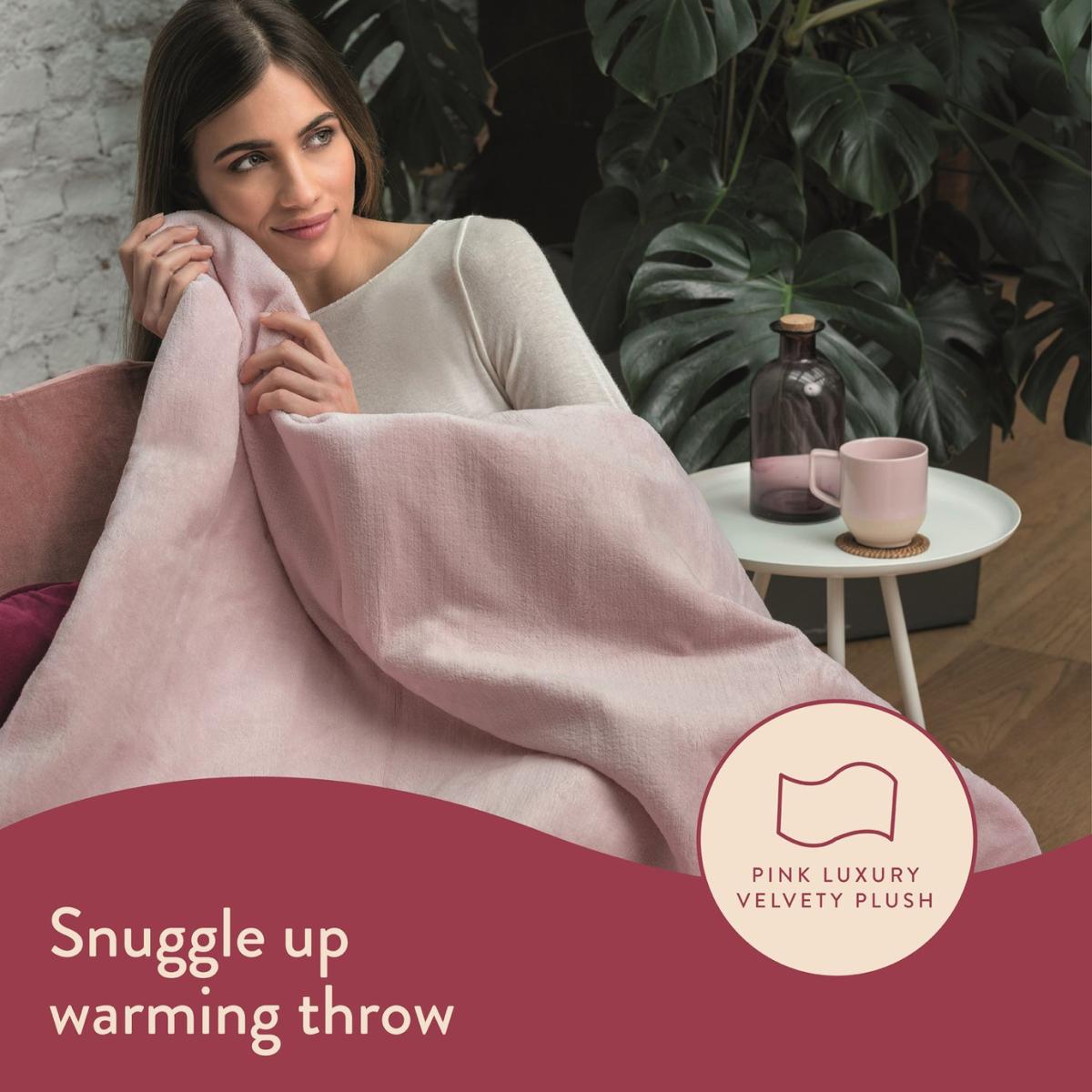 Cocoon yourself in cloud-like comfort with our velvety plush warming Pink throw. Super-sized and seriously soft, the strokable texture makes it the perfect solo or shared snuggle companion. And when you're not requiring the warmth and wellbeing benefits, it doubles up as a stylish living room accessory. 5 minute fast heat up, 6 temperature settings with auto shut off timer. Machine washable and tumble dryer safe; simply detach the digital control. Comes with reusable storage bag and 2 year guarantee. Energy saving, costing from only 1p to run.