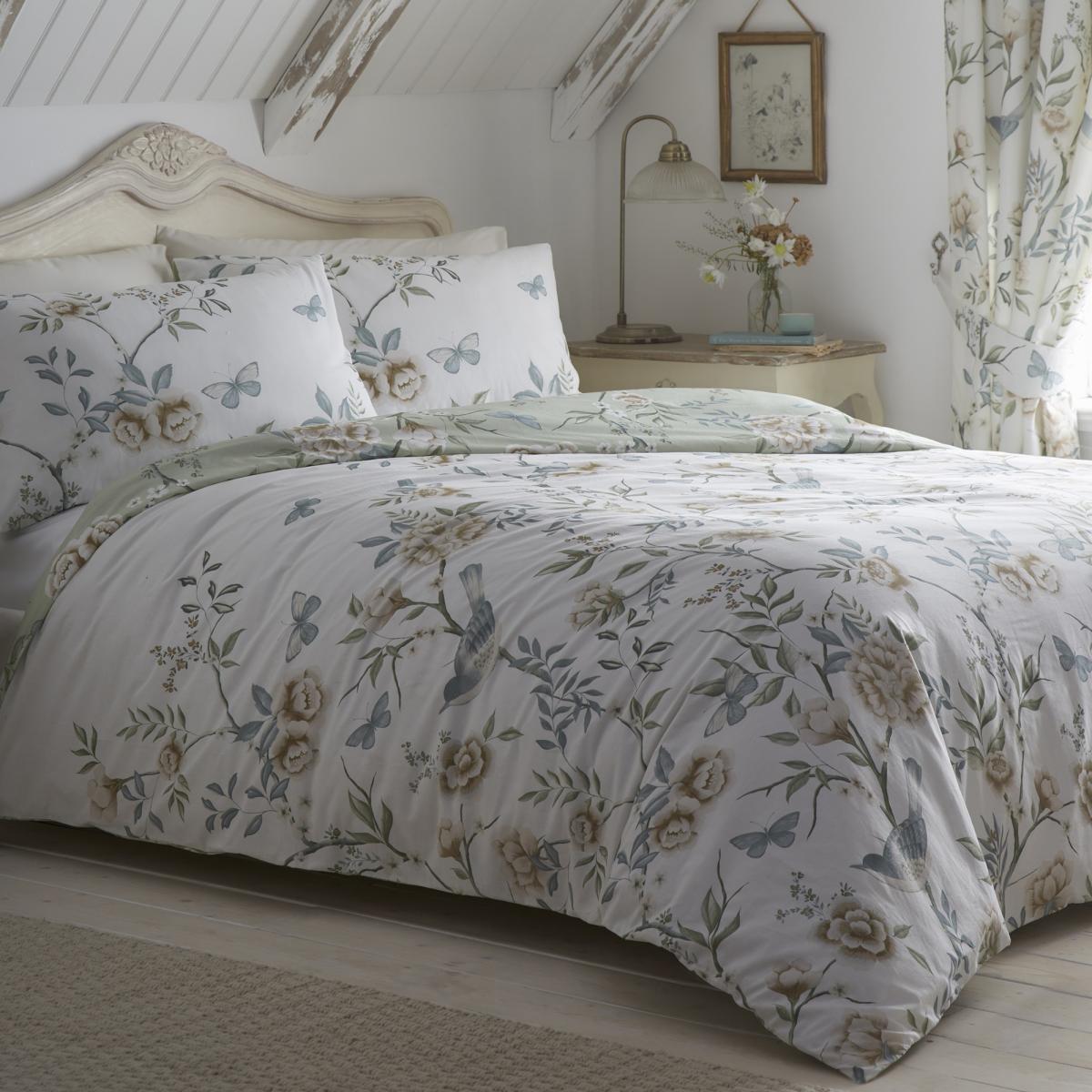 Indulge in the timeless elegance of the Amelle Duvet Cover Set by Dreams & Drapes. Adorned with a captivating floral branch and bird print, this set is a true testament to our commitment to meticulous craftsmanship and sophisticated design. Reversible for versatility, the understated elegance of this set is perfect for those who appreciate the finer things in life. Transform your bedroom into a sanctuary of traditional, sophisticated style with the enduring charm of the D&D Design. Browse our coordinating options and elevate your decor to new heights of elegance and refinement. Features 52% Polyester, 48% Cotton Reversible Single Duvet Includes a Single Pillowcase Double, King and Superking Duvet Includes a Pair of Pillowcases Care Instructions Wash at 40° before use Do not dry clean Do not bleach Low heat tumble dry Cool iron Please note All screens vary in colour reproduction and whilst every effort has been made to display the colour as accurately as possible it is for guidance only.