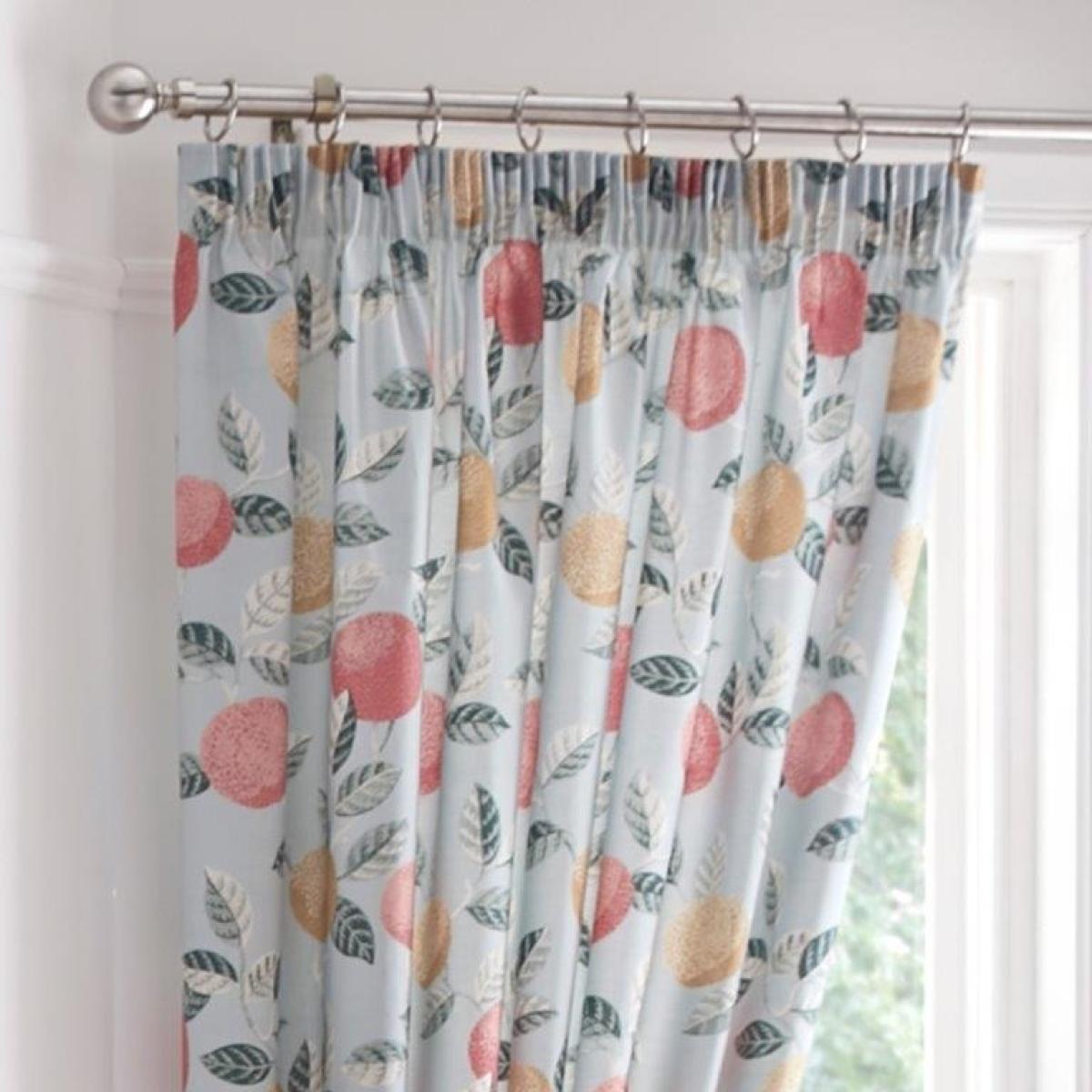 Gorgeous, hand drawn fruits in subtle shades of peach and ochre feature across these beautifully designed curtains. printed on to a soft duck egg green ground, these curtains are fully lined which will help keep light out and the heat in and are made with a standard 3" pencil pleat, taped header style. Dreams & Drapes is a trusted quality UK bedding brand, the design range presents beautiful printed heritage floral designs and traditionally-styled bedroom furnishings. This curtain size is suitable for curtain pole or track width (140cm to 220cm) Pencil pleat curtains can be fitted onto either a pole or curtain track. (2 panels per pack) Fabric: 52% polyester, 48% cotton Lining: 100% polyester (light filtering) Care: dry clean only All screens vary in colour reproduction and whilst every effort has been made to display the colour as accurately as possible it is for guidance only.