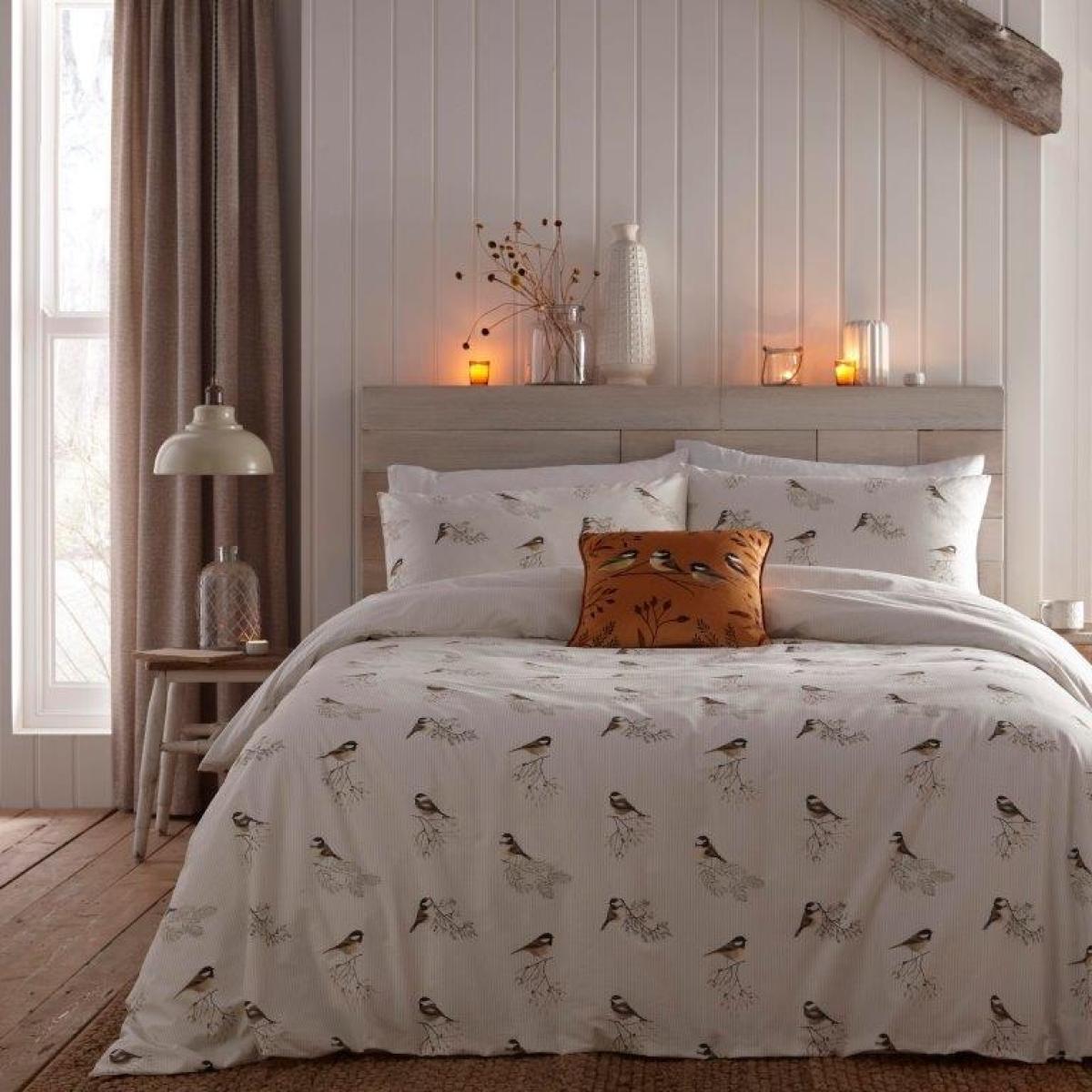 Dreams & Drapes lodge - Chickadees - Brushed Cotton Duvet Cover Set - in Natural. Beautifully drawn, chickadees perch delicately across this cotton rich, soft brushed cotton bedding set that is perfect for a cosy nights sleep. A simple, classic stripe features on the reverse. Dreams & Drapes is a trusted quality UK bedding brand, the lodge range presents beautiful printed bedding made with heavyweight brushed cotton for a warm, snug feeling. Material Content: 100% Cotton Washing Instructions:Machine Washable Single includes 1 x pillowcase, double & king include 2 x pillowcases (76x48cm) All screens vary in colour reproduction and whilst every effort has been made to display the colour as accurately as possible it is for guidance only.