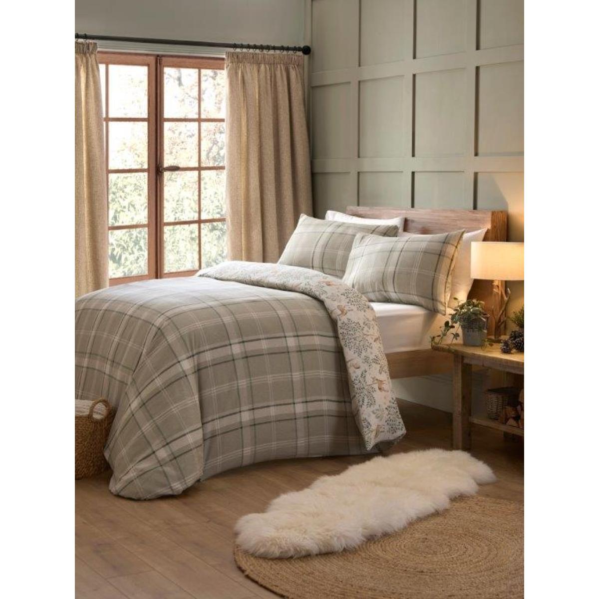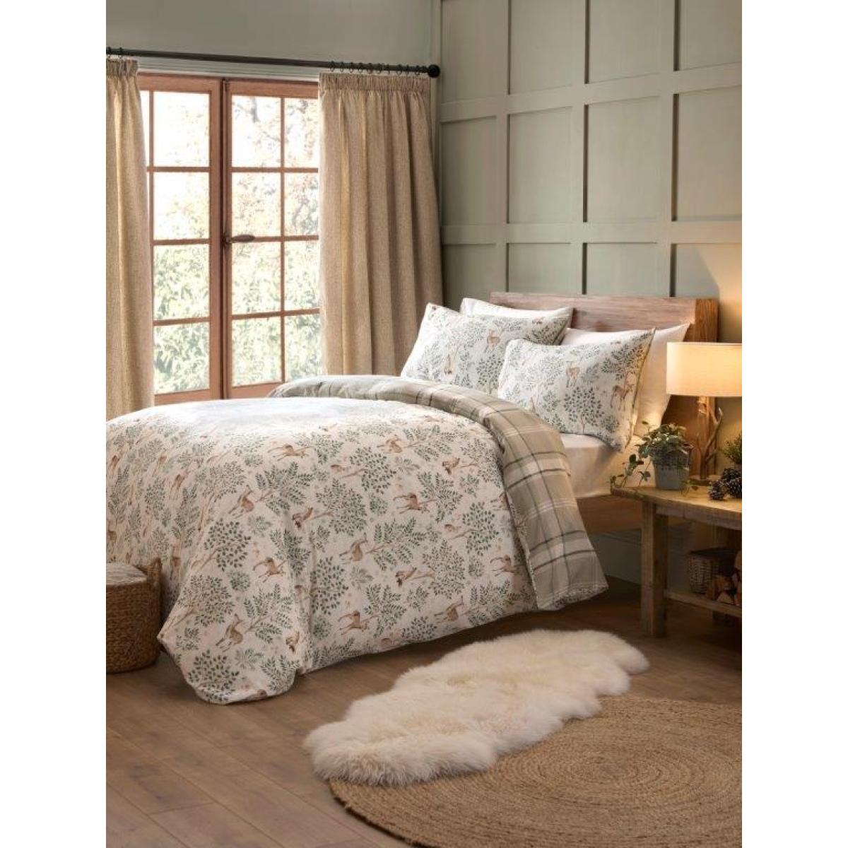 Hand-painted watercolour animals dance amongst evergreen trees on this luxurious 100% brushed cotton duvet set. The bedding set is fully reversible with a charming large natural-coloured check on the other side for 2 great looks in 1. Let the magic of the forest embrace you in the comfort of your own home. Material: 100% Brushed Cotton Fully Reversible: For two stylish looks in one. Button Fastening: To keep your duvet securely in place. Contents: Duvet Cover & Pillowcase/s (single x1, other sizes x2) Care Instructions: 40° wash Do not bleach Cool Iron Low heat tumble dry Do not dry clean Dimensions Single: 140 x 200cm Double: 200 x 200cm King: 225 x 200cm Super King: 260 x 220cm All screens vary in colour reproduction and whilst every effort has been made to display the colour as accurately as possible it is for guidance only