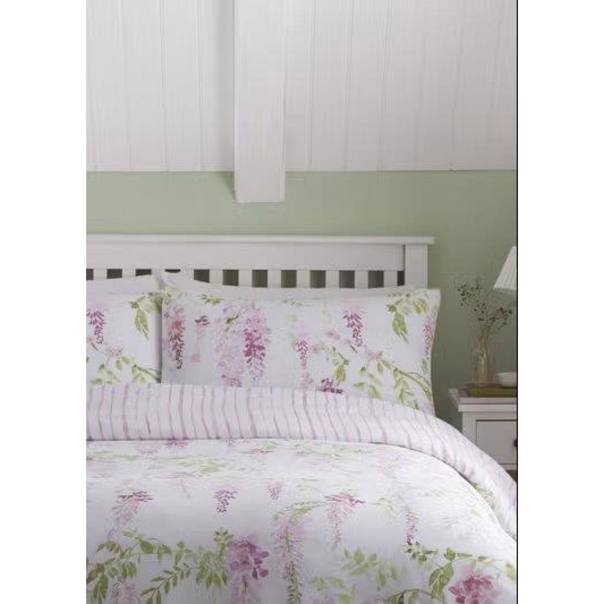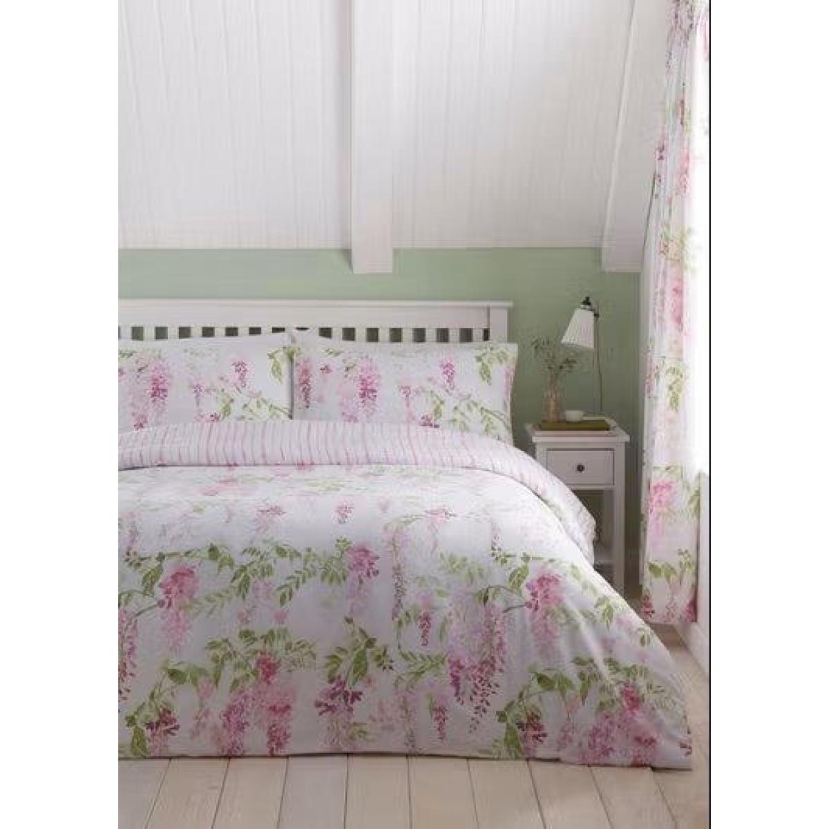 This gorgeous hand painted floral design is the perfect print to brighten up any bedroom. Pink wisteria flowers adorn the front of the bedding on a soft white ground. The reverse of the duvet cover features a simple but stunning stripe in complimentary colours to offer two great looks for the price of one. Features 52% Polyester, 48% Cotton Reversible Single duvet includes a single pillowcase Double, king and superking duvet includes a pair of pillowcases Care Instructions Minimal ironing, easy care fabric 40°C wash Do not bleach Low heat tumble dry Do not dry clean Please note All screens vary in colour reproduction and whilst every effort has been made to display the colour as accurately as possible it is for guidance only.