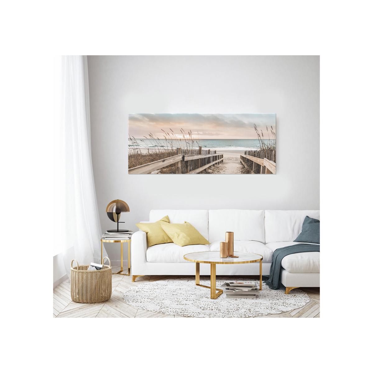 If only every day was a day at the beach… With this calming glass art, it can be, as you gaze out to sea across soft sands and waving grasses, soaking in the bliss. Why you'll love it. Transform your wall into a view to die for with this wall art. The printing technology used ensures an extraordinary depth of colour. A stunning photograph reproduced on 6 mm toughened glass. Smart hanging mounts allow this wall art to be hung completely flat. This piece of glass art is part of the Furniture Village wall art collection. What you need to know. Hanging fittings are included. Dust with a soft, clean, lint-free cloth. Dimensions. Width: 125 cm (50 inches). Height: 50 cm (20 inches).
