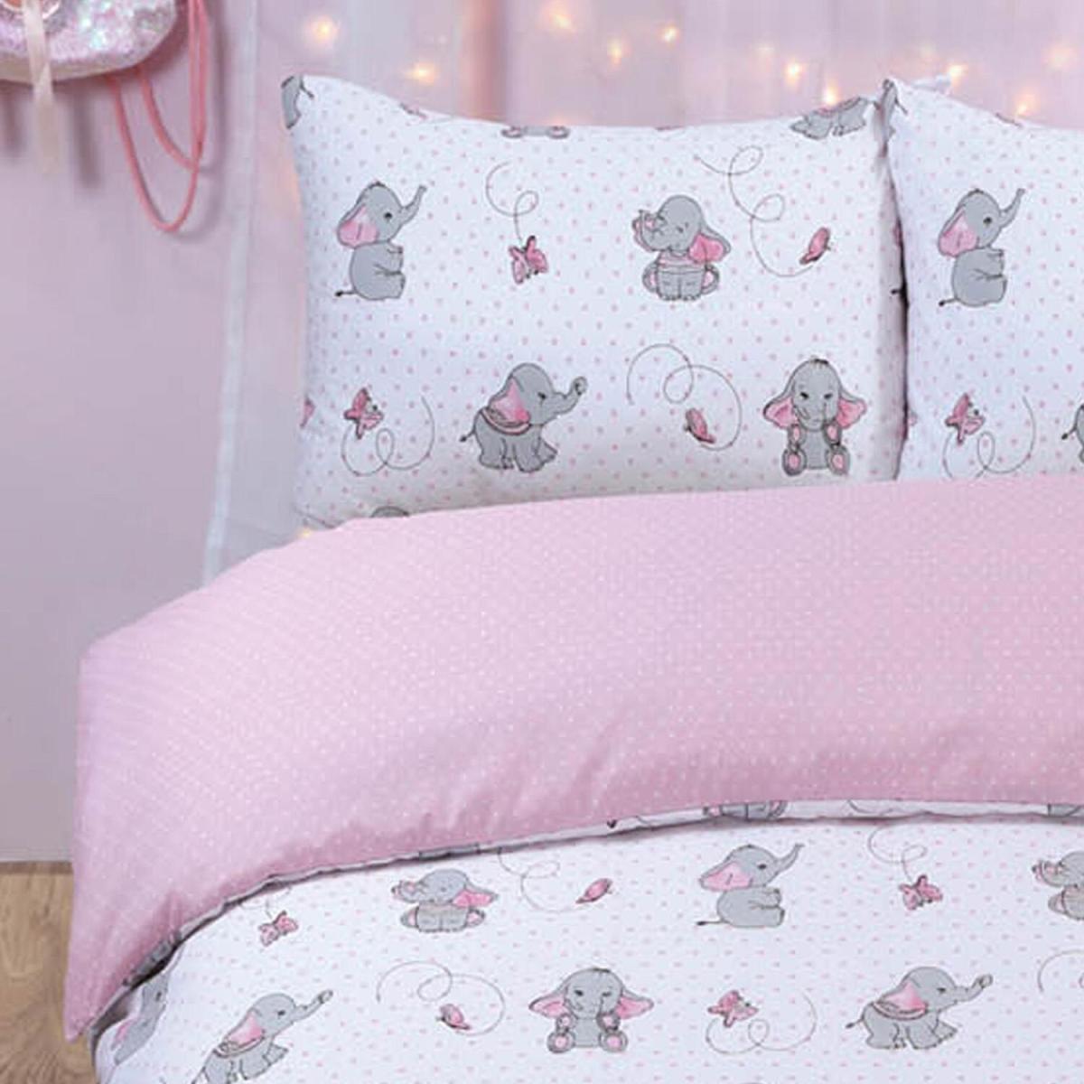 This 2-in-1 reversible duvet cover set from our Dreamscene range will be sure to brighten your room with it's cute baby elephant and butterfly print, featured on a pink and white polk-a-dot base. The reverse side is a contrasting polk-a-dot print, the bedding set comes complete with matching pillow case(s). This beautifully illustrated elephant duvet is made from a soft blend of, 50 cotton and 50 polyester allowing for ultimate comfort and durability. This duvet cover will ensure the best night's sleep for your little ones.