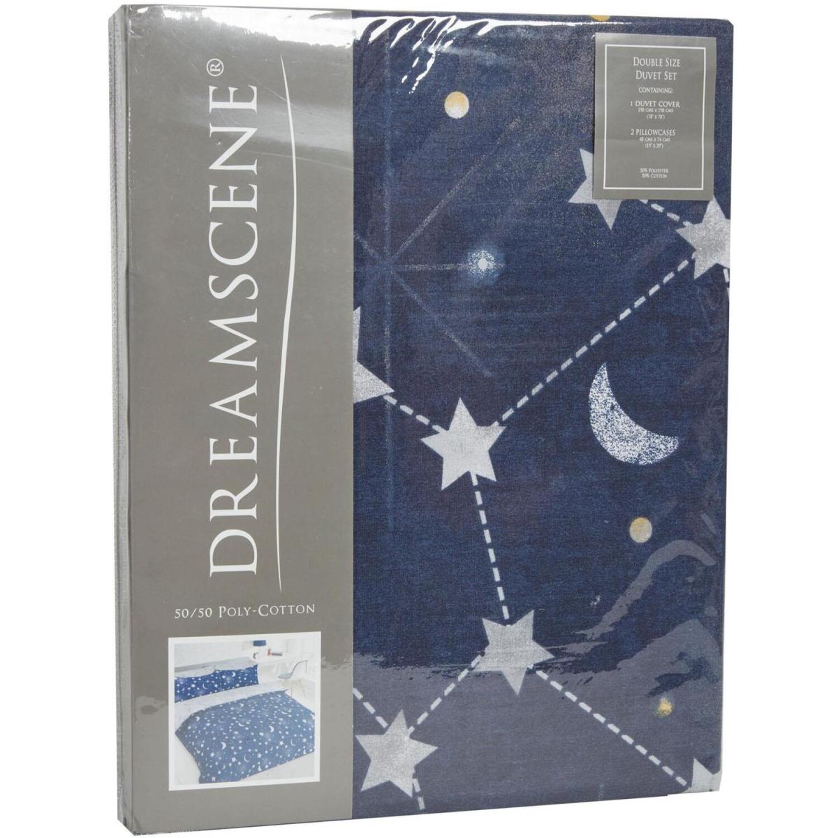 This 2-in-1 reversible duvet cover set from the Dreamscene Junior range will be sure to modernise your room. The face shows fun galaxy, moon and stars and the reverse side features night time shooting star pattern, the set comes with matching pillow case(s) to complete the look. This modern duvet cover is made from a soft polycotton blend, 50 cotton and 50 polyester. The bedding set is soft, comfortable and durable, allowing for a relaxing nights sleep.