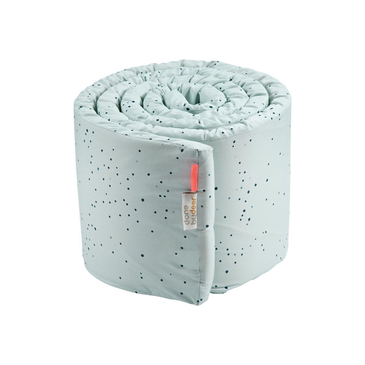 Create a safe and comfortable sleeping environment with a comfortable cot bumper.The cot bumper is a soft pastel tone dotted with delicate spots. Oeko-Tex certified. Fits standard 60 x 120 cm beds. Fabric: Cover: 100% cotton with hidden zipper. Padding: 100% PU foam. Care: Washable at 40 ° C. Do not tumble dry. Do not dry clean. Max withdrawal: 2%.Size: 350 x 30 x 3 cm