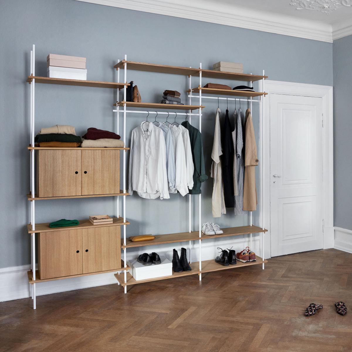 I love this 'Dressing room Shelving System' for its clean, minimalist design that works beautifully in contemporary and Scandi-inspired interiors. Its slim profile and natural wood finish make it versatile enough to fit into walk-in wardrobes, bedrooms, or even open-plan living spaces, adding a sense of organisation without bulk. Practical styling tips include placing baskets or boxes on the shelves for hidden storage, and using the upper rods for hanging clothes, while the lower shelves are perfect for shoes or folded items. The cabinet also provides discreet storage options, helping to keep the space tidy. Overall, it’s a functional piece that balances aesthetic appeal with everyday practicality.