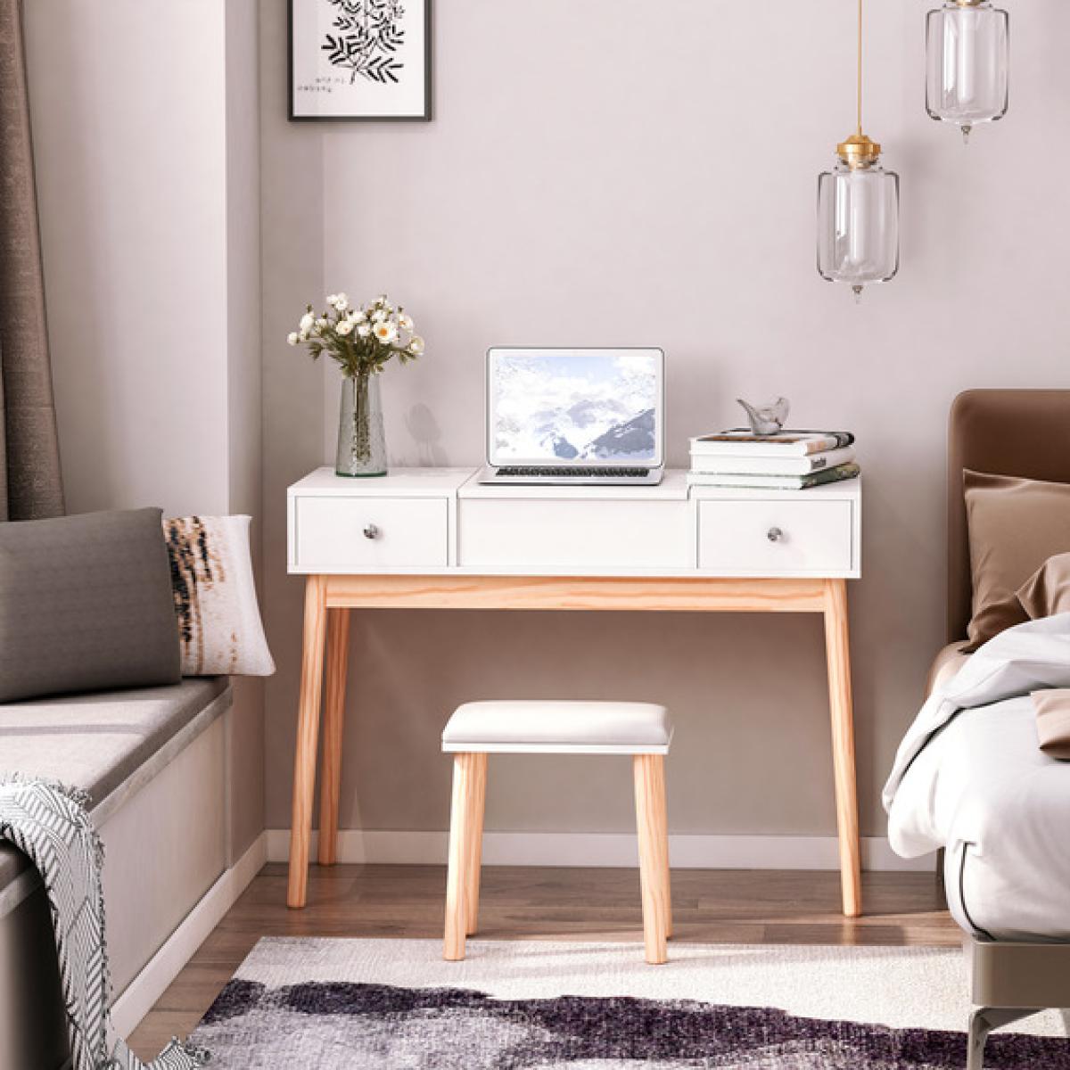 I really like this dressing table set for its clean, minimalist look, making it a versatile piece that can suit a variety of interior styles, from Scandi to contemporary. The white finish helps it blend seamlessly into bright, airy bedrooms or dressing alcoves, while the light wood legs bring warmth and a touch of natural softness. It’s practical for smaller spaces, with a compact yet functional design that offers enough surface area for daily grooming essentials. For styling tips, consider adding a decorative tray or a few small organisers to keep frequently used items neat, and complement the look with soft textiles like a cosy throw or a textured stool to add a layer of comfort. It works particularly well in interiors that favour a fresh, light colour palette or pared-back decor.