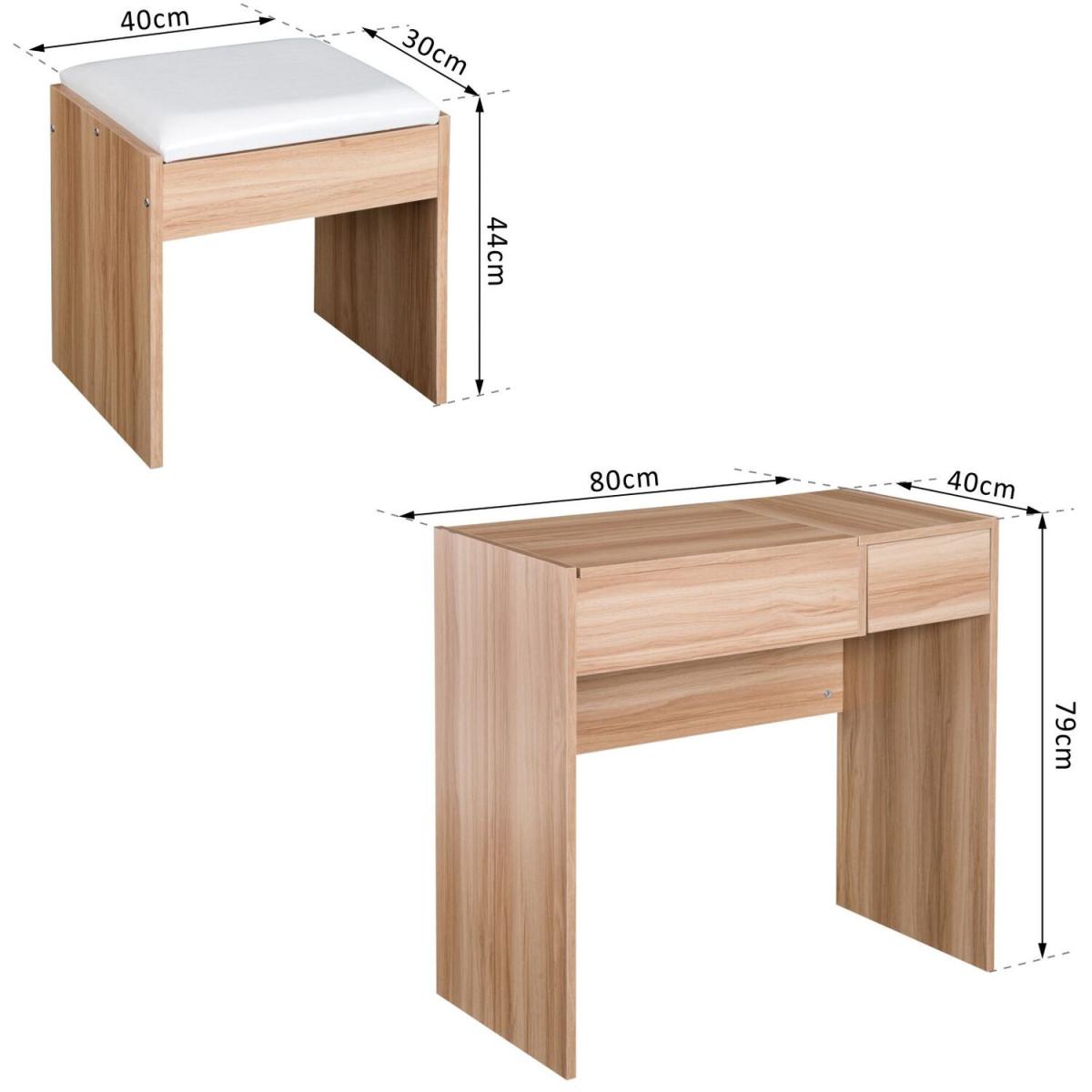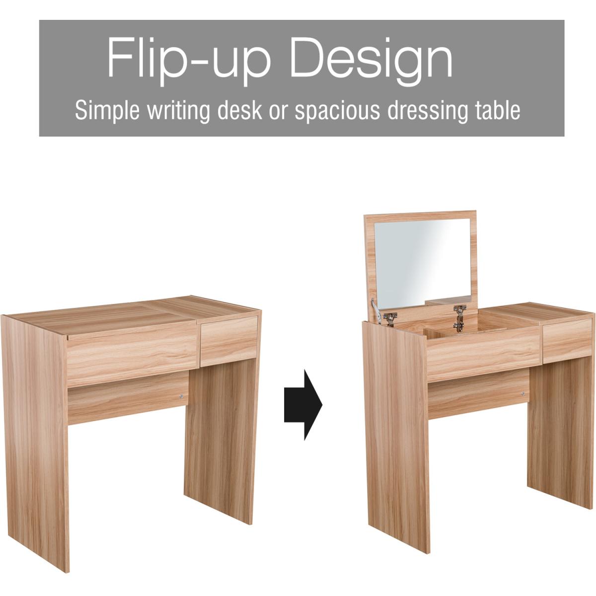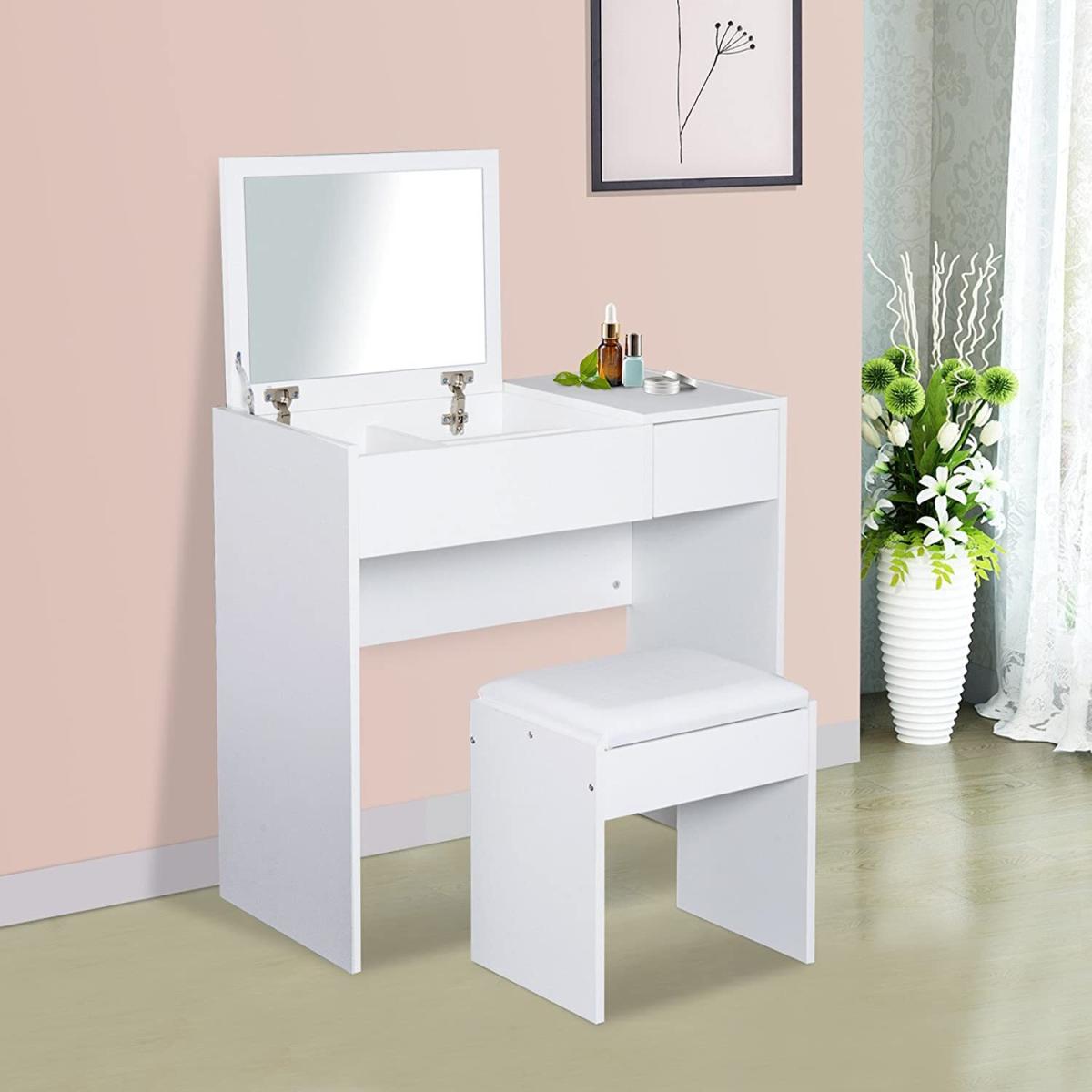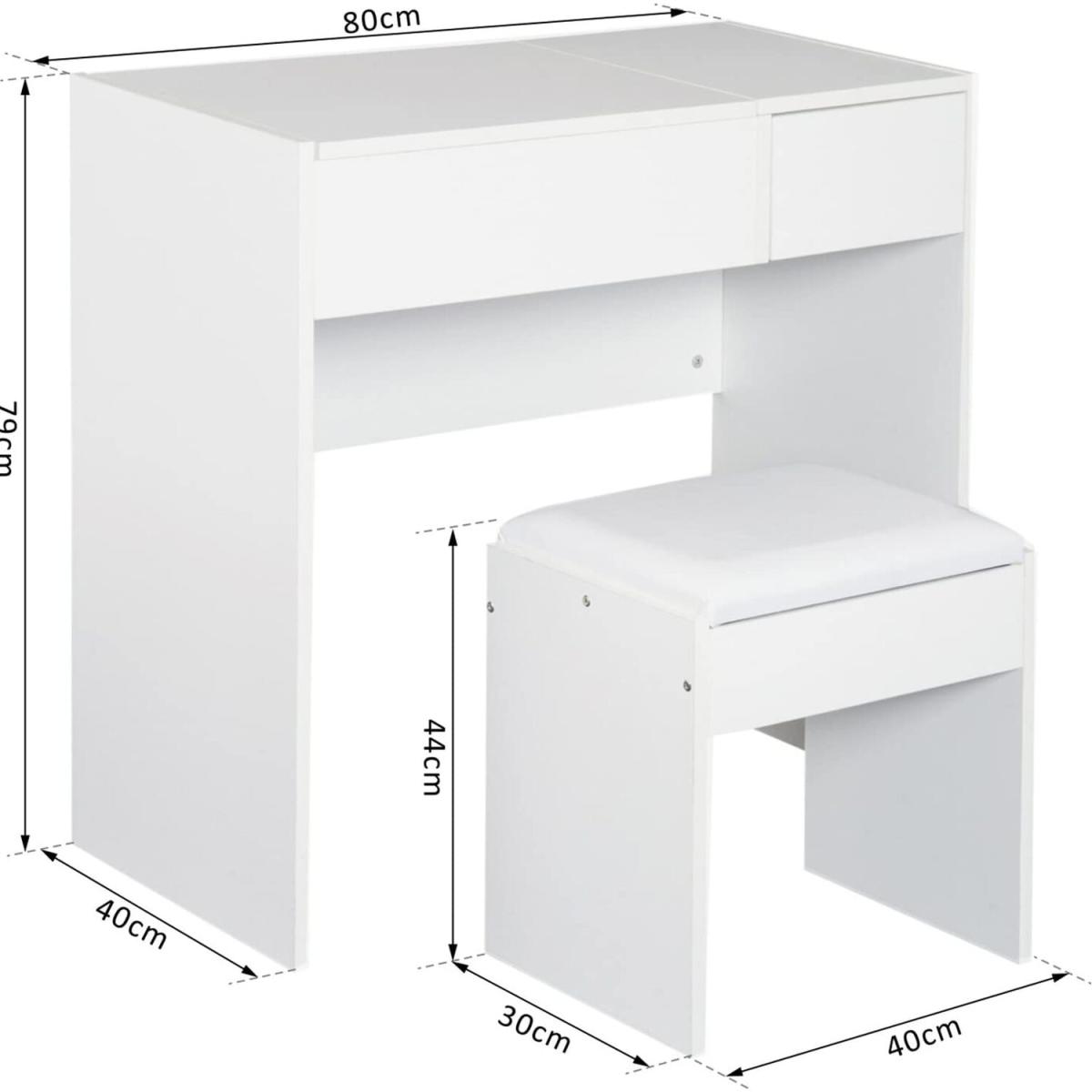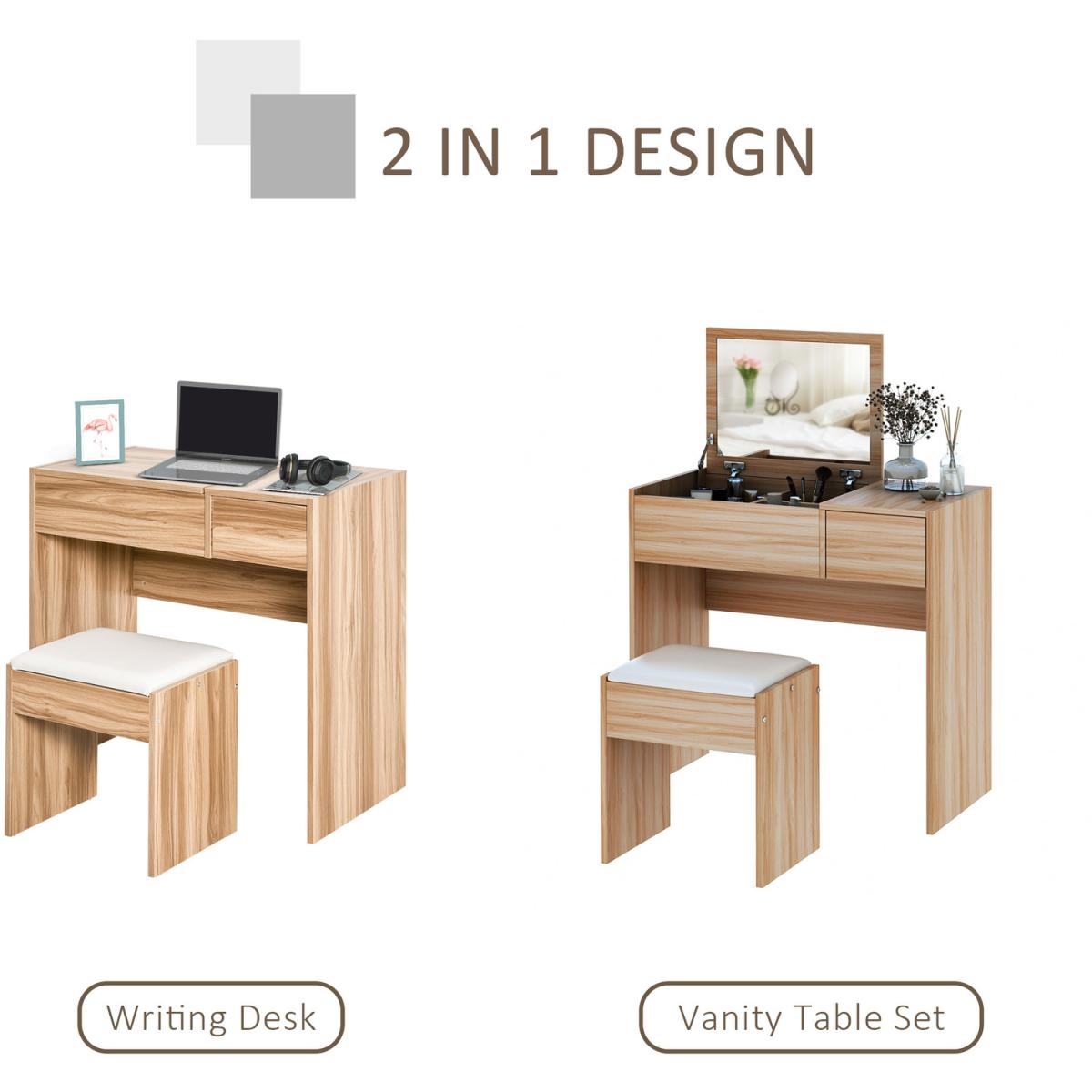 The stylish dressing table set from HOMCOM comes with a multi-purpose dressing table and a padded stool. The flip-up design allows you to easily convert the dressing table with a mirror to an ideal writing desk with hidden storage space under the lid. The slide-out drawer offers added space. With smooth leather and a soft sponge, the padded stool provides added comfort. Constructed with 16mm-thick E1 chipboard, the table set ensures long-lasting use.