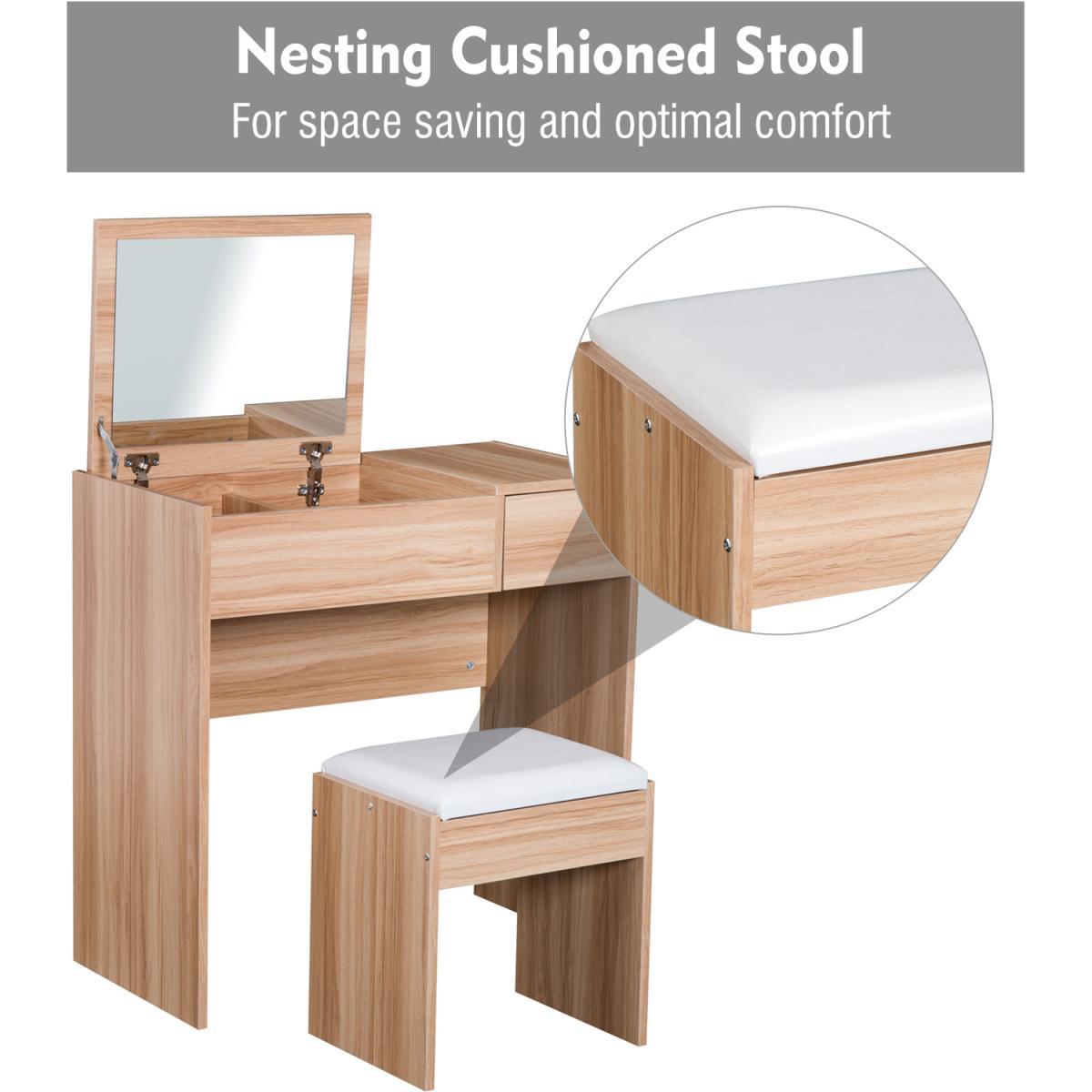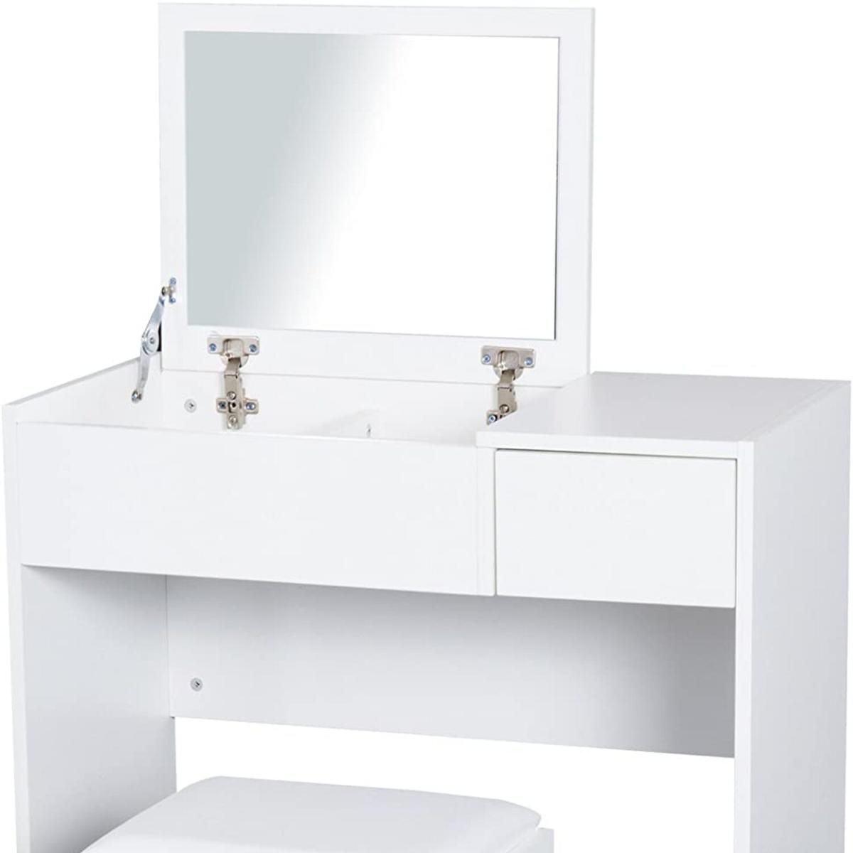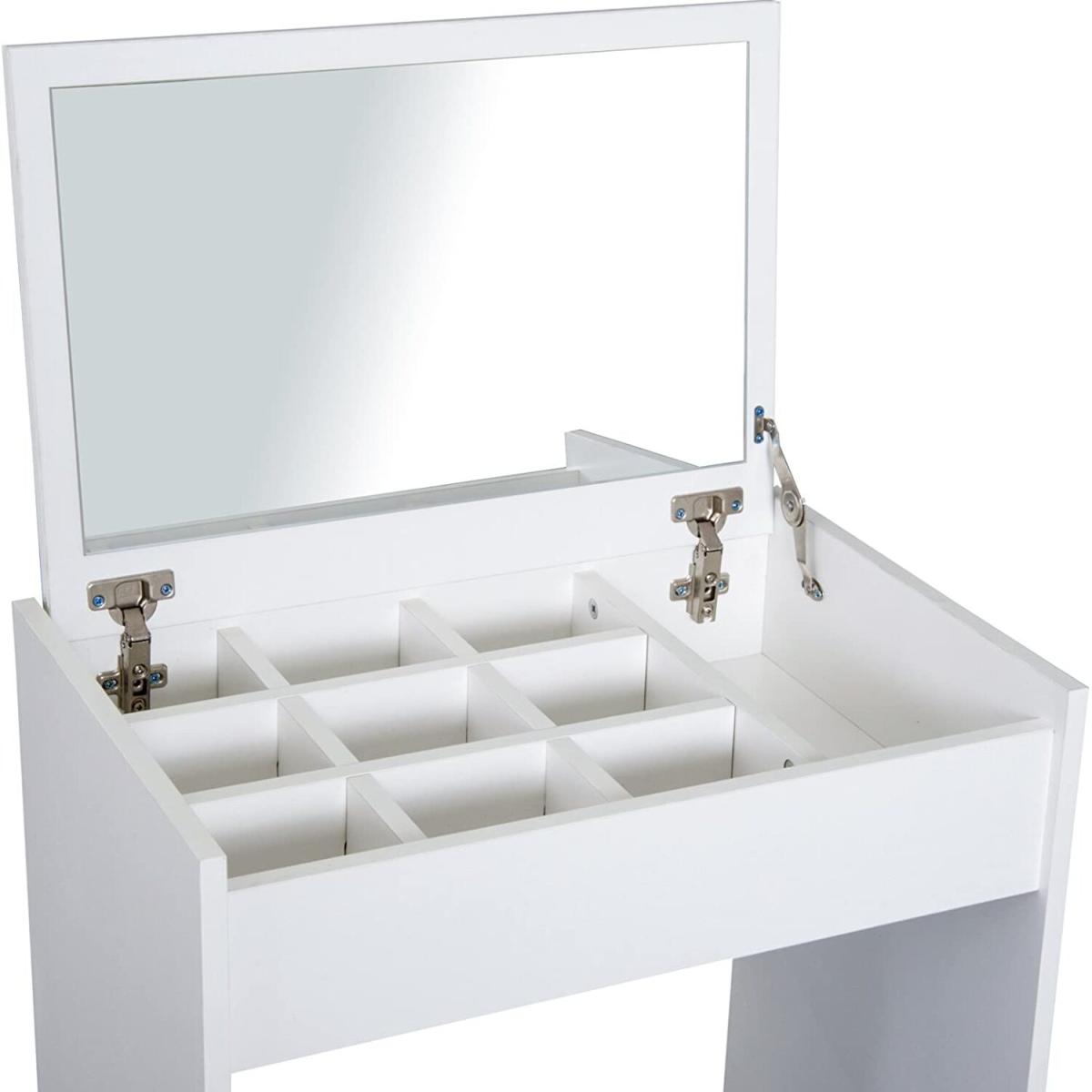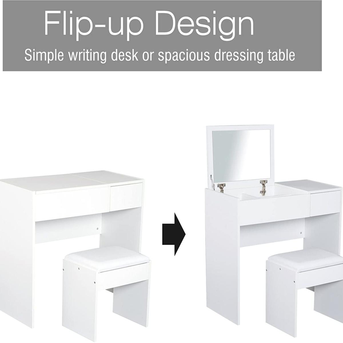 The stylish dressing table set from HOMCOM comes with a multi-purpose dressing table and a padded stool. The flip-up design allows you to easily convert the dressing table with a mirror to an ideal writing desk with hidden storage space under the lid. The slide-out drawer offers added space. With smooth leather and a soft sponge, the padded stool provides added comfort. Constructed with 16mm-thick E1 chipboard, the table set ensures long-lasting use.
