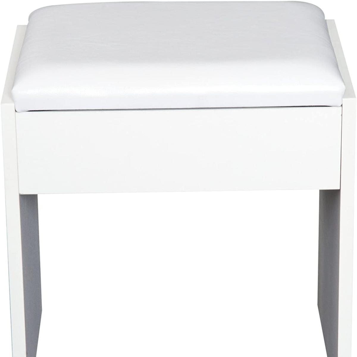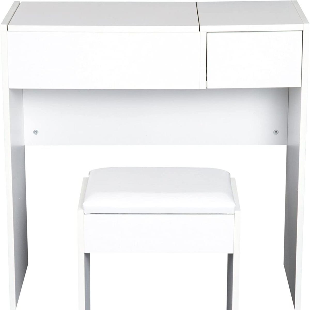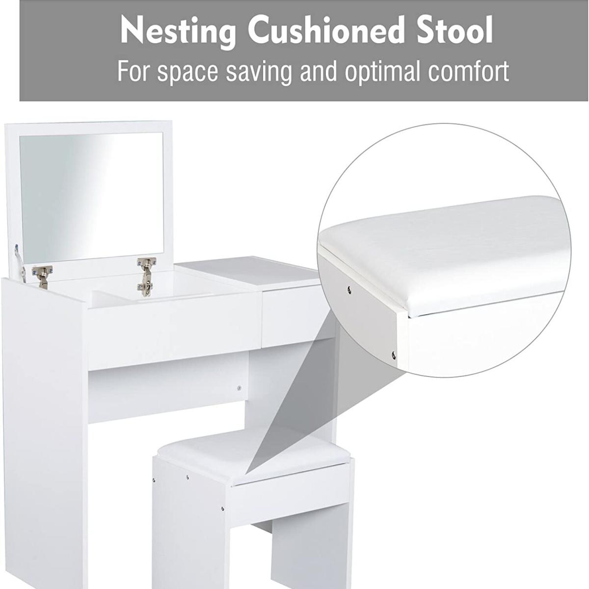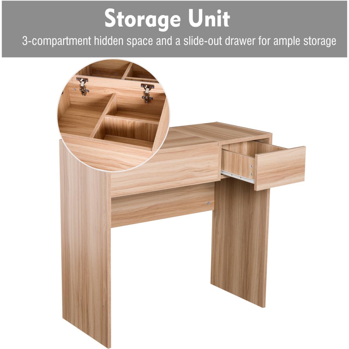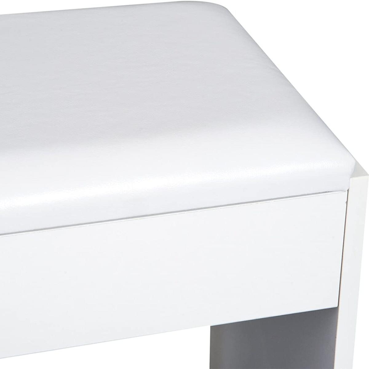 The stylish dressing table set from HOMCOM comes with a multi-purpose dressing table and a padded stool. The flip-up design allows you to easily convert the dressing table with a mirror to an ideal writing desk with hidden storage space under the lid. The slide-out drawer offers added space. With smooth leather and a soft sponge, the padded stool provides added comfort. Constructed with 16mm-thick E1 chipboard, the table set ensures long-lasting use.