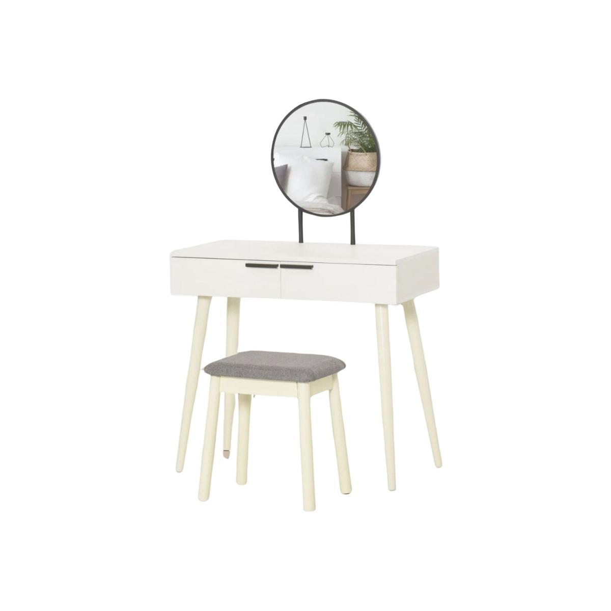Enjoy the convenience of two spacious drawers, each equipped with handles for effortless opening and closing, providing easy storage solutions. Crafted from sturdy particleboard and supported by four rubber wood legs, this vanity table ensures stability and balance for long-term use. The cushioned stool offers a soft and comfortable spot for getting ready, adding a touch of comfort to your daily routine. A fixed large mirror is included, providing a convenient space for grooming and preparing for the day ahead. Featuring a beautiful and elegant white design, this vanity table requires assembly, allowing you to effortlessly integrate it into your space.
