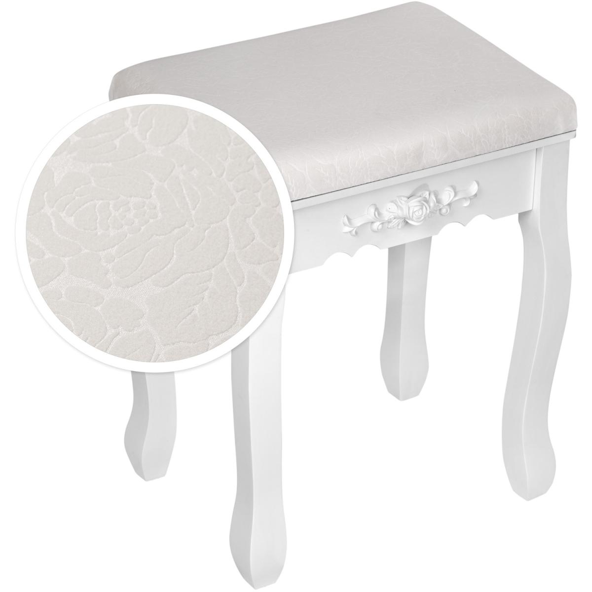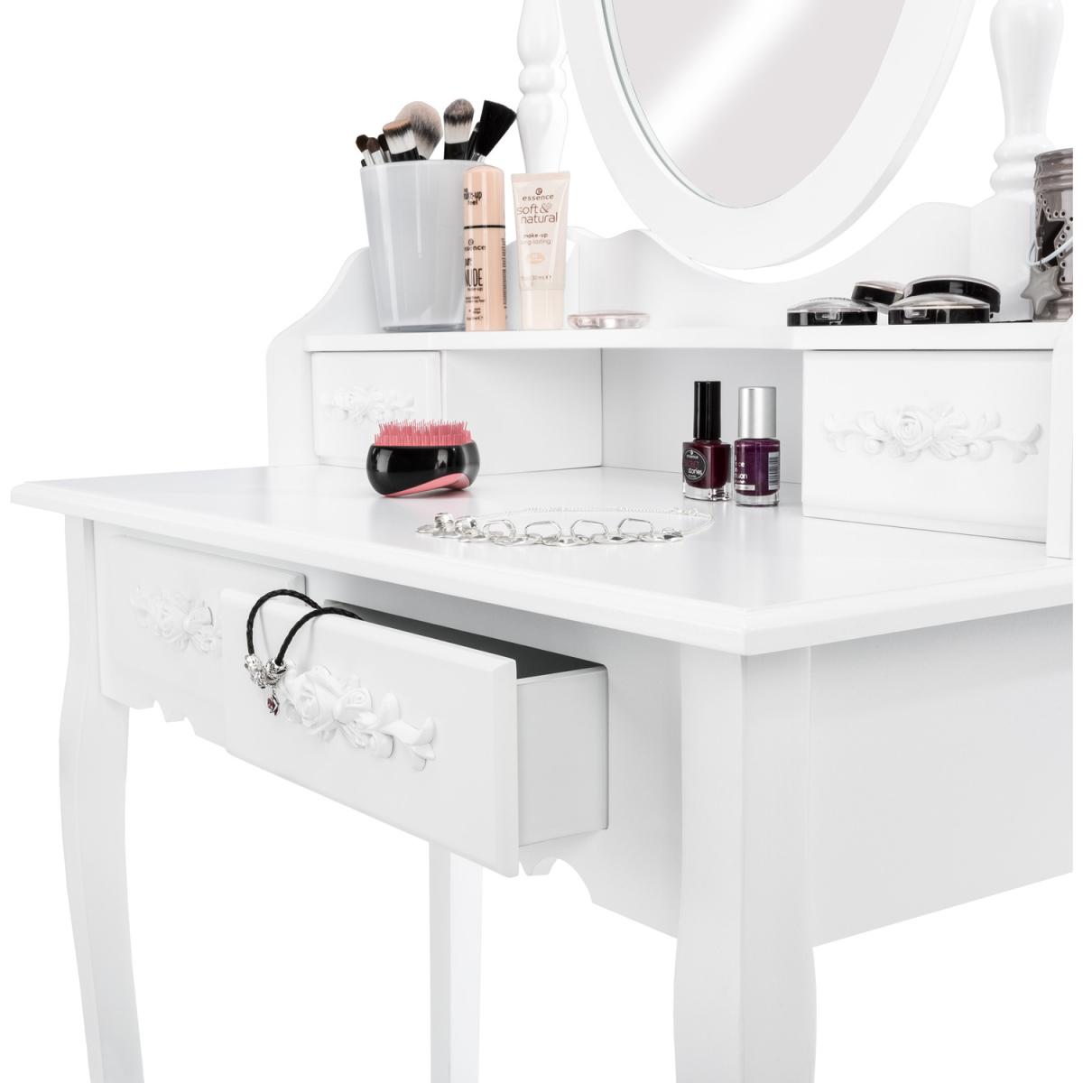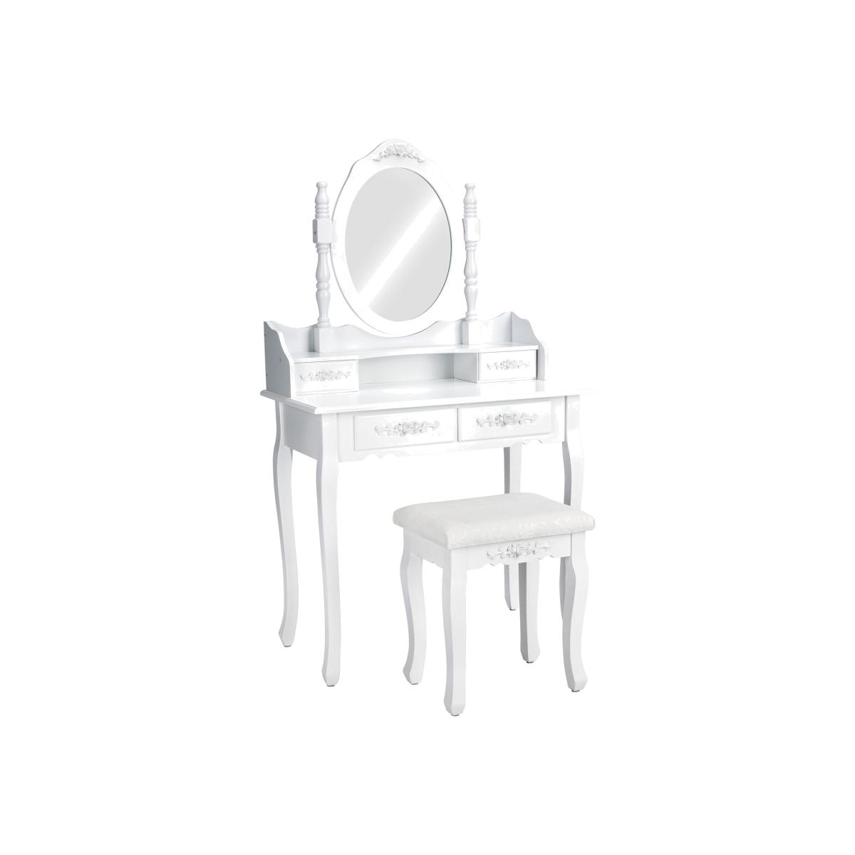 The elegant dressing table with mirror by tectake is a real gem which will add a delightful antique look to your bedroom. The dressing table table is diverse and can be used as a vanity dressing table, as a dresser or simply as a highlight in your home. In addition, the four spacious drawers provide storage for all your accessories, jewellery and personals. All drawers and the comfortable padded stool are decorated with beautiful rose ornaments that are truly eye catching. A flexible swivel oval mirror completes the look of this great dressing table. The white paint of the dressing table and stool make this duo simply perfect and enable them to fit seamlessly into any room. Whether as a make up table for your bedroom or simply a design piece in your home, get this dressing table from tectake today.