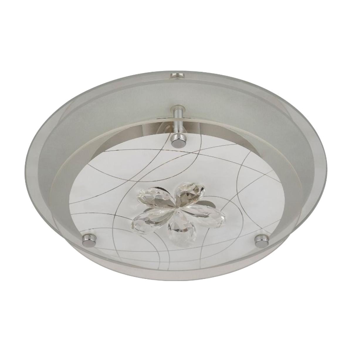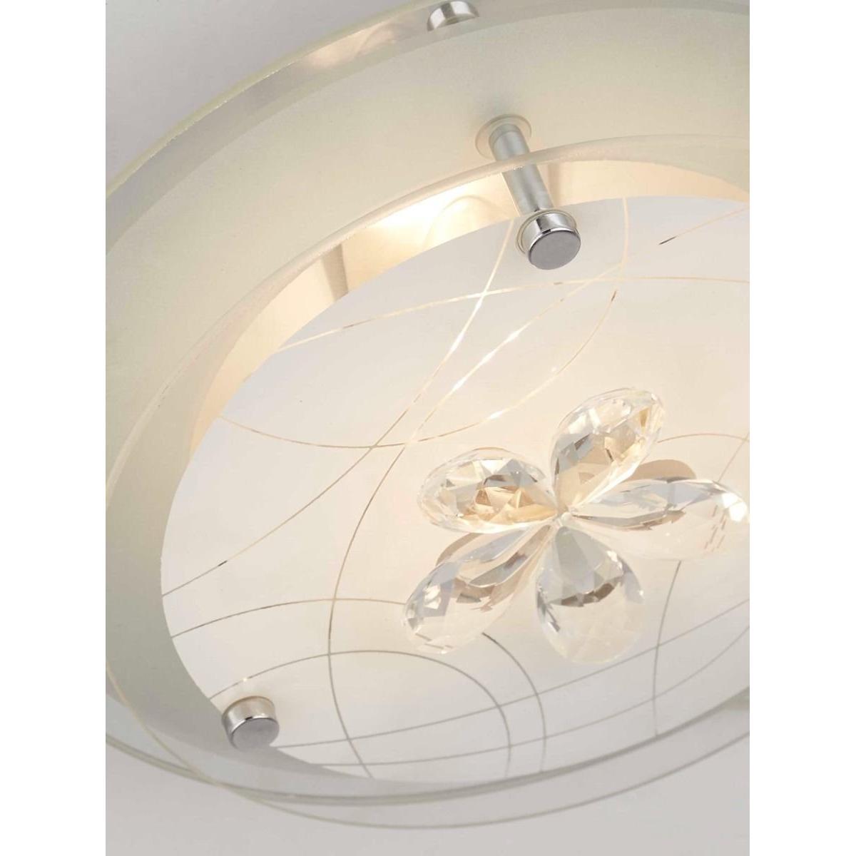 Modern flush ceiling light boasting a frosted glass and polished chrome finish. The Drew 1 Light Flush Ceiling Light is a stunning fitting exclusive to Pagazzi Lighting. The light features a mirrored glass back plate and a frosted glass diffuser which boasts a spirograph cut out pattern. The fitting is completed with faceted glass beads, creating flower shaped decorations which sparkle when lit. Style this light with one of our vast selection of LED E27 light bulbs.