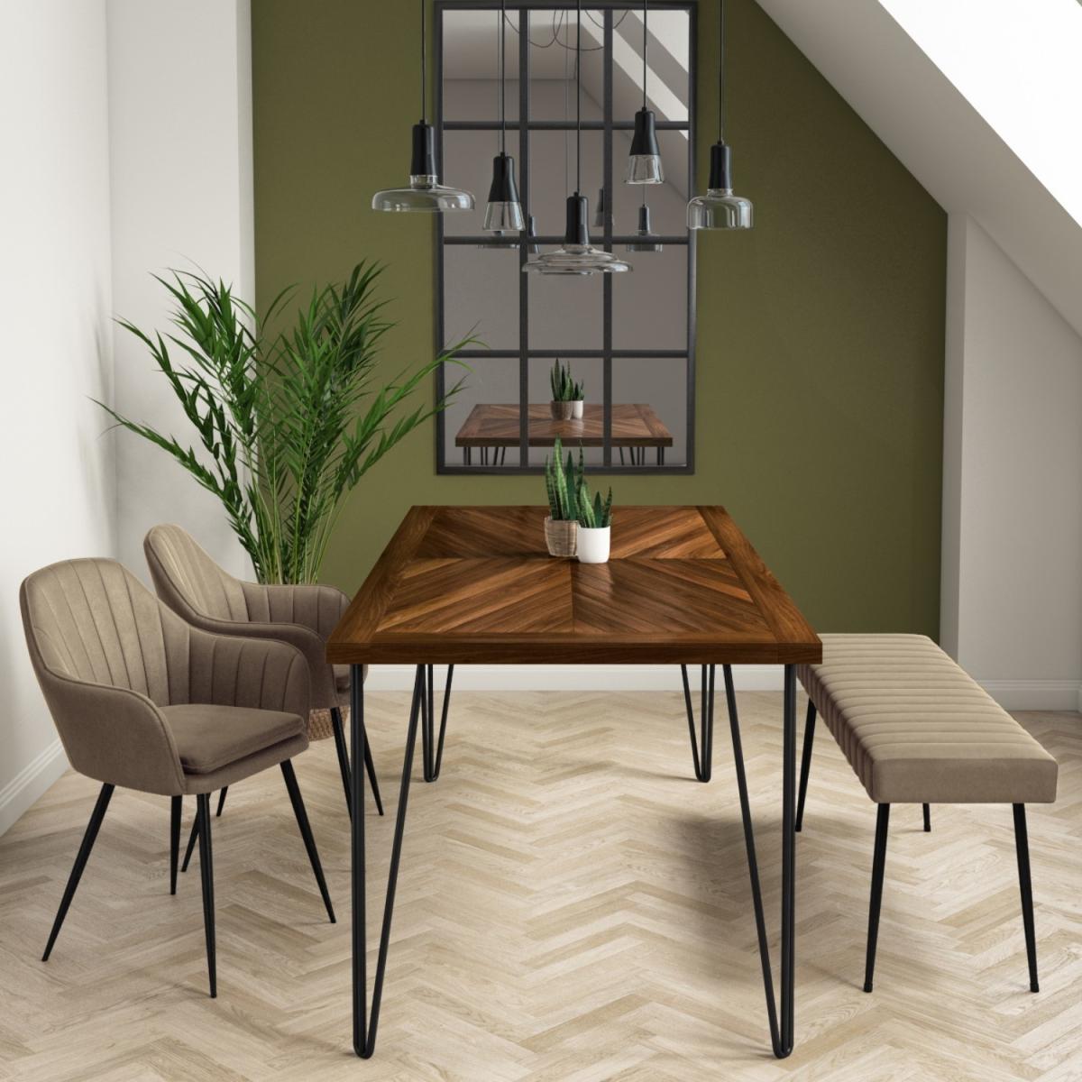 Dining Table information Create the perfect place to host with the Drew rectangular dining table. The stunning dark wood table top is perfectly complimented by the modern black metal hairpin legs. Dining Chair information With an on trend design, the styling is effortless. They feature curved chair backs with stunning black metal chair legs. Finished inbeige faux leatherand black legs, the two tone design brings a fresh look to your space with a modern touch. The dining chairs are highly durable and hardwearing, they'll easily withstanding the test of time in a busy family dining room. Dining Bench information Perfect for the dining room, hallway or bedroom, this Logan bench is a stunning addition to the home. Upholstered in beautiful beige faux leather with contemporary vertical stitching, it'll add a touch of class and sophistication to any room while also being comfortable enough to sit for longer periods of time. Smooth black metal legs round off what is a timeless design.