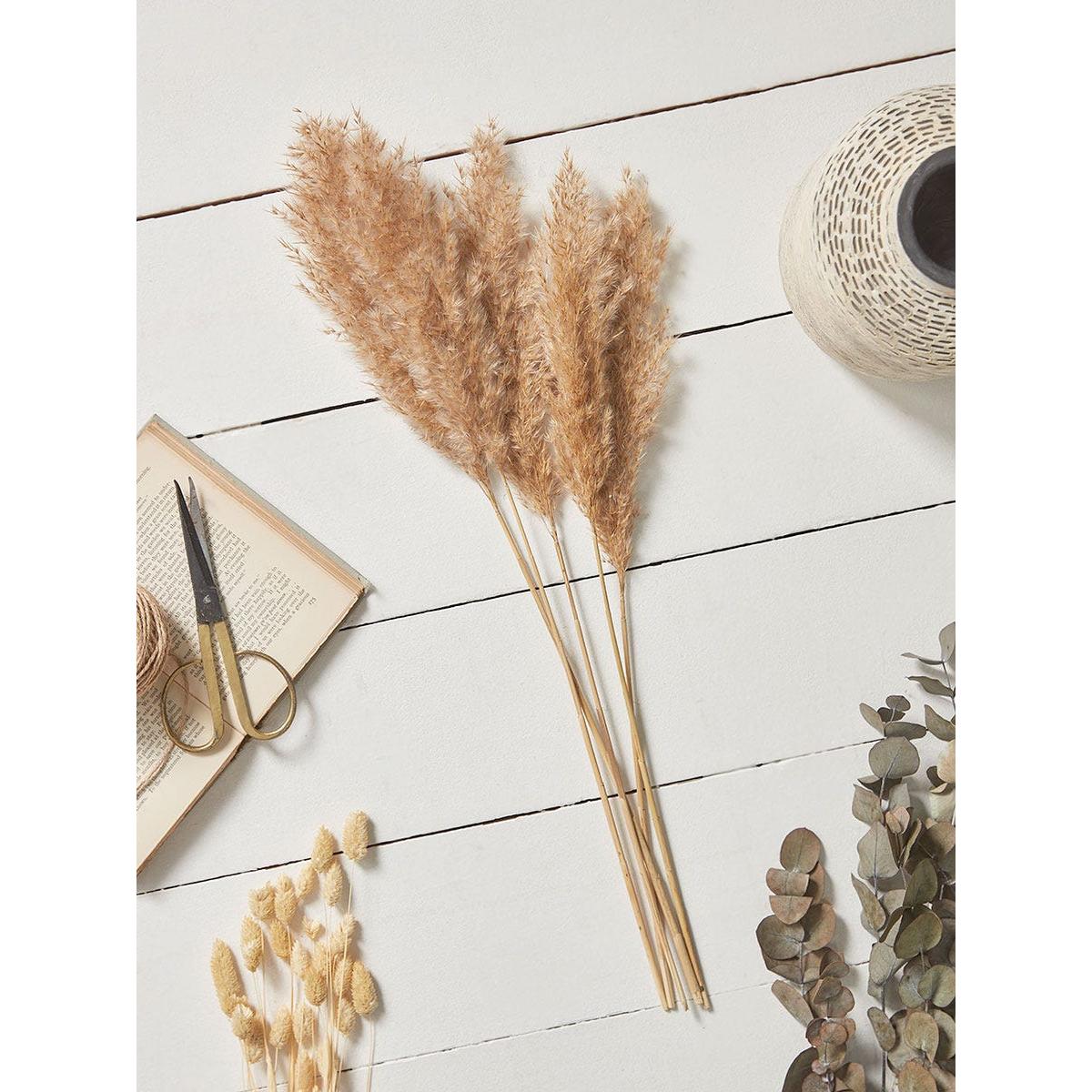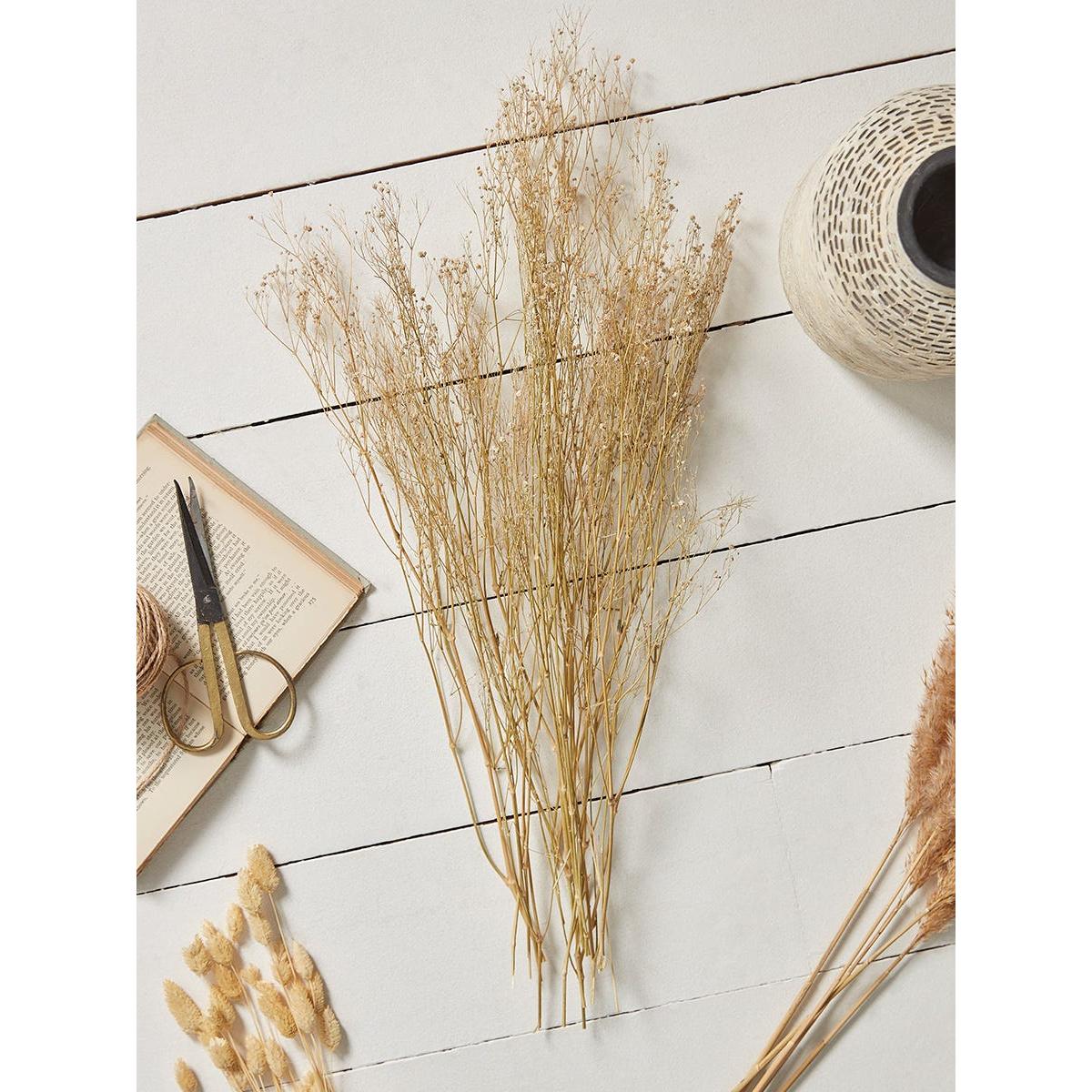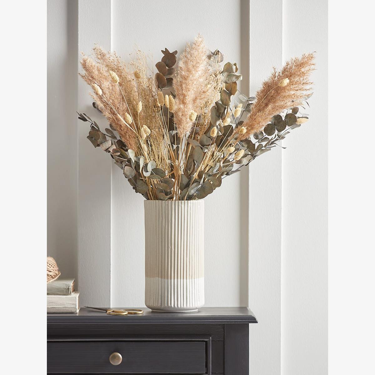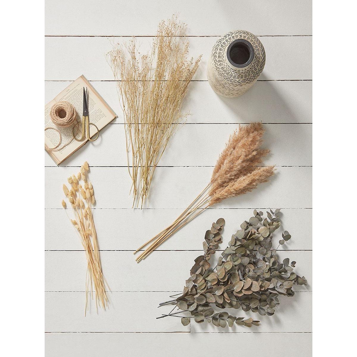 A varied bouquet of dried flowers and grasses, centred around stems of dried eucalyptus, with contrasting bunny tail grasses, gypsophila and pampas. Add to your favourite vase for an enduring and stylish display.