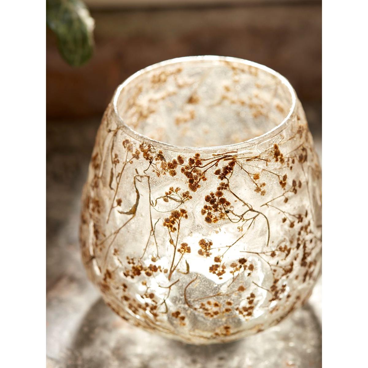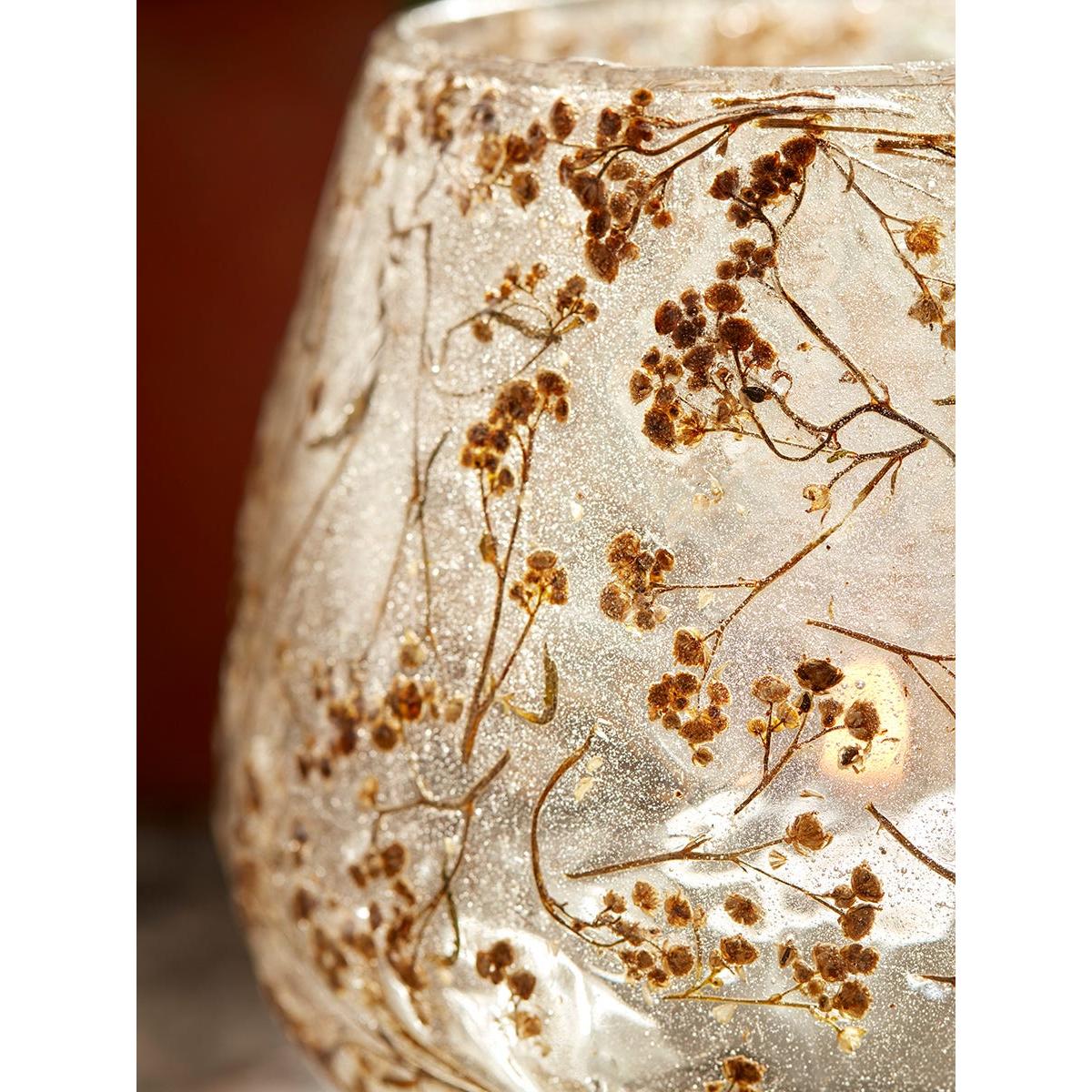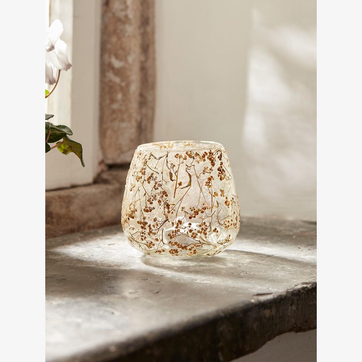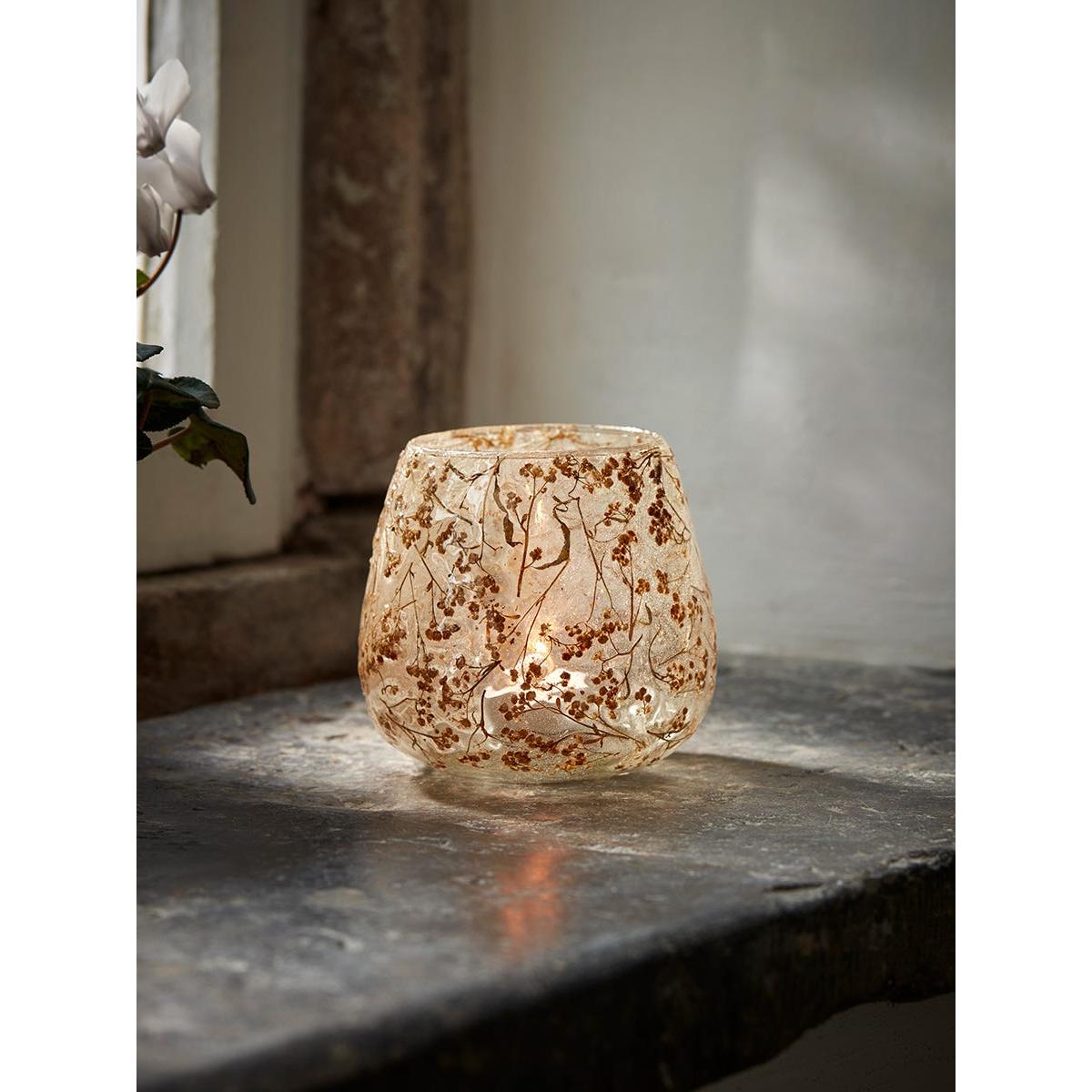 Fill your home with the gentle glow of candle light with our dried flower tealight holder. Sweet and delicate dried flowers surround the glass tealight holder invitng a fresh feeling, whilst their amber tone provides a warm glow to your space for a pretty and quaint finishing touch to your home.
