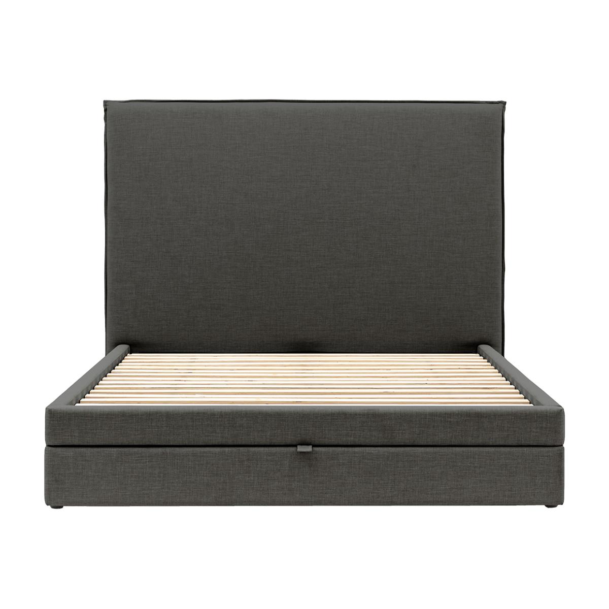 I’m a fan of this smoke-upholstered king bed for its clean, squared-off lines and deep neutral tone - it anchors both minimalist and Scandi-inspired bedrooms without fuss. The low profile and simple frame make it easy to pair with pared-back bedding in muted greys or soft pastels, while the slight texture of the fabric adds a hint of warmth. For styling, layer in crisp white sheets and a chunky wool throw to break up the dark upholstery, then top with a mix of velvet and linen cushions in complementary hues. Slot in matching streamlined bedside tables and wall-mounted reading lights to keep floor space clear, and use the built-in drawer (or under-bed storage boxes) to stow away extra quilts and pillows.