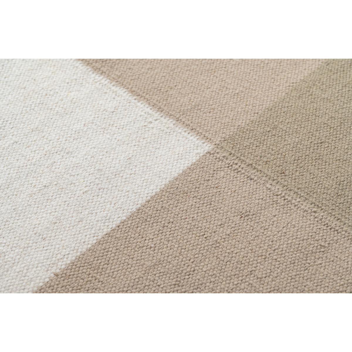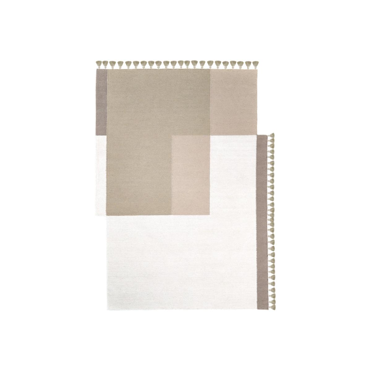 A graphic contemporary rug featuring a flat-woven colour block design and decorative tassels. Hand-woven 100% wool. Wool rugs shed fibres during vacuum cleaning and everyday use; this is not a fault but a natural characteristic. Please use only a suction-type vacuum cleaner, as rotating brush vacuum cleaning may damage the rug. Spills should be cleaned immediately to help avoid staining – use a clean white absorbent cloth to dab the spillage, and avoid scrubbing.