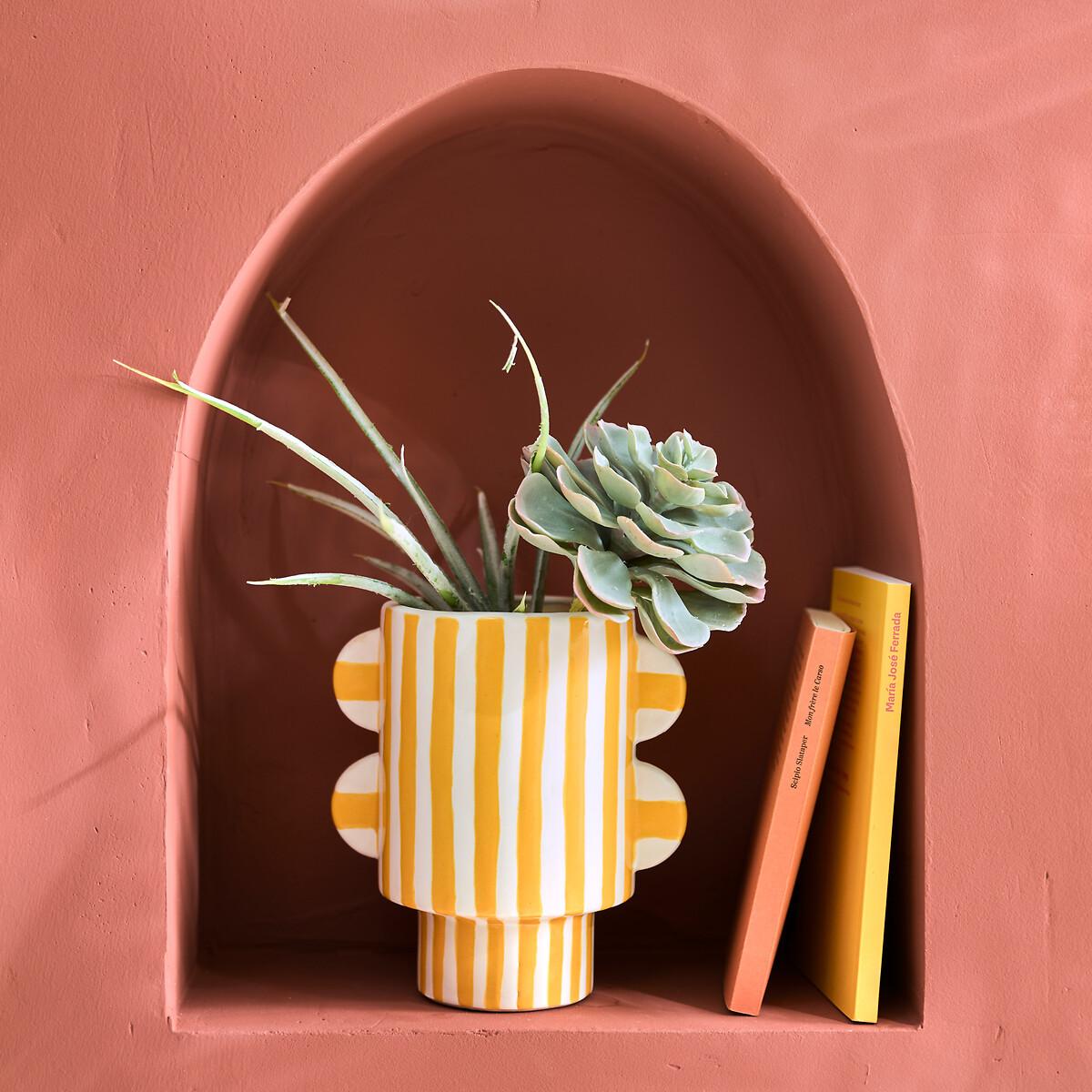 I love this vase for its playful yet sophisticated design - the bold yellow stripes and rounded handles give it a contemporary feel that works well in modern or eclectic interiors. It’s versatile enough to sit on a shelf or as a centrepiece on a dining table, with fresh or dried flowers to add colour and texture. The height makes it ideal for statement displays, and its earthenware finish adds warmth, making it suitable for both cosy and more open, minimalist spaces. For styling tips, try pairing it with neutral tones or contrasting colours to make the yellow pop, and consider using it with other textured ceramics for a curated, layered look.