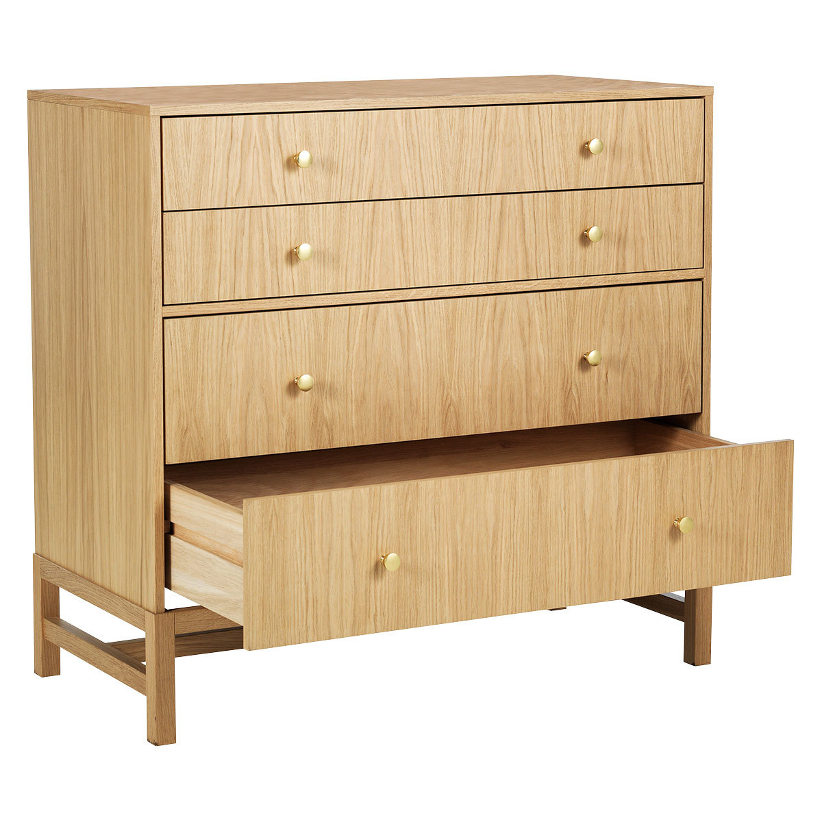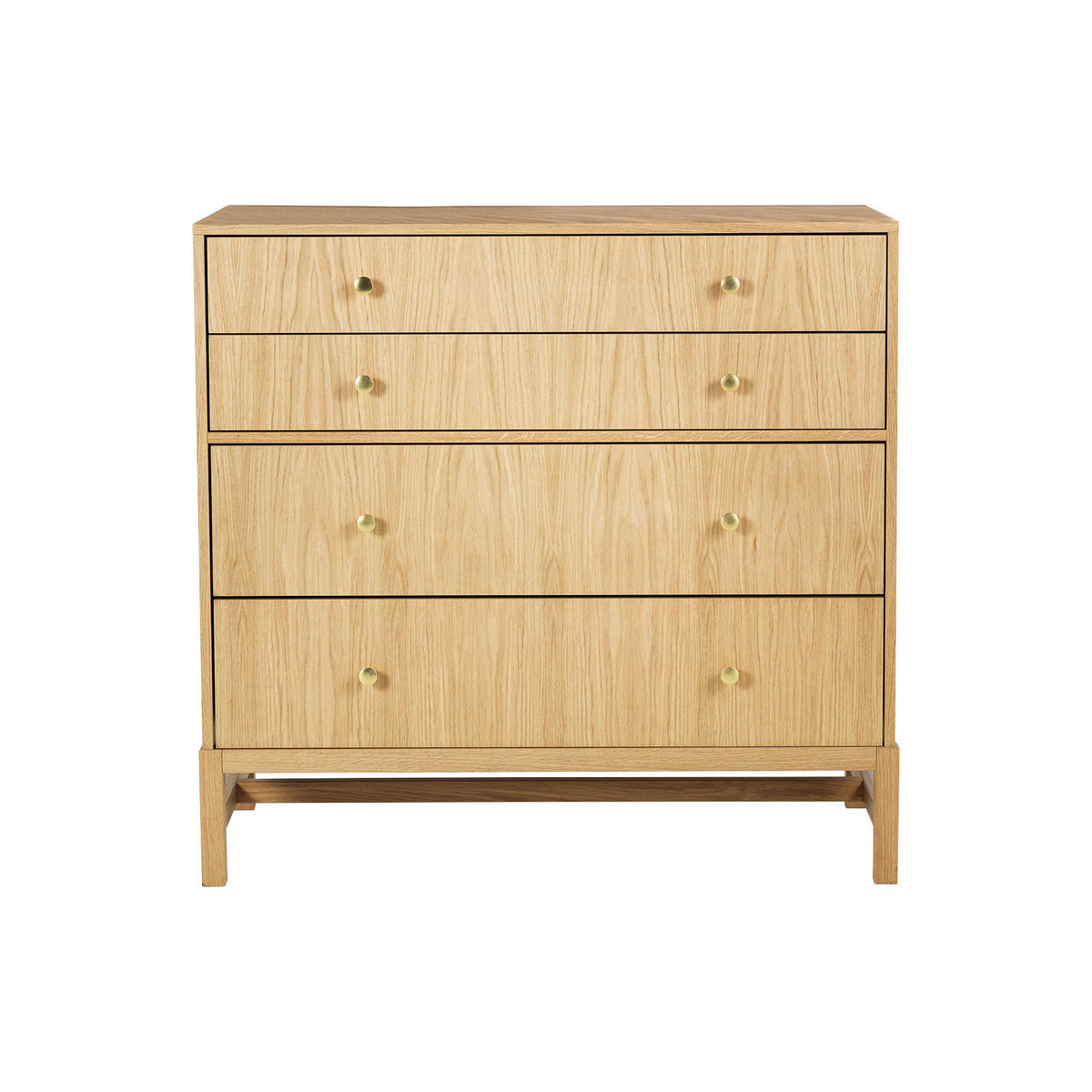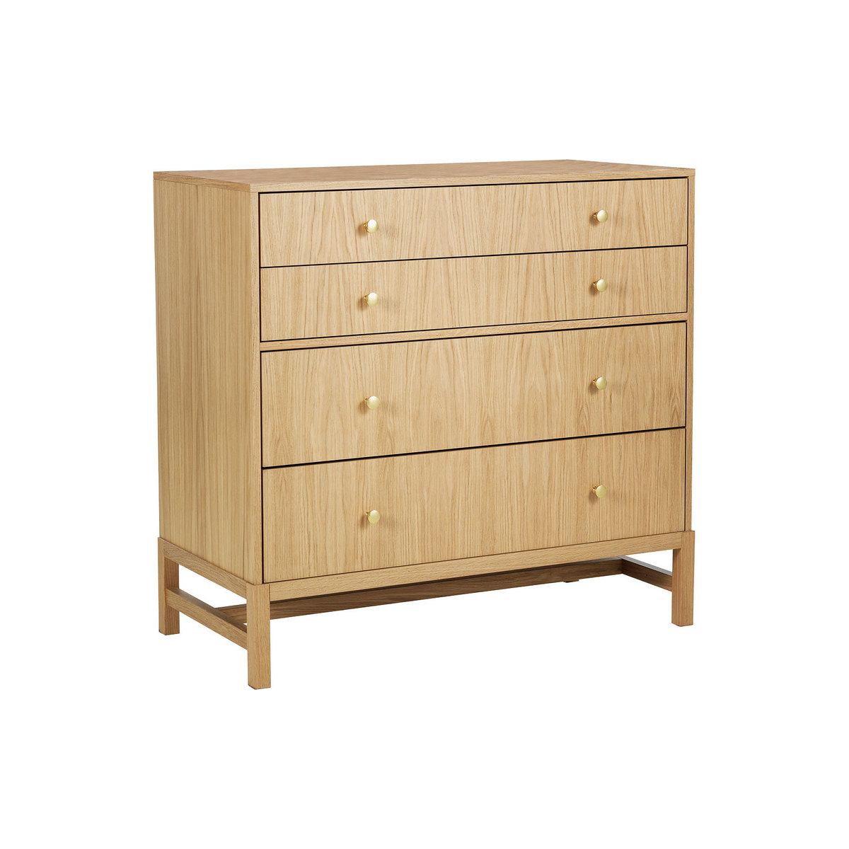 The Drio oak wide 4 drawer chest with brass knobs is a contemporary design, raised on a solid oak frame that adds a lightness to the piece. The chest has 2 shallow and 2 deep drawers and the oak veneer used on the drawer fronts is carefully matched to showcase the wood's beautiful grain, its brushed brass knobs add a subtle, glamorous finishing touch. Made in Europe and exclusive to Habitat, the chest is part of the extensive Drio range and is protected by an ecologically friendly, water-based, clear lacquer.