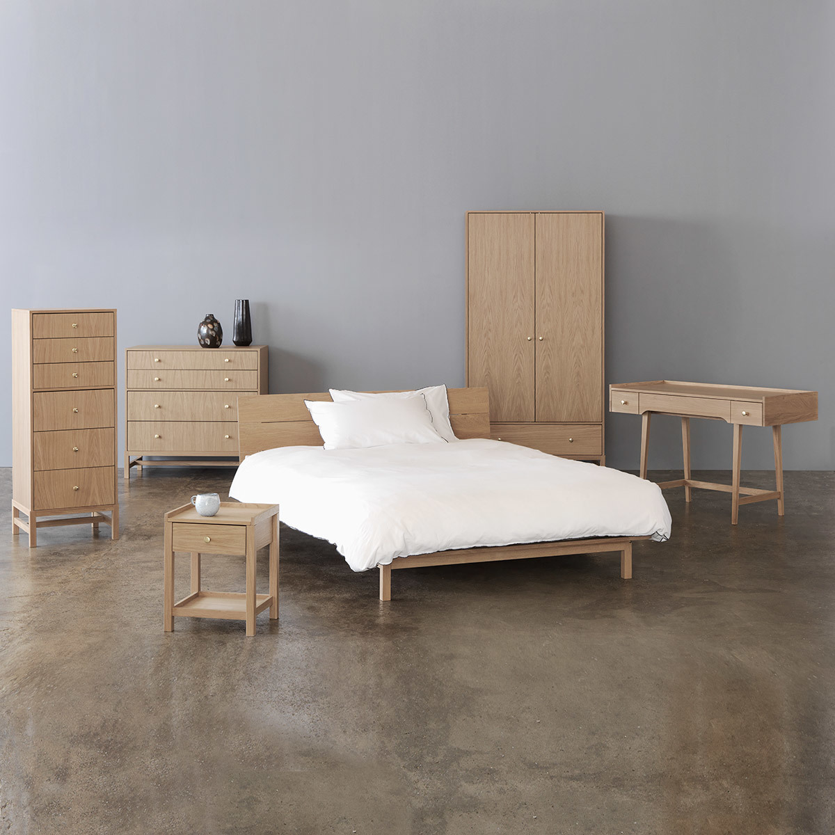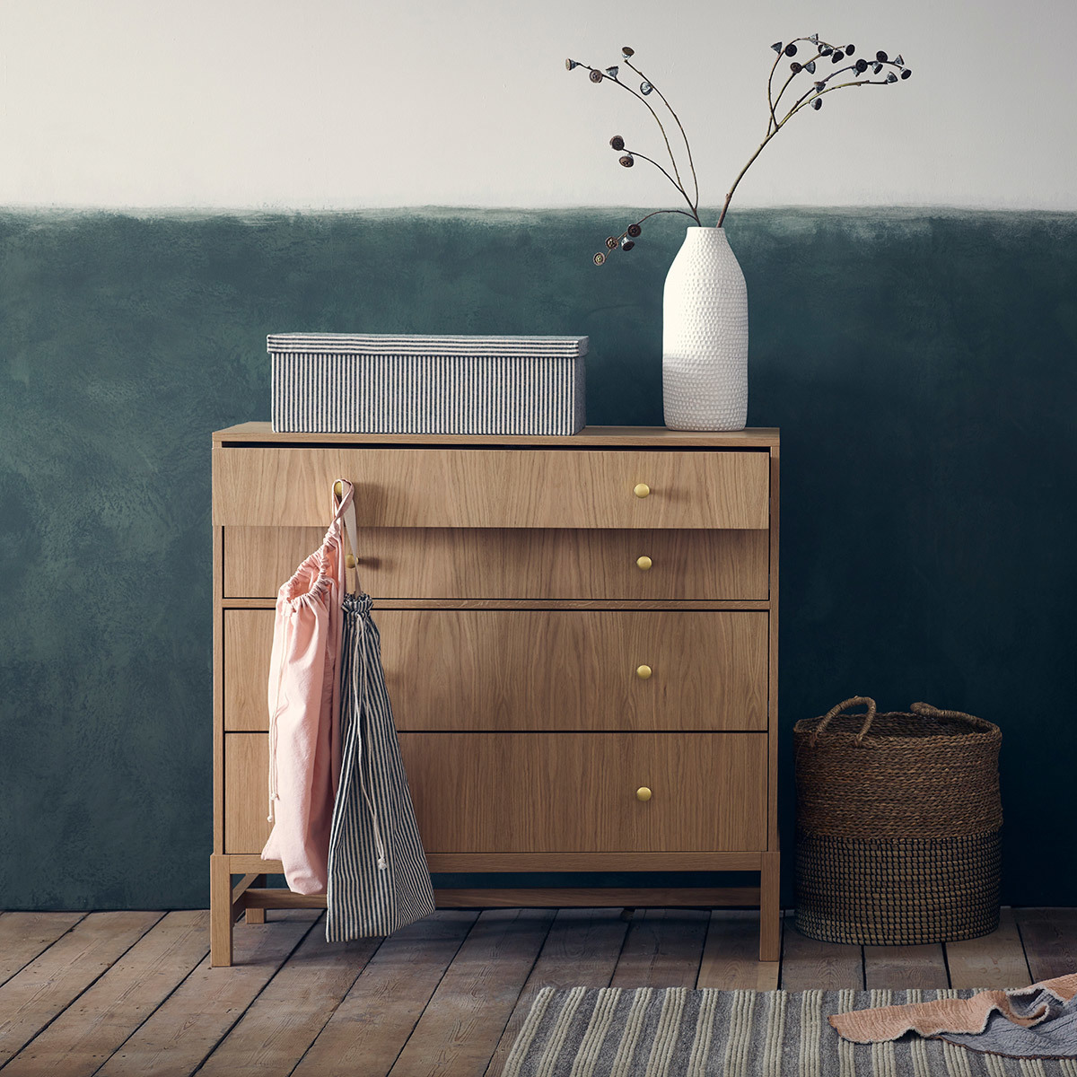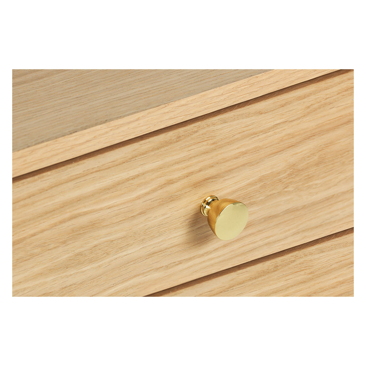 The Drio oak wide 4 drawer chest with brass knobs is a contemporary design, raised on a solid oak frame that adds a lightness to the piece. The chest has 2 shallow and 2 deep drawers and the oak veneer used on the drawer fronts is carefully matched to showcase the wood's beautiful grain, its brushed brass knobs add a subtle, glamorous finishing touch. Made in Europe and exclusive to Habitat, the chest is part of the extensive Drio range and is protected by an ecologically friendly, water-based, clear lacquer.