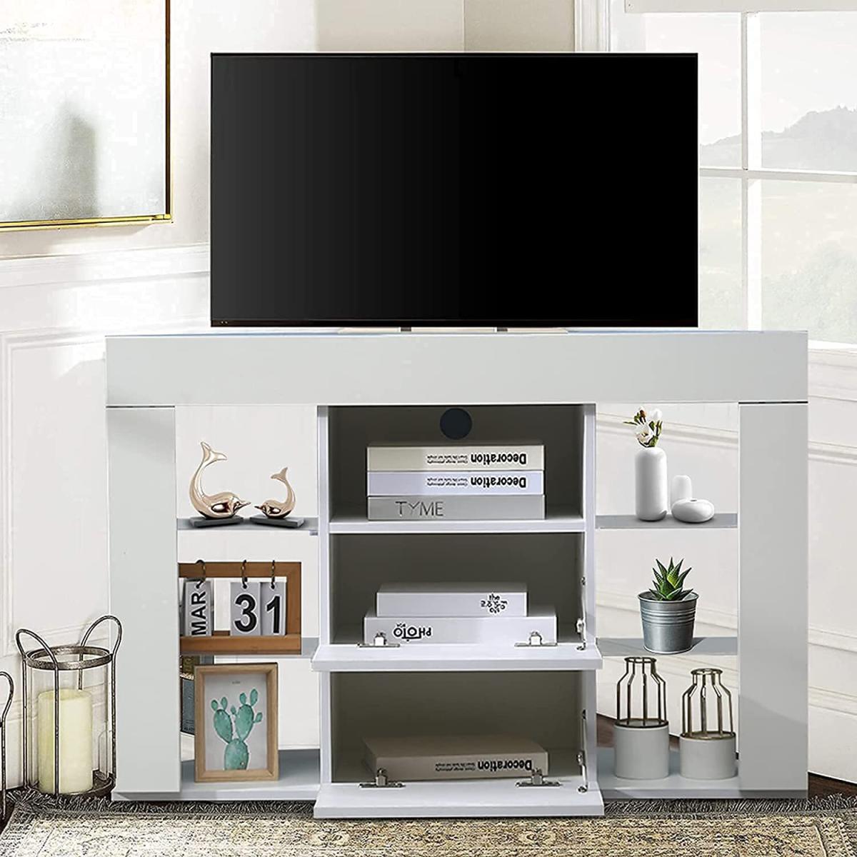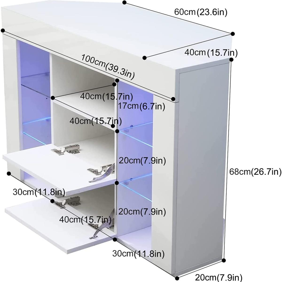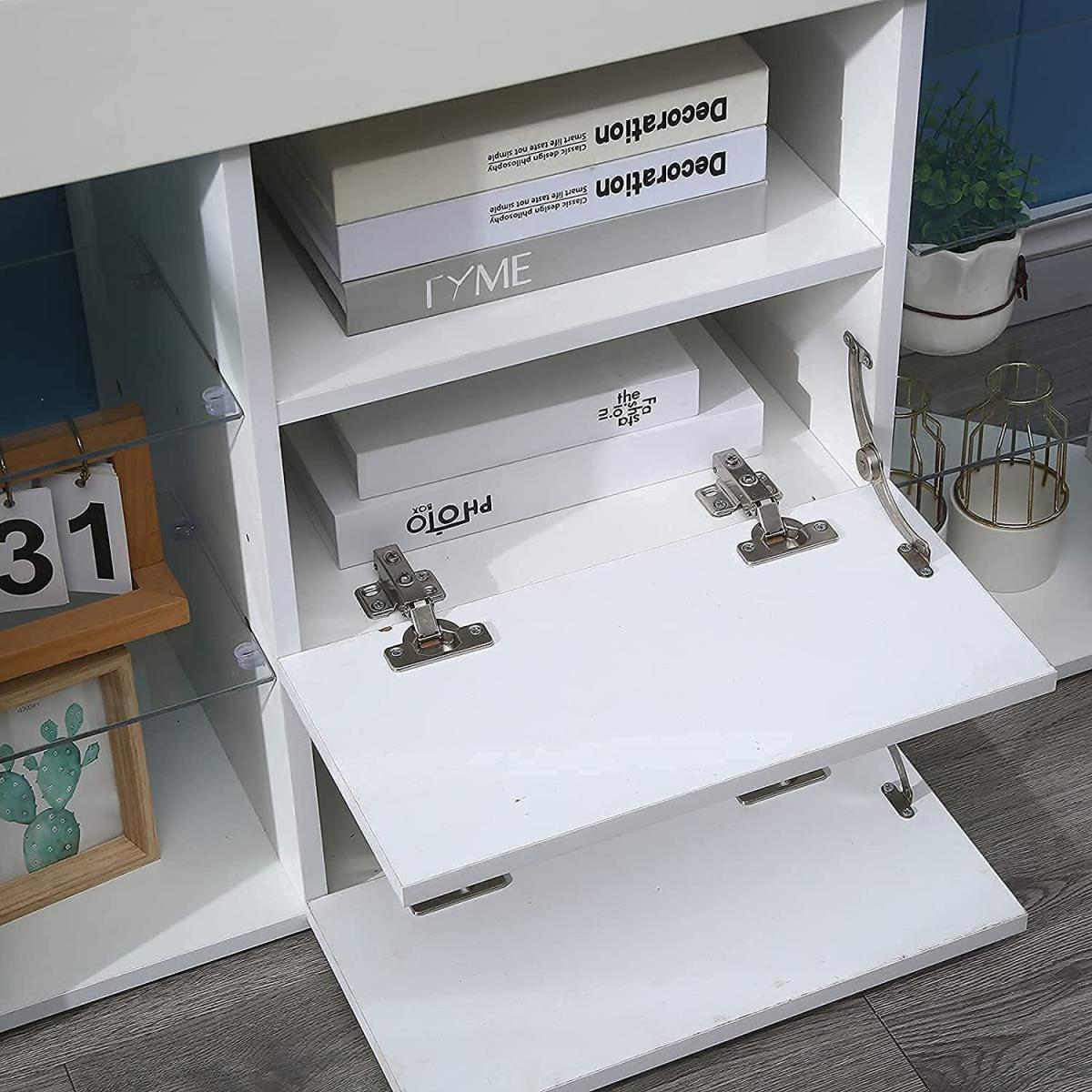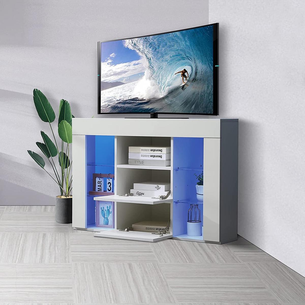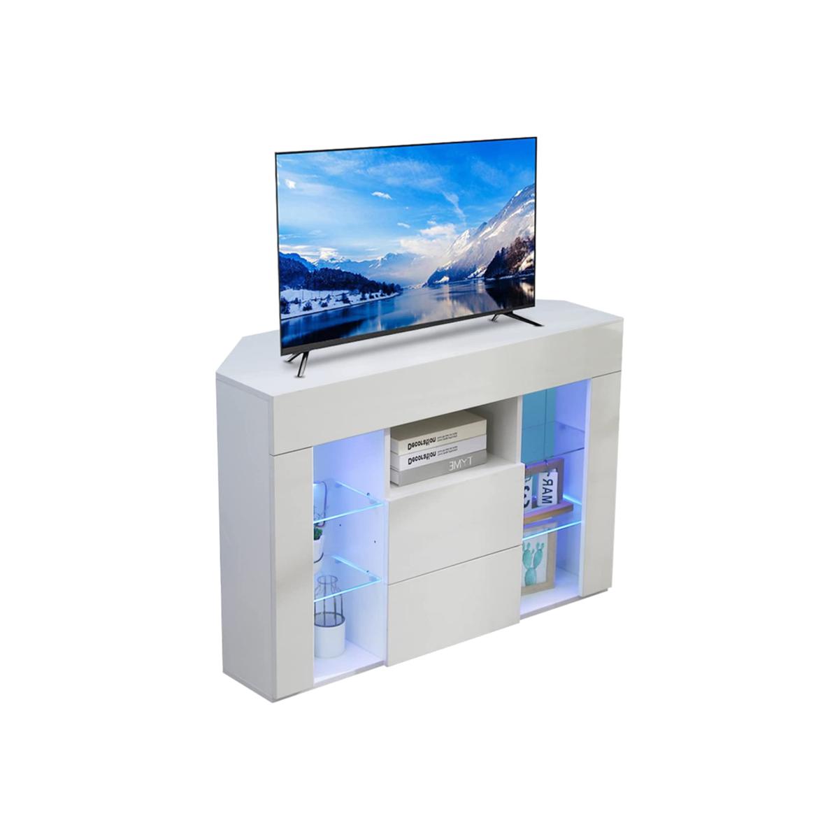 Dripex Corner TV Unit, Stable construction & high gloss front, This TV stand for TVs up to 50". This is a flat-pack piece of furniture, all hardware and instruction are provided, self-assembling is required. Suits most TVs, such as LCD, Flat, 3. D, LED TVs etc. Blue LED lights strip are included, powered by USB. Designed to wrap into any corner the Dripex has matching smooth curved edges for creating a contemporary minimalistic look.