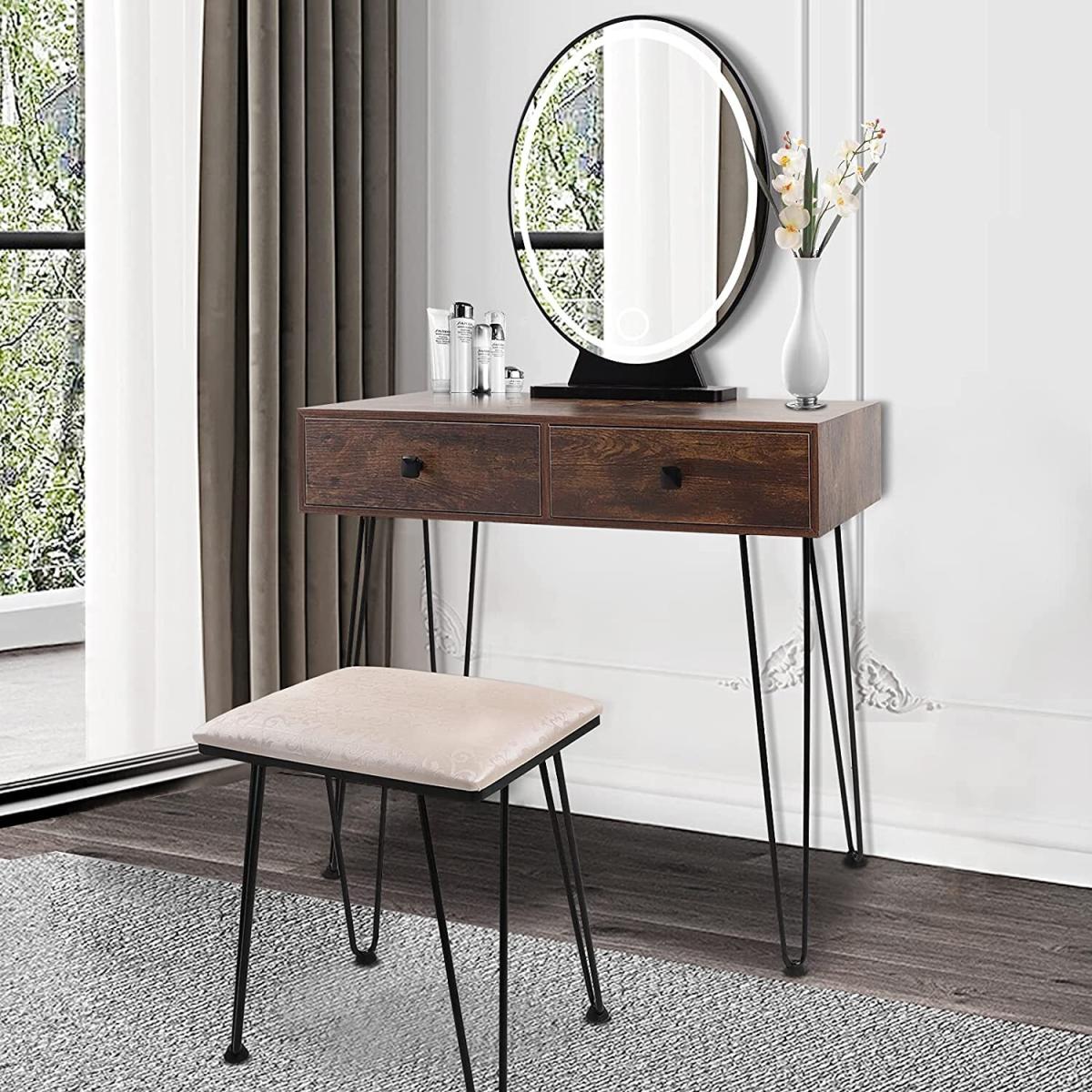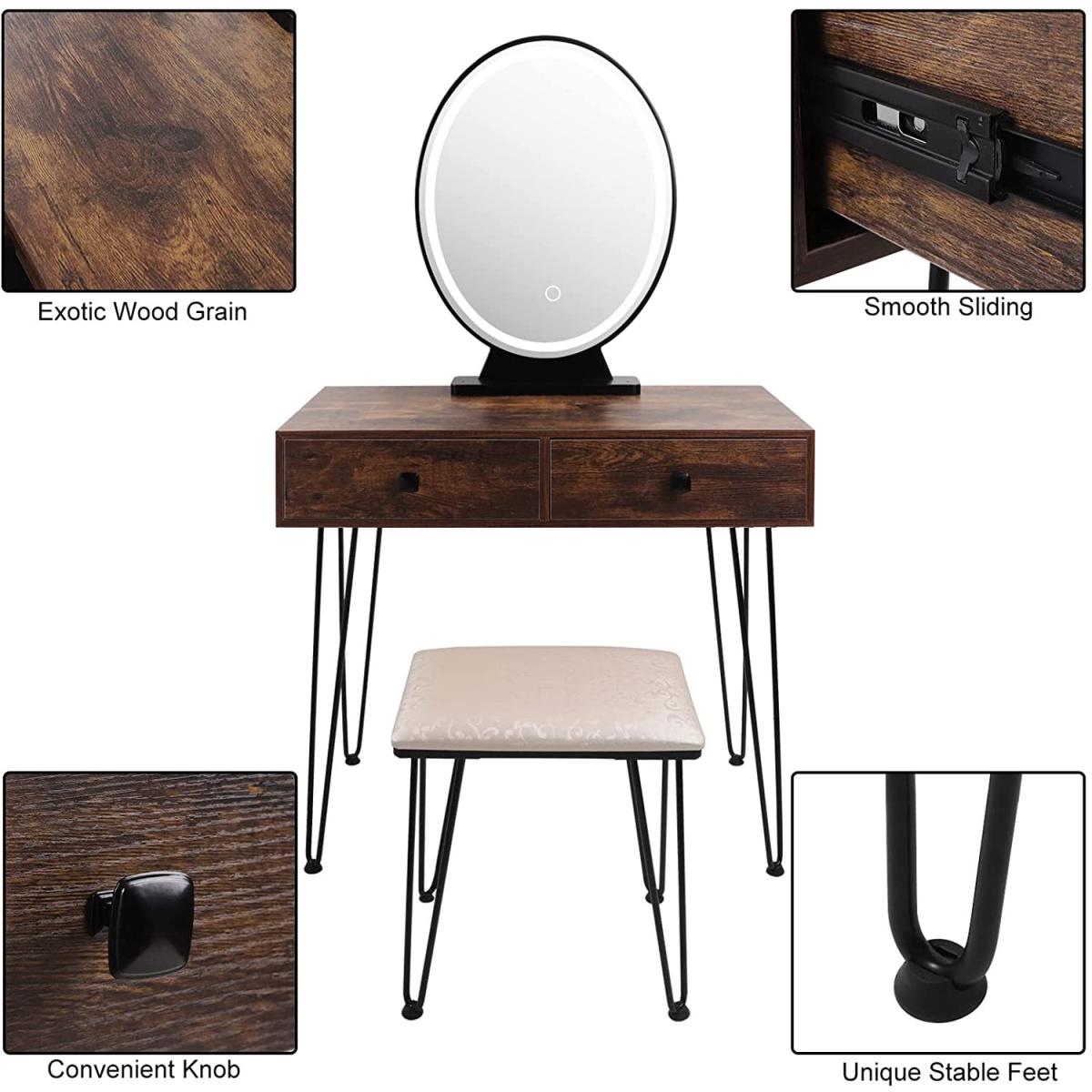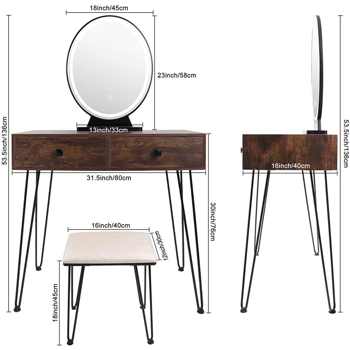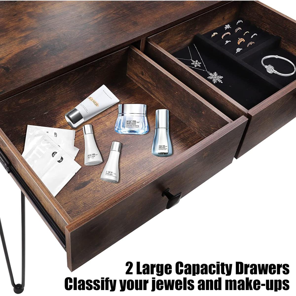 The mirror is equipped with LED light, which enables you to do makeup in the bright. There are 3 modes available for you to switch nature , warm & cold light. Long press to adjust the brightness(from faded to brighter). Different lights illuminate your different beauty. The vanity table comes with 2 large drawers, which provides enough storage space for cosmetics, jewellery, necklaces, ring, earrings, bracelets and other small items. The seat cushion filled with the high elastic sponge , the carved & hollow design makes it look very elegant.